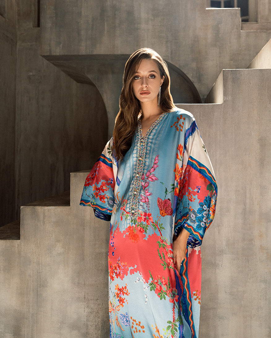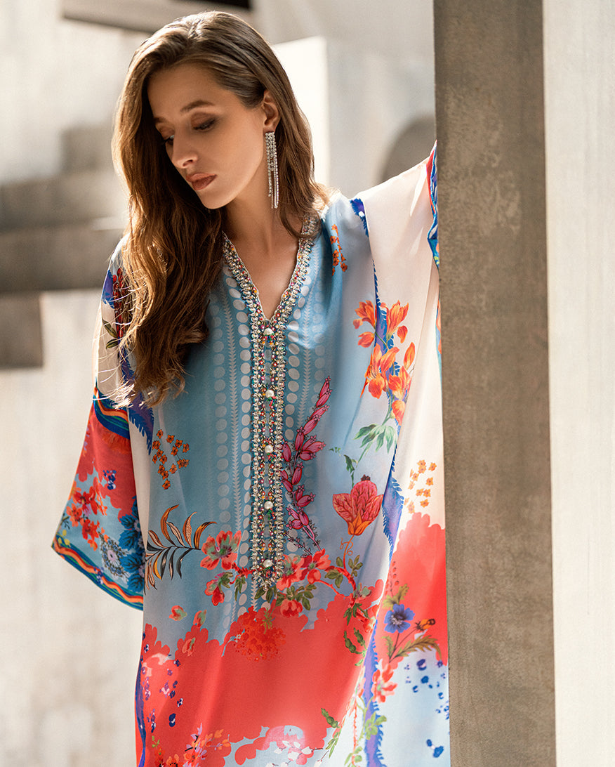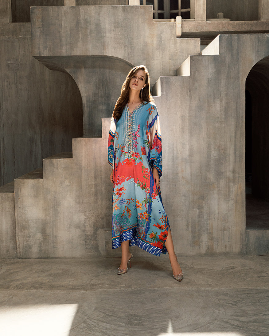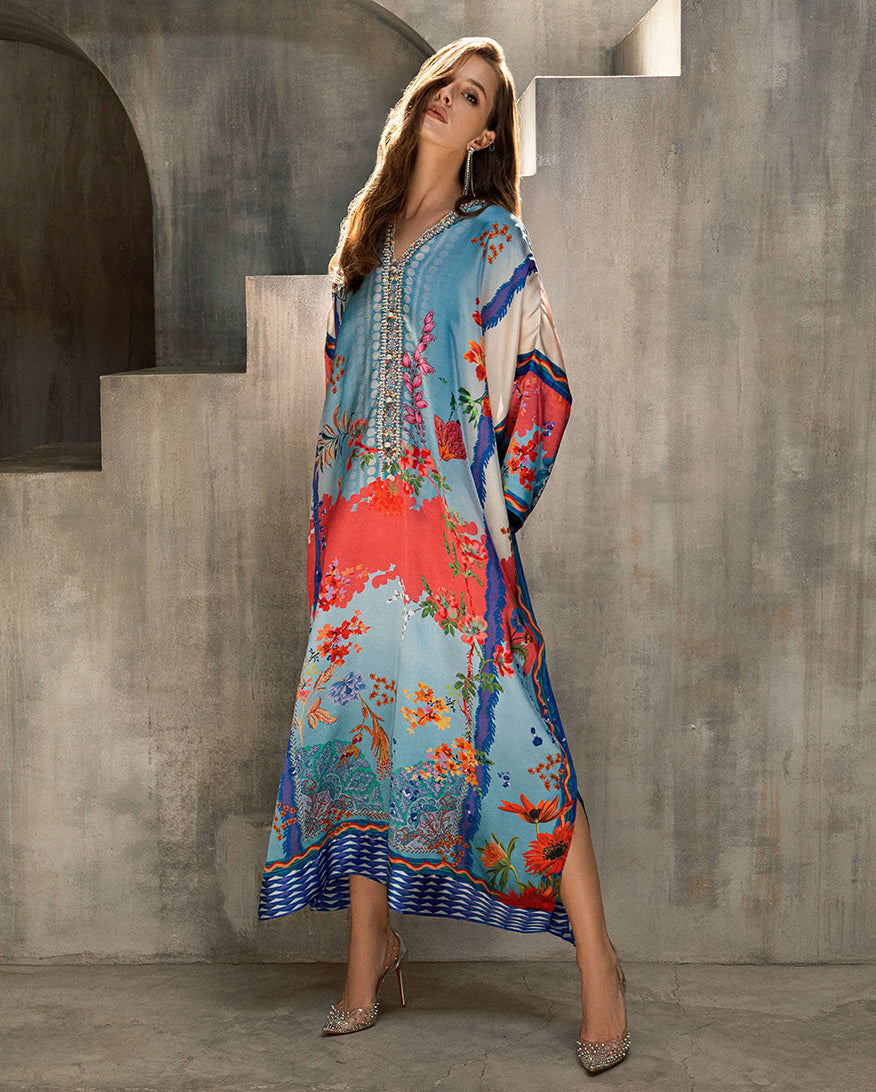 Elevate your wardrobe with our exquisite Sharmose Silk Kaftans, designed for effortless grace and timeless charm. Each piece showcases striking prints and features a luxuriously hand-embellished neckline, making it the perfect fusion of elegance and comfort.