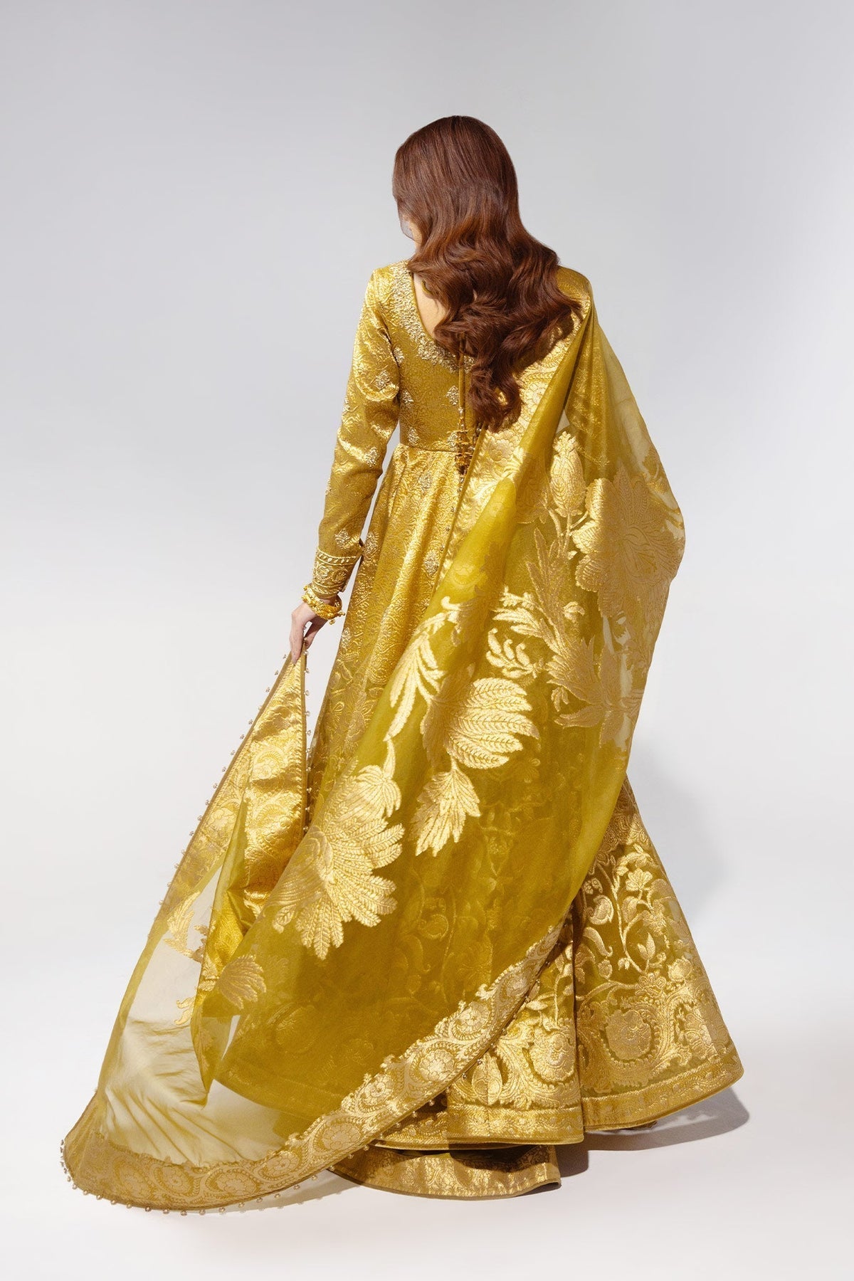 Transform into a queen of gilded splendor with this majestic 14-panel pishwas. Shimmering floral jacquard dances in the light, each panel adorned with cascading zardozi embellishments that kiss the bodice and sleeves. Luxurious golden velvet graces the neckline, front and back, adding a touch of regal elegance. Flared pk silk pants whisper with a jacquard border at the hem, while a golden floral jacquard dupatta woven with shimmering zari drapes like a whispered promise of forever. This ensemble is a symphony of sunlit splendor, ready to paint your wedding day in unforgettable hues of gold.