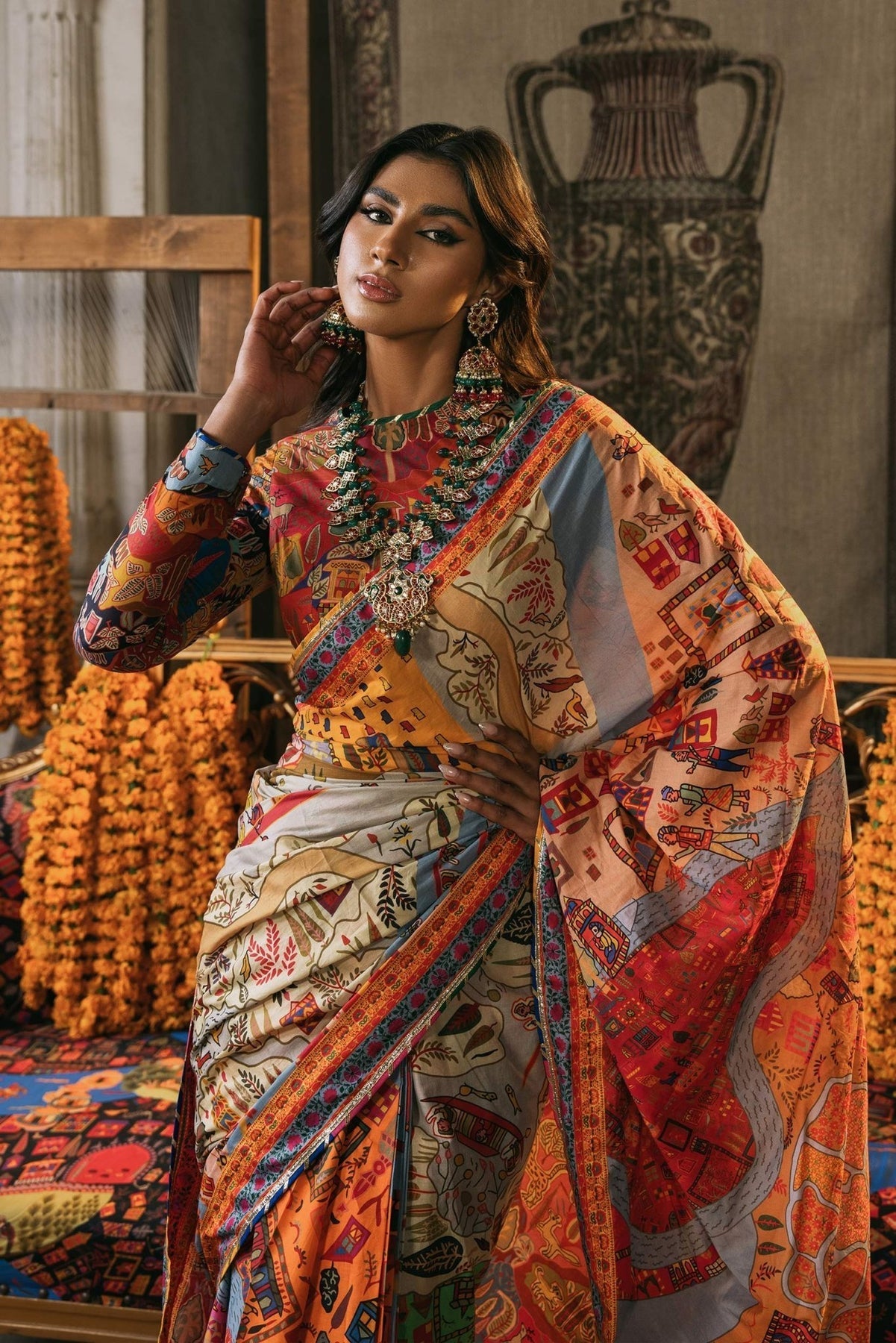 Elevate your style with our Crew Neck Saree, a perfect blend of sophistication and elegance. The blouse, crafted from premium digitally printed lawn fabric, features a classic crew neckline and full sleeves adorned with delicate chatta pati lace. Complementing the look is a matching lawn petticoat, creating a seamless and graceful ensemble.
