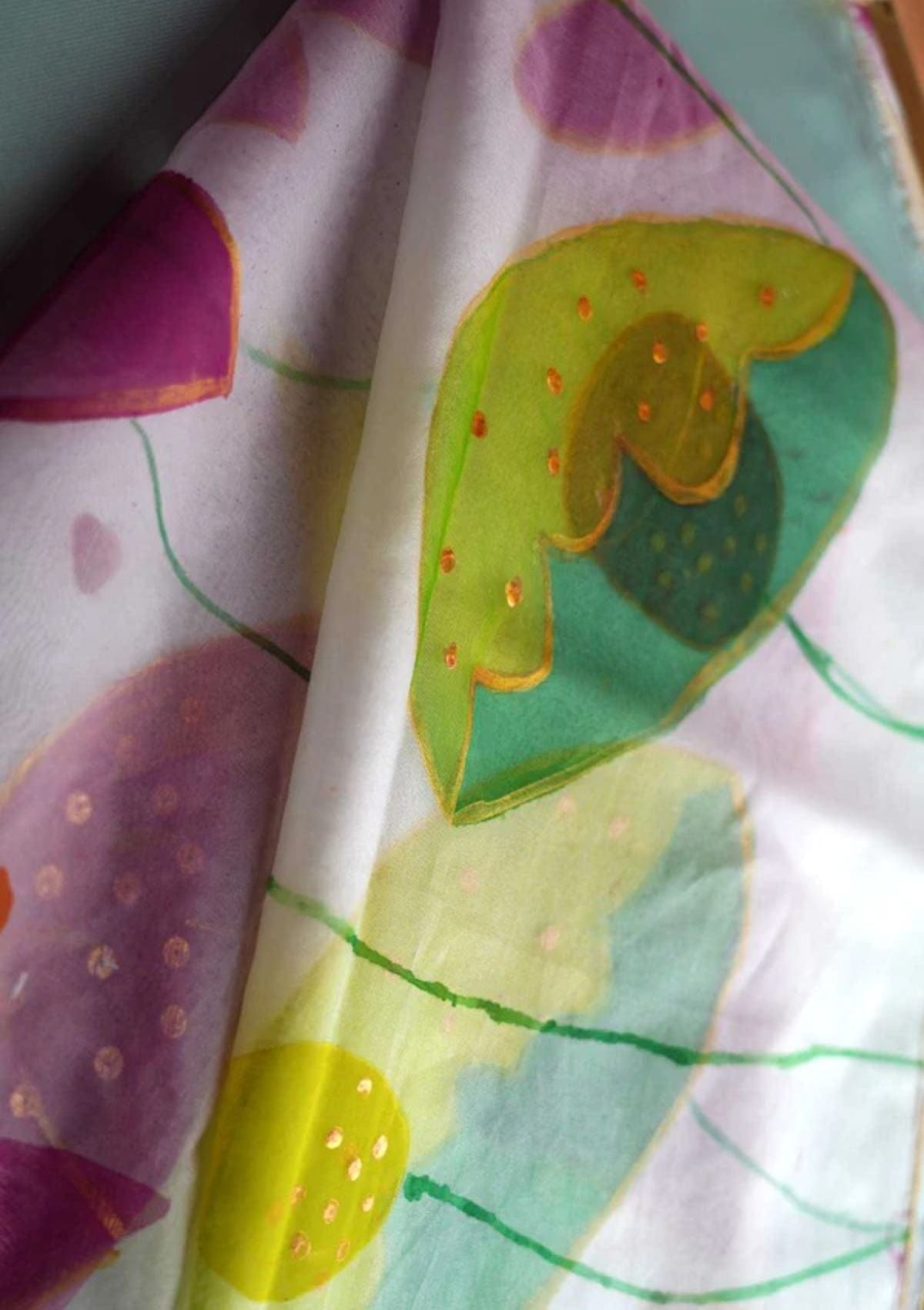 This pretty hand-painted organza dupatta draws inspiration from the serene beauty of tulip flowers. With pink, green, and yellow taking center stage, the dupatta boasts meticulous craftsmanship evoking an aesthetic charm.