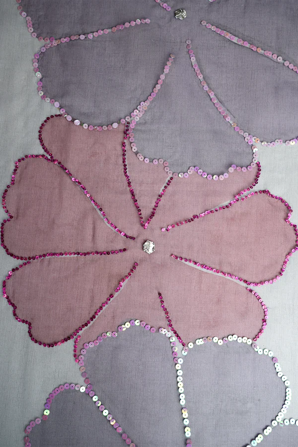 Introducing the Radiant Dusk Dupatta, a masterpiece of elegance and color. This organza dupatta features three captivating shades: regal purple, vibrant fuchsia pink, and light pink. These colors harmoniously blend to create a stunning contrast that's sure to turn heads. The enchanting dusk color palette is a testament to refined elegance. The outer border of the dupatta is adorned with intricate golden samosa lace which adds a touch of opulence and frames the colors beautifully. The golden ribbons elegantly separate each shade, creating a structured look while allowing each color to radiate its unique beauty.