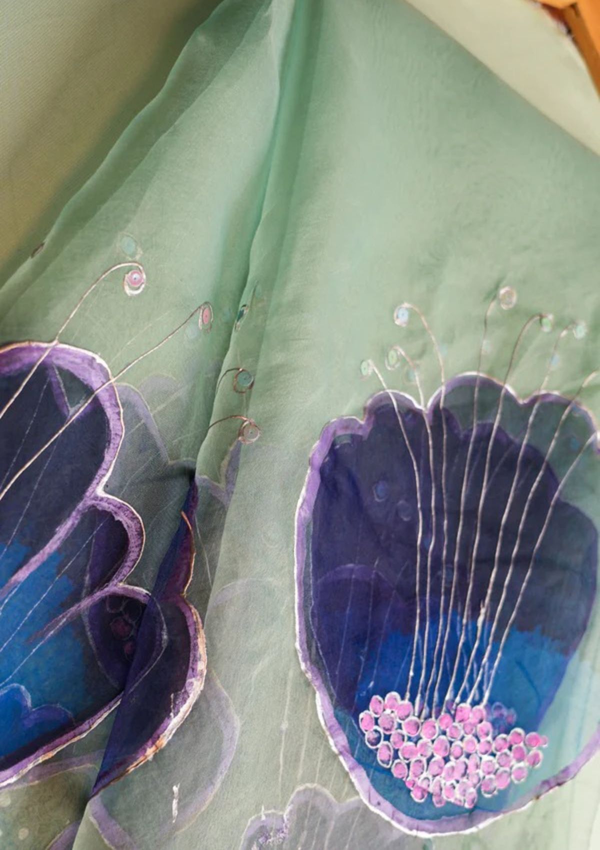 This exquisite purple handpainted dupatta is crafted with meticulous artistry and creativity. Made from light green organza, the dupatta is a harmonious blend of elegance and grace. Each purple flower is lovingly handpainted using high-quality fabric paint, bringing a sense of natural beauty to life. The delicate outlining with silver paint adds a touch of sophistication, while sequins are carefully embellished to infuse the dupatta with sparkle and ornamentation. Wrap yourself in the sheer magnificence of this handcrafted masterpiece and let your style blossom.