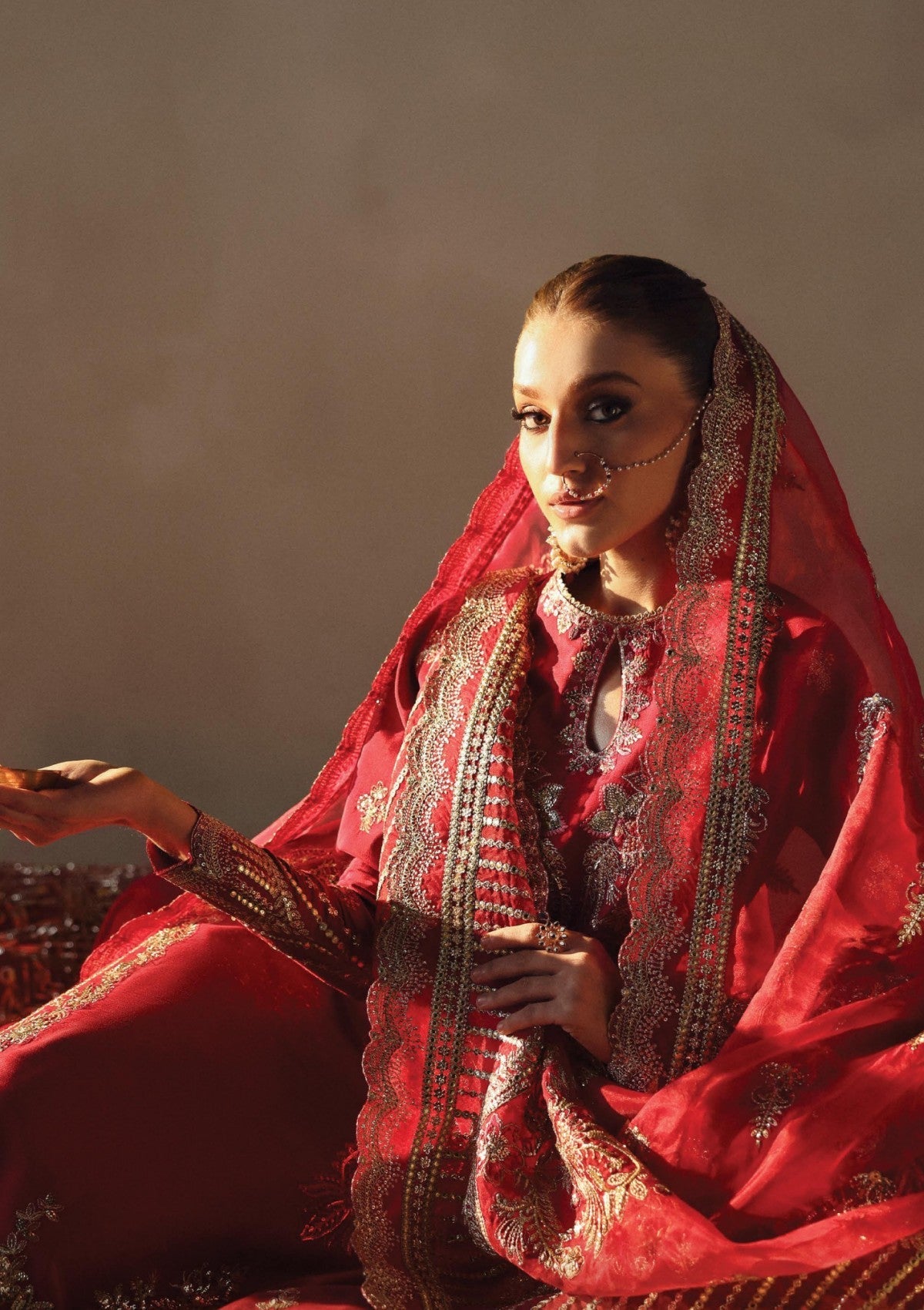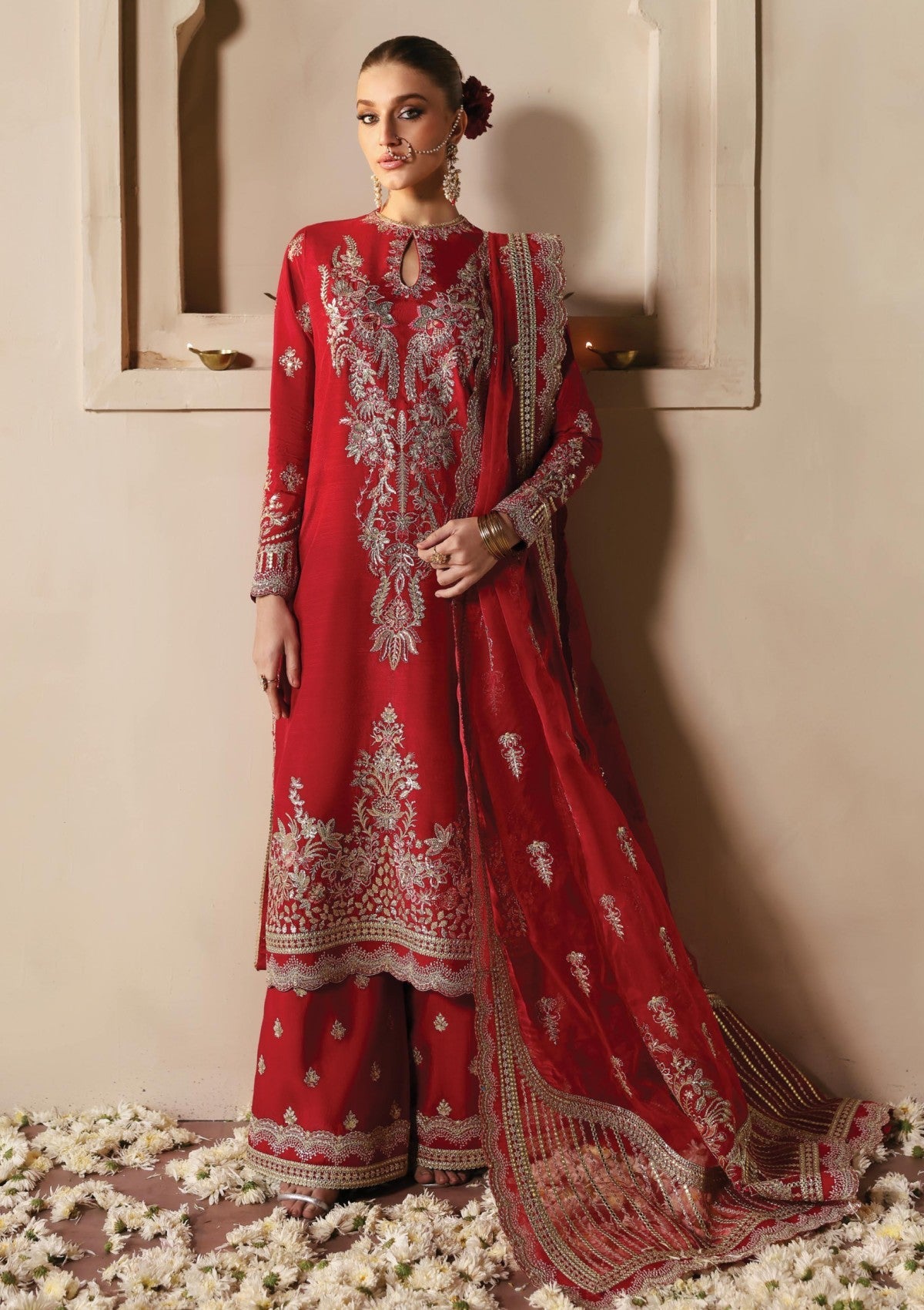 This exquisite ensemble is crafted from luxurious dark pink raw silk, exuding richness and elegance. The ensemble is paired with a sheer organza dupatta, beautifully detailed with a four-sided embroidered border. The trouser features intricate embroidery, adding a striking focal point to the design. Perfect for festive gatherings and special occasions, this outfit combines timeless charm with refined sophistication.