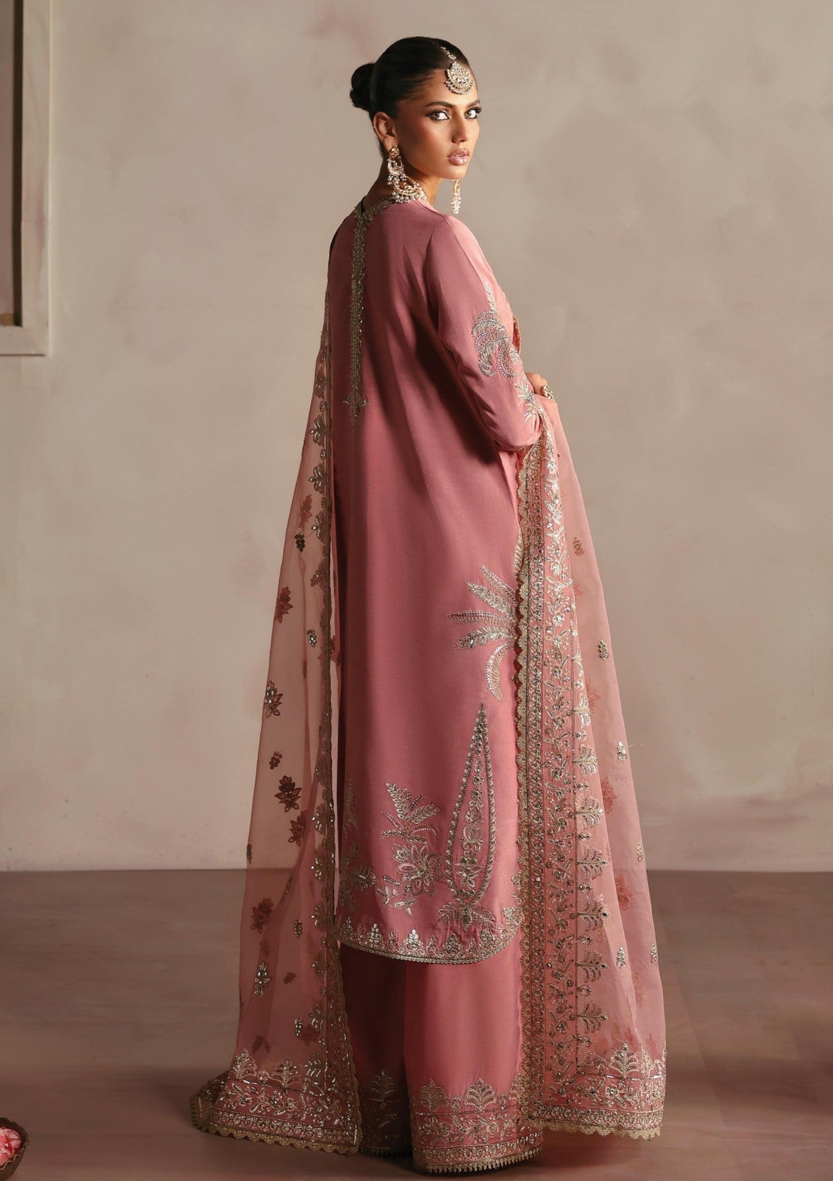 Gulrukh is a powder pink raw silk ensemble, a perfect fusion of elegance and grace. The shirt showcases a floral tropical theme, beautifully brought to life with intricate copper tilla, golden panni, and light gold sequins, adding a subtle shimmer and delicate charm. The outfit is completed with plain trousers featuring an embroidered border, balancing the richness of the dupatta. Ideal for festive occasions, this ensemble radiates sophistication with a touch of nature-inspired artistry.