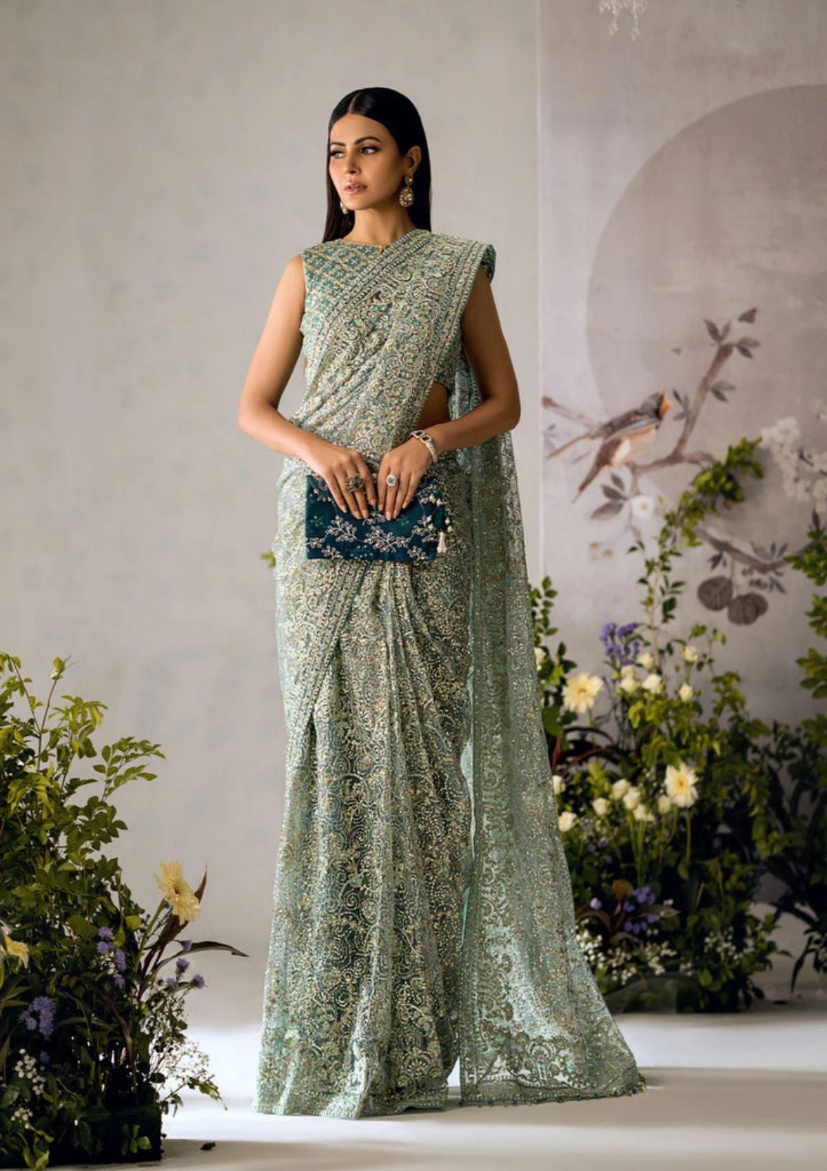 Featuring intricate embroidery in varying shades of aqua, this Tulle Sari creates an alluring and harmonious tapestry of color. Glistening french cut sequins add a touch of glamour, casting a luminous glow. The accompanying blouse complements this masterpiece with its matching gold and aqua embroidery, adorned with gold sequins, completing a look that's as mesmerizing as it is unforgettable.