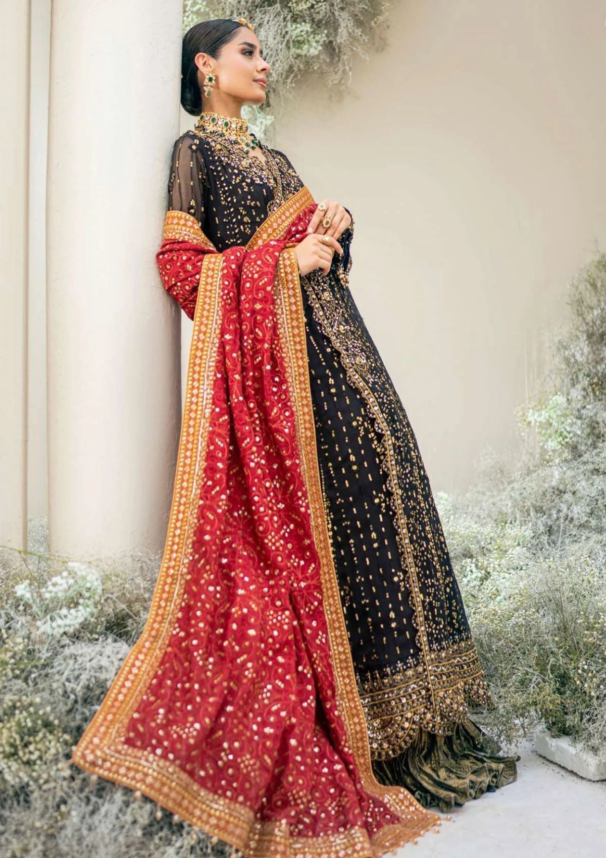 A captivating symphony of black chiffon with an orchestra of antique gold embellishments and intricate beadwork. The base is enriched with sequins shimmering against the self-hued embroidery. Along the border, neckline, and sleeves, clusters of ebony beads and gota accents add more dimension to the Look. The final culmination of this breathtaking design is the scarlet silk chaadar with bronzed hems, fashioned in a traditional kamdani style.