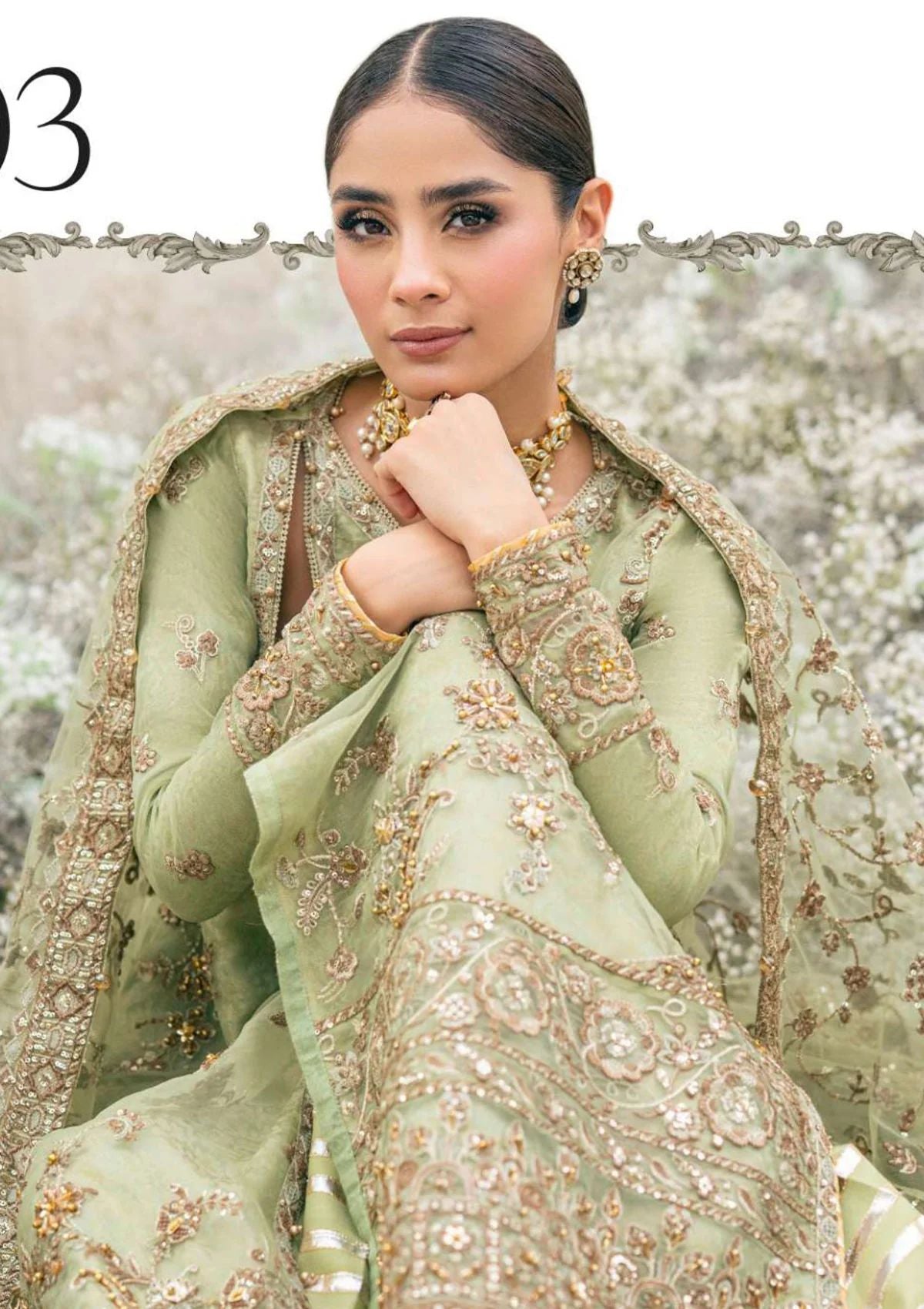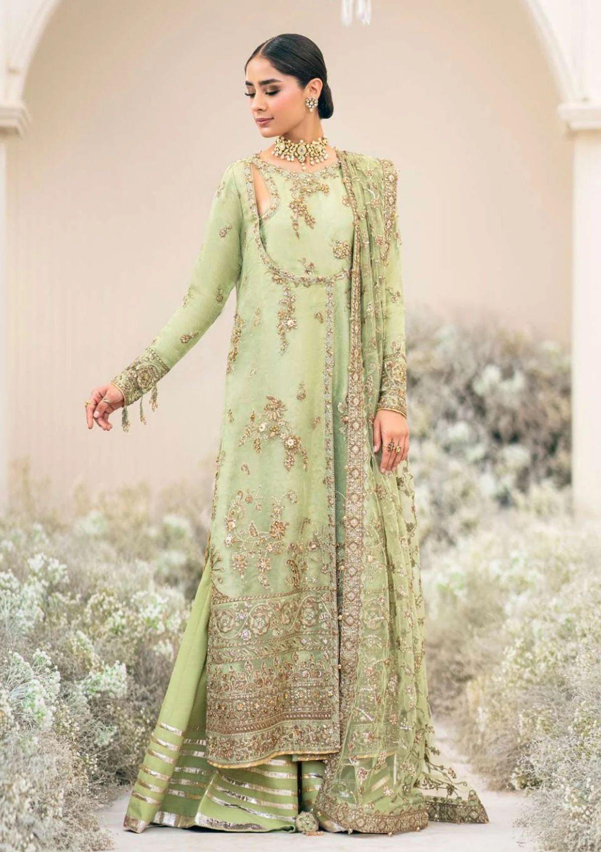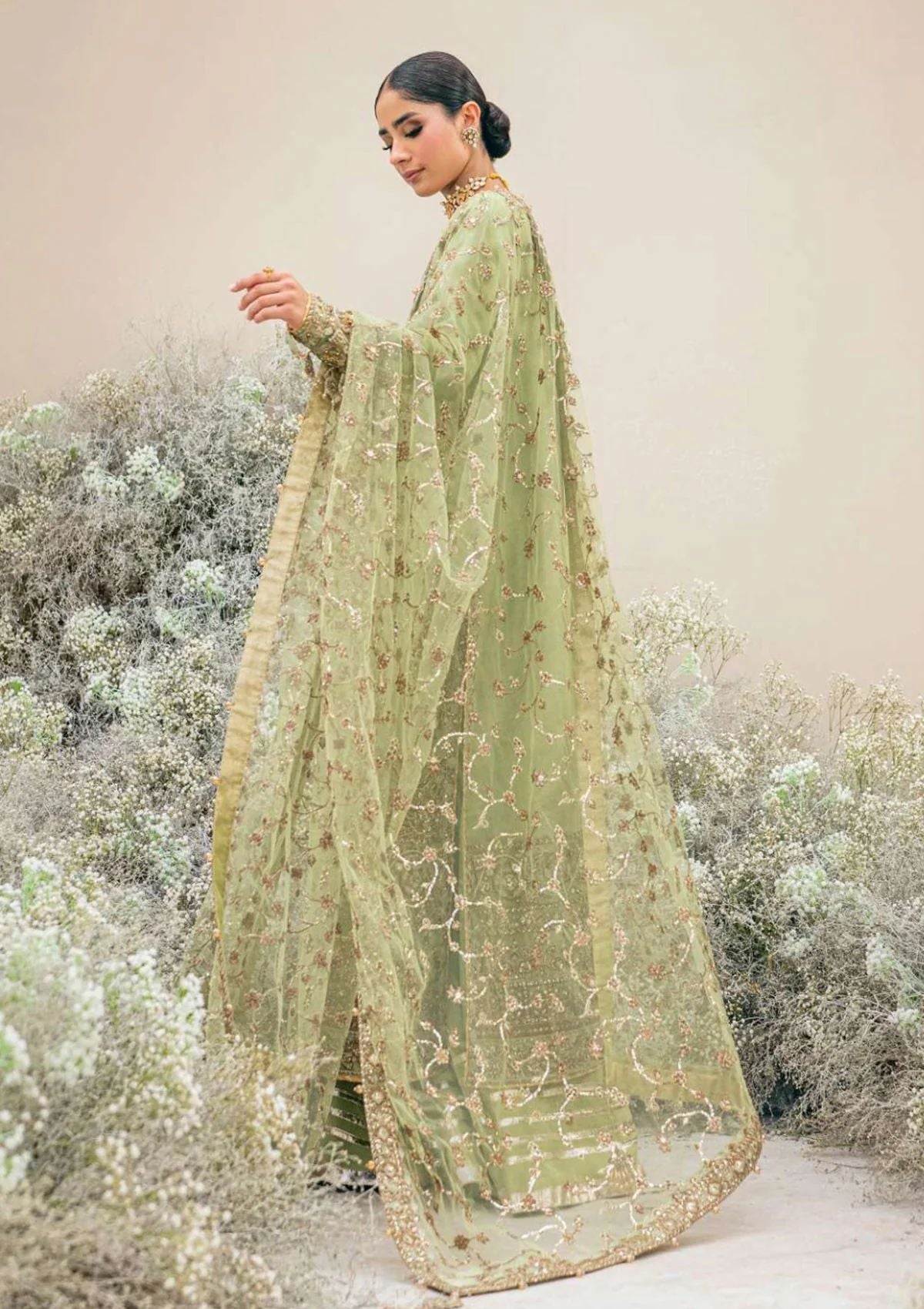 An enchanting chartreuse organza base in a harmonious fusion of understated elegance. Free-flowing and organic adornments of gold-dipped embroideries are composed on the shirt, with bronzed beads and crystals used to hand embellish the motifs. The piÃÂèce de rÃÂésistance lies in the border, laden with lavish embellishments, reminiscent of antique craftsmanship decorate the ensemble, crafting a striking contrast against the soothing green palette.
