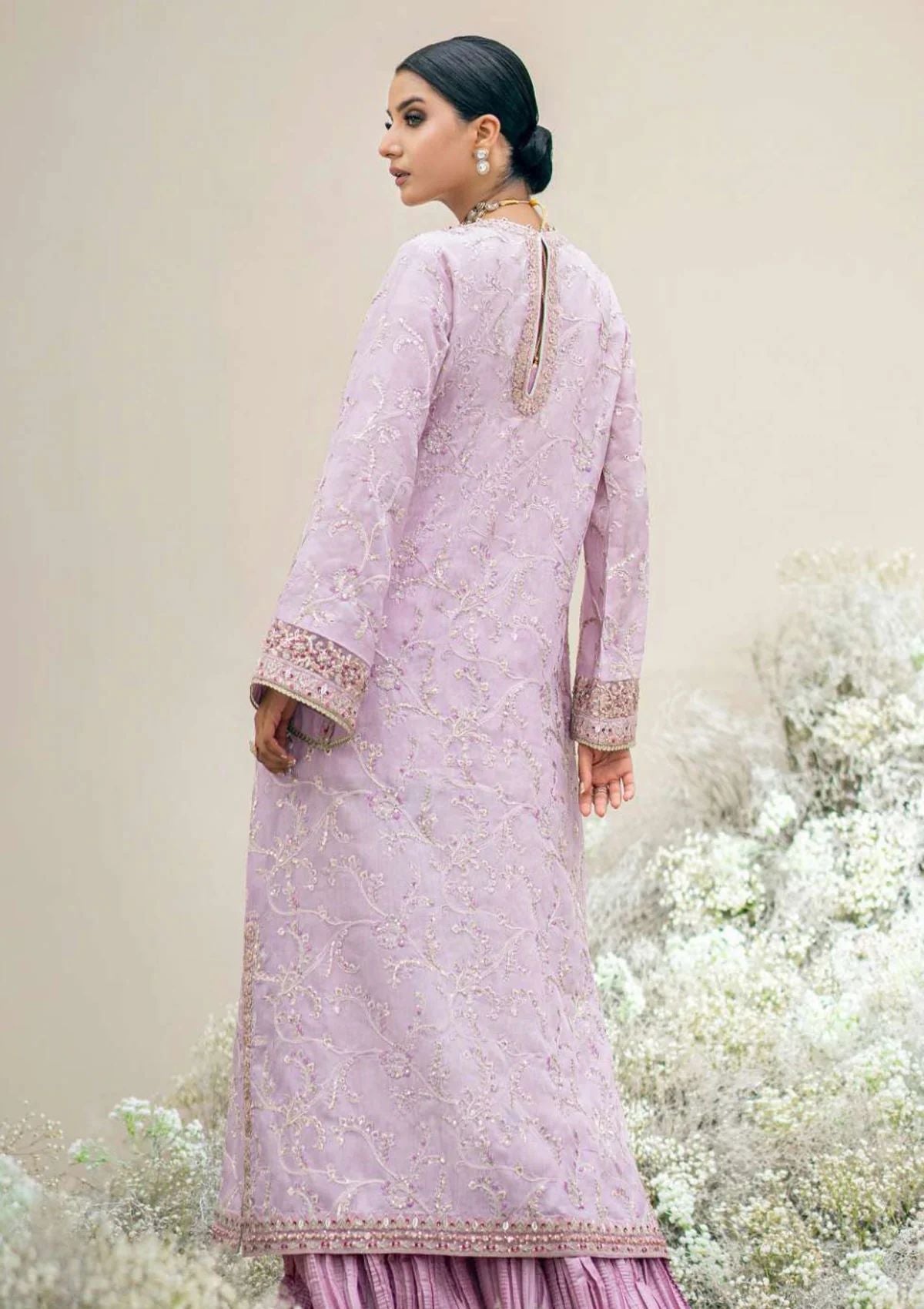 Periwinkle crystals sparkle in this delicate and feminine pastel Look imagined on a plush silk canvas. A running design of intricate embellishments and shimmering sequins graces the fabric, creating a captivating interplay of glimmer and texture. Lace-like embroideries delicately adorn the hem, adding an ethereal touch to the ensemble. Giving this subtle look the final oomph is silk masoori pants.