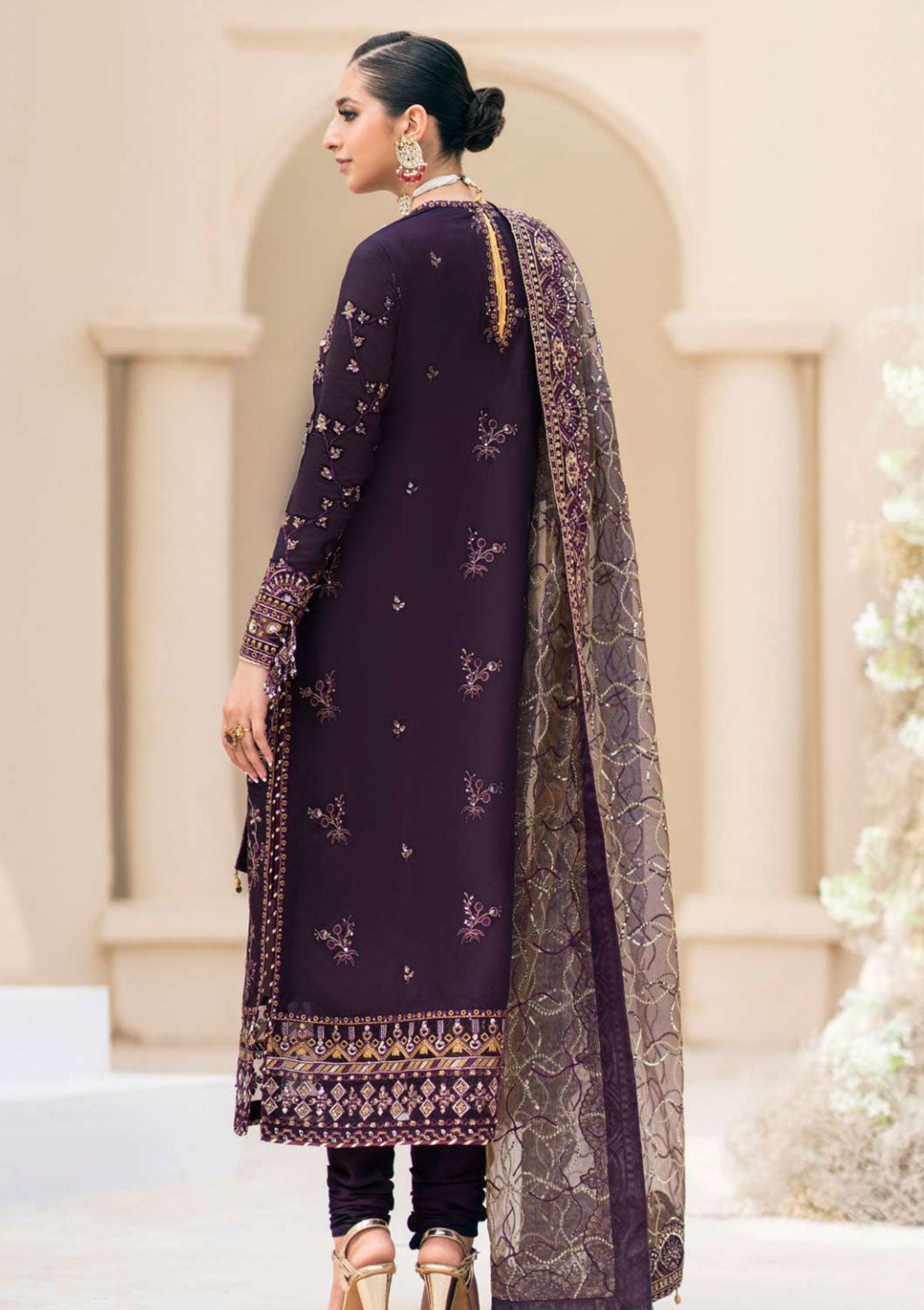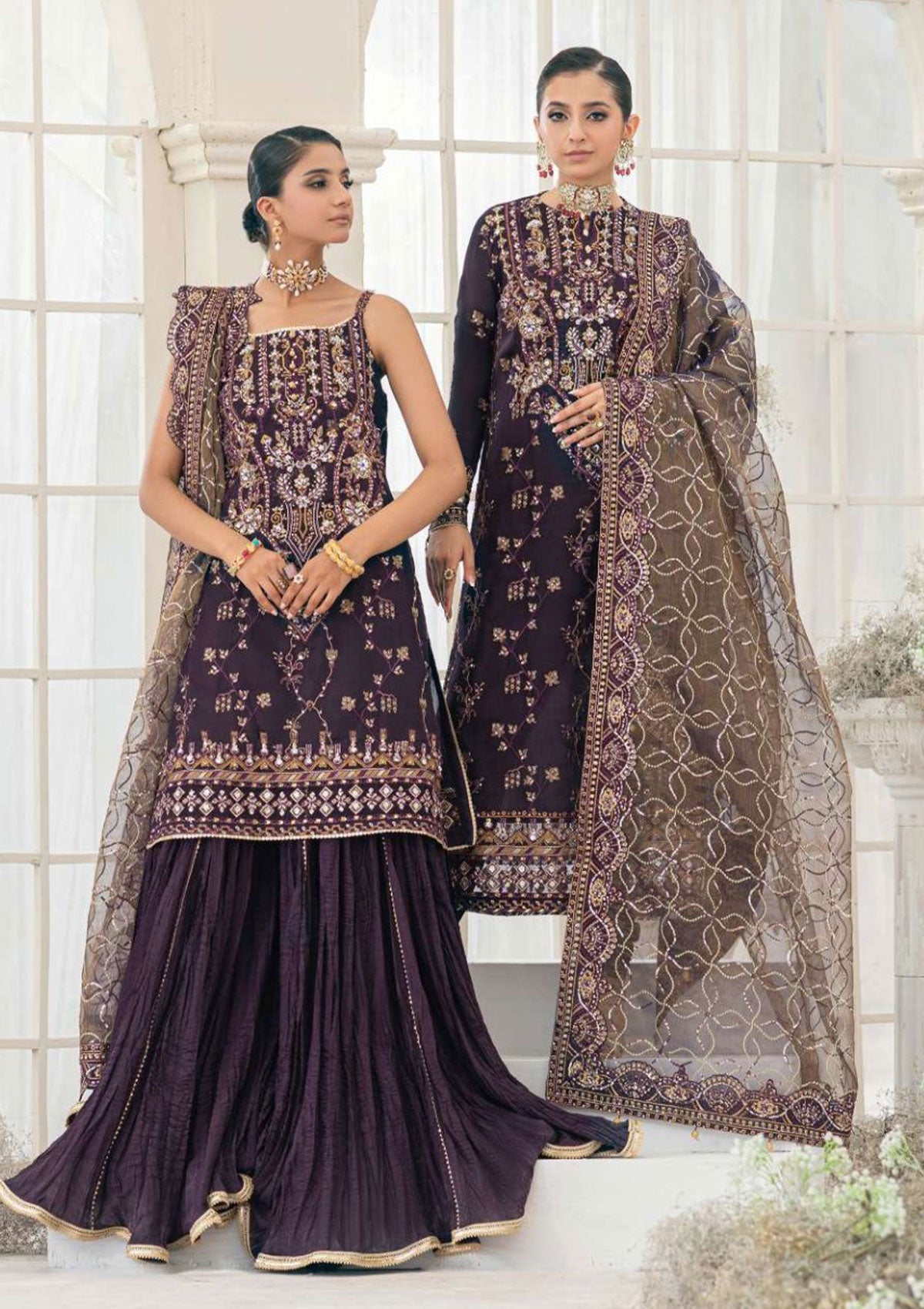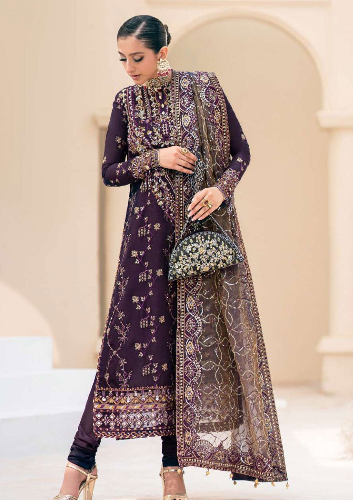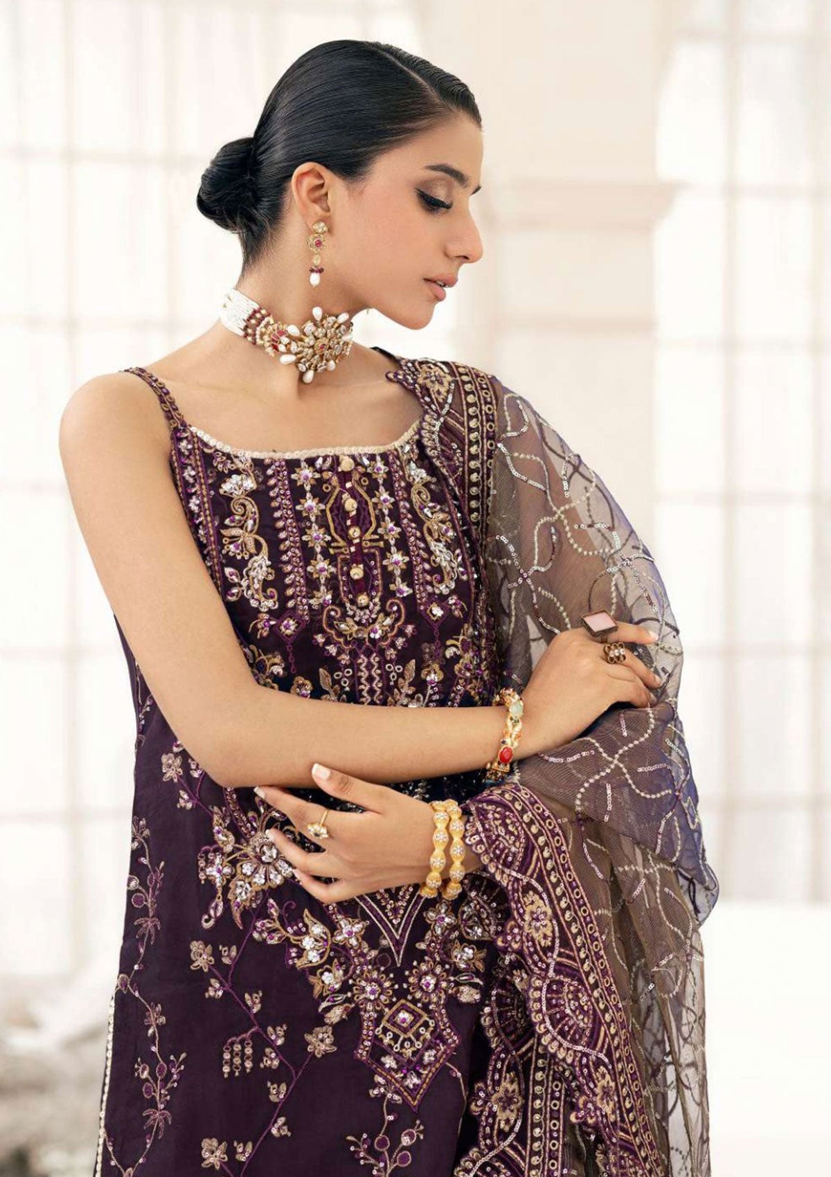 A deep amethyst ensemble with a bejeweled neckline that stands as the radiant centerpiece of the Look. Each motif, like a jewel, runs across the kameez, meticulously embroidered with dark-hued resham threads and gleaming gold tilla. The neckline and hems are canvased by two-toned metallic embellishments and accents of purple beadwork. The masoori organza base of the dupatta has a delicate jaal derived from Rococo patterns which has been constructed using single stitch sequins.