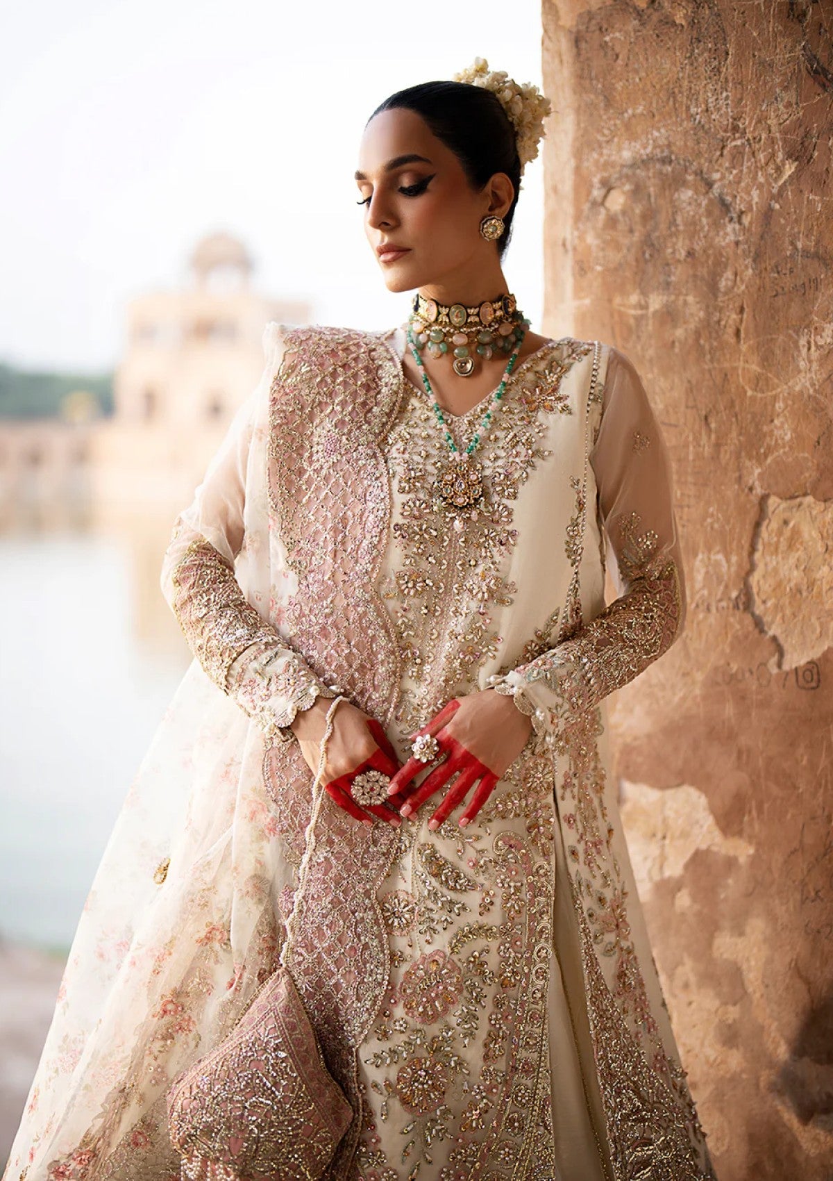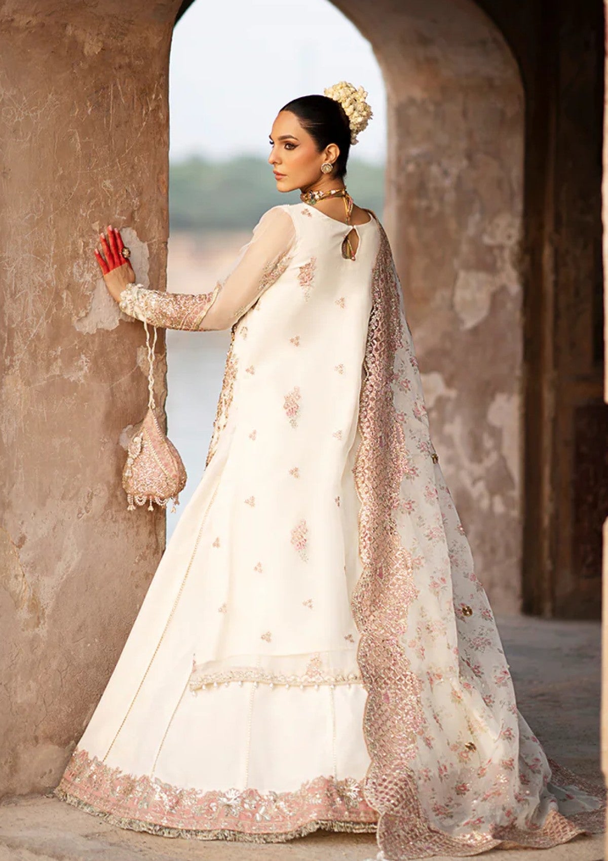 Drape yourself in the exquisite elegance of Dove, a masterpiece of timeless luxury. This opulent ensemble features a meticulously Resham embroidered and hand-embellished organza front, enriched with fine artistry on its right and left panels. The sleeves, adorned with intricate Resham and sequins embroidery, add a touch of regal grace, while matching motifs elevate the look with unparalleled sophistication. The back echoes the front's refined details, harmoniously paired with a 144-inch embroidered border that graces the trousers and dupatta. Completing this vision is a printed organza dupatta, adorned with delicate gotta and pearl spray, and a lavish 5-yard length of dyed raw silk. Embrace the embodiment of modern luxury and elevate every moment in Dove.