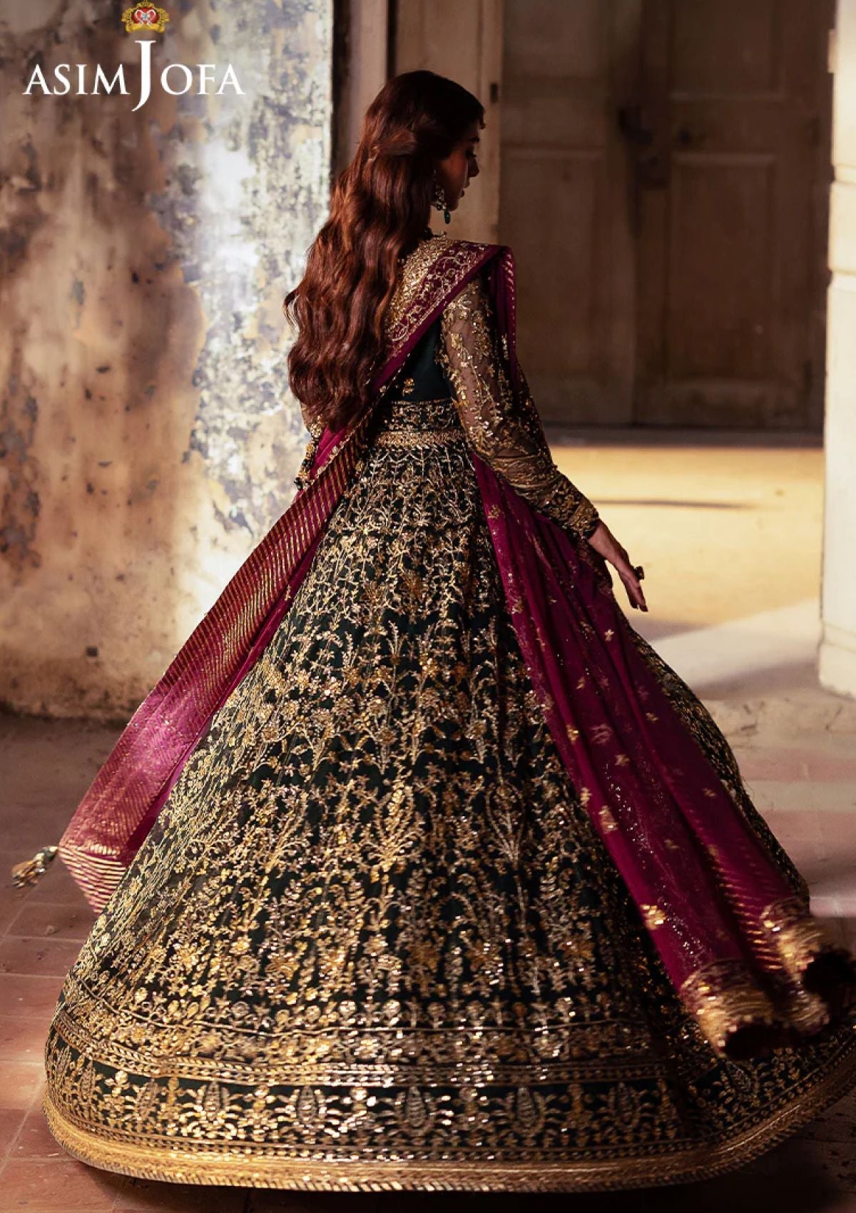 Draped in the emerald richness of a royal garden, this bottle green ensemble captures a timeless elegance. The embroidered Peshwas, a true symbol of regalia, is adorned with gold zariwork winding gracefully among sparkling golden sequins like morning dewdrops. Paired with a magenta embroidered dupatta that mirrors a twilight sky above the garden, this regal creation resonates with an elegance that lingers through the night.