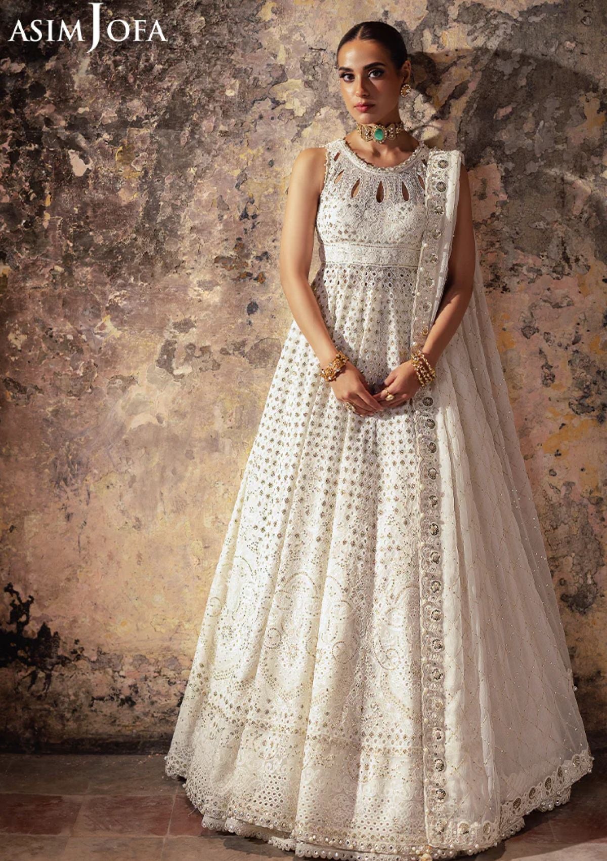 This ivory Peshwas is a canvas of opulence, a whisper of sophistication that dances in the light. Embroidered with ivory threads, it weaves a story of grace, while light gold cupped sequins shimmer like scattered stardust, adding a touch of magic to the ensemble. Crafted with a "boring" technique, it boasts a unique cutwork effect, reminiscent of ancient architecture. Paired with a beautifully embroidered dupatta, a masterpiece that envelops the wearer like a gentle breeze, creating an aura of ethereal beauty that lingers in the hearts of those who behold it.