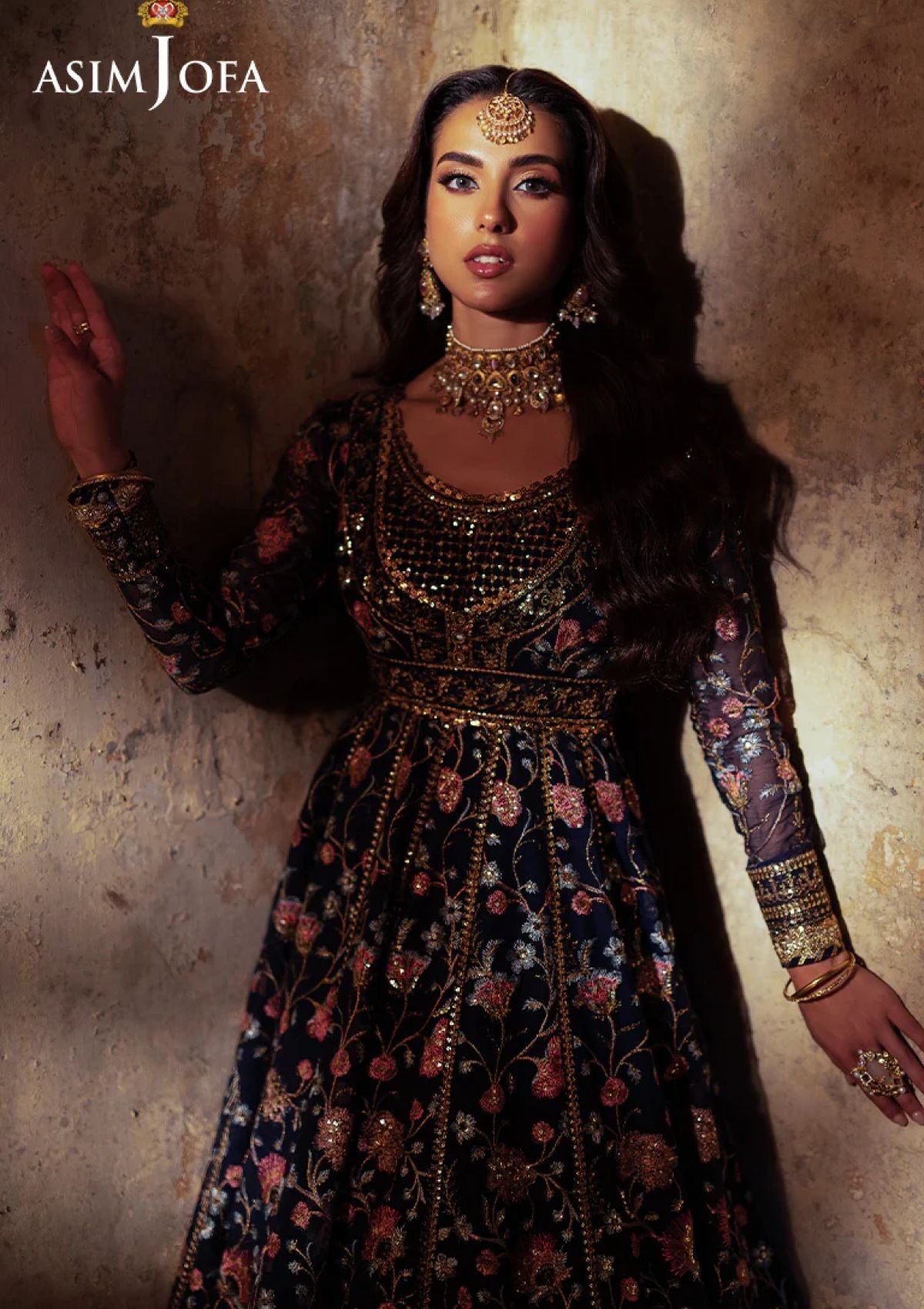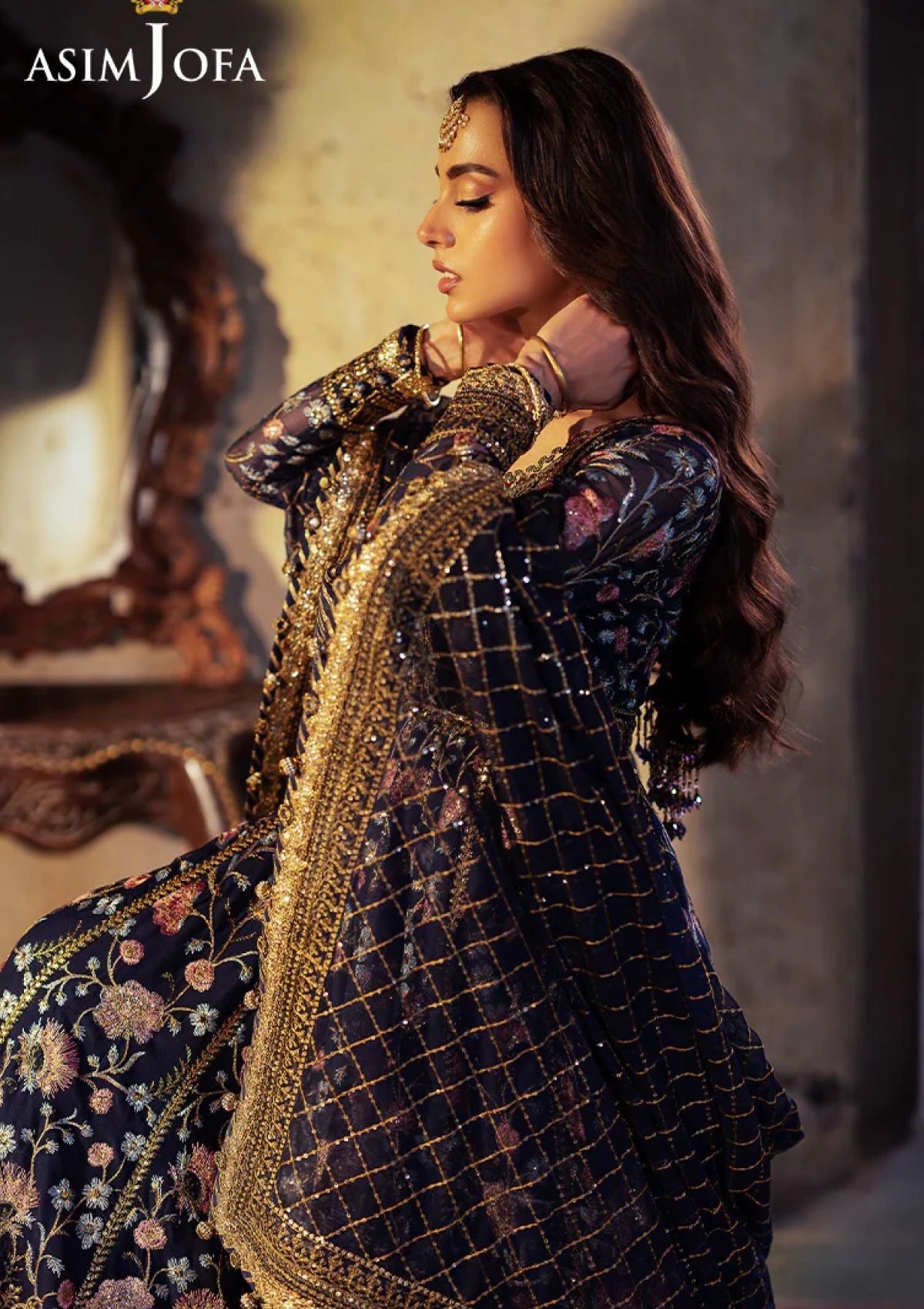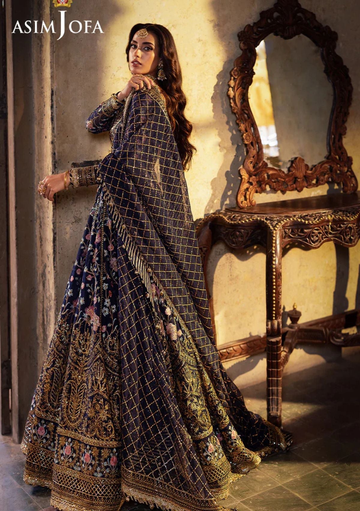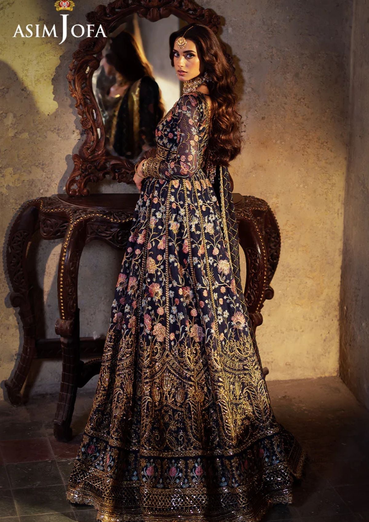 This navy blue ensemble, reminiscent of a night sky, exudes ethereal grace. The beautifully embroidered Peshwas is adorned with a shimmering constellation of gold cupped sequins and intricately embroidered with gold zariwork that dances through colorful threads in light pink, dark pink and sage green hues. The flowing chiffon dupatta, embroidered with perfection is like a gentle breeze, completing this symphony of elegance, transforming the wearer into a timeless vision of beauty.