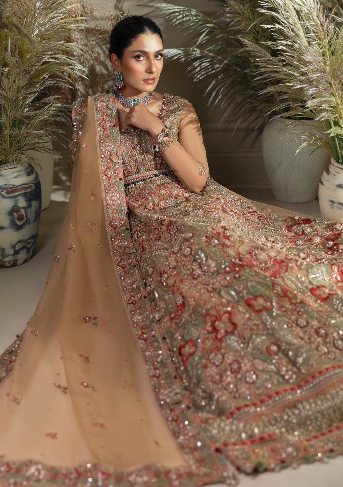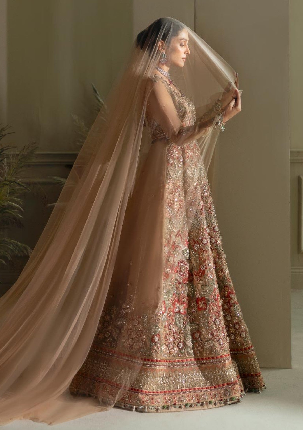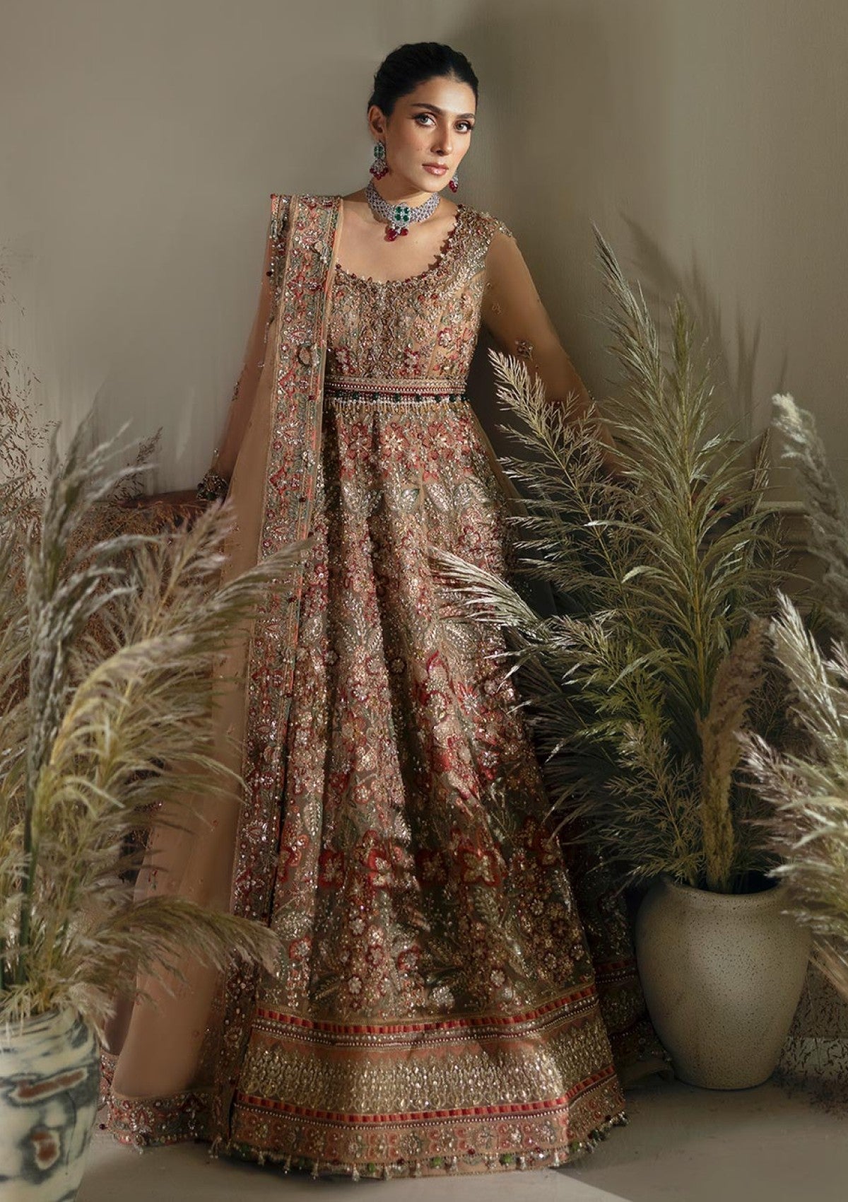 ÃÂÃÂlan's 'Mystic Champagne'âÃÂÃÂa breathtaking masterpiece that embodies sun-drenched elegance. Its soft beige and golden hues evoke sunlight dancing on tranquil waters, enveloping the wearer in a radiant glow. Hand-embellished with delicate seed pearls, luminous Swarovski crystals, and shimmering tinsel, every detail whispers luxury.