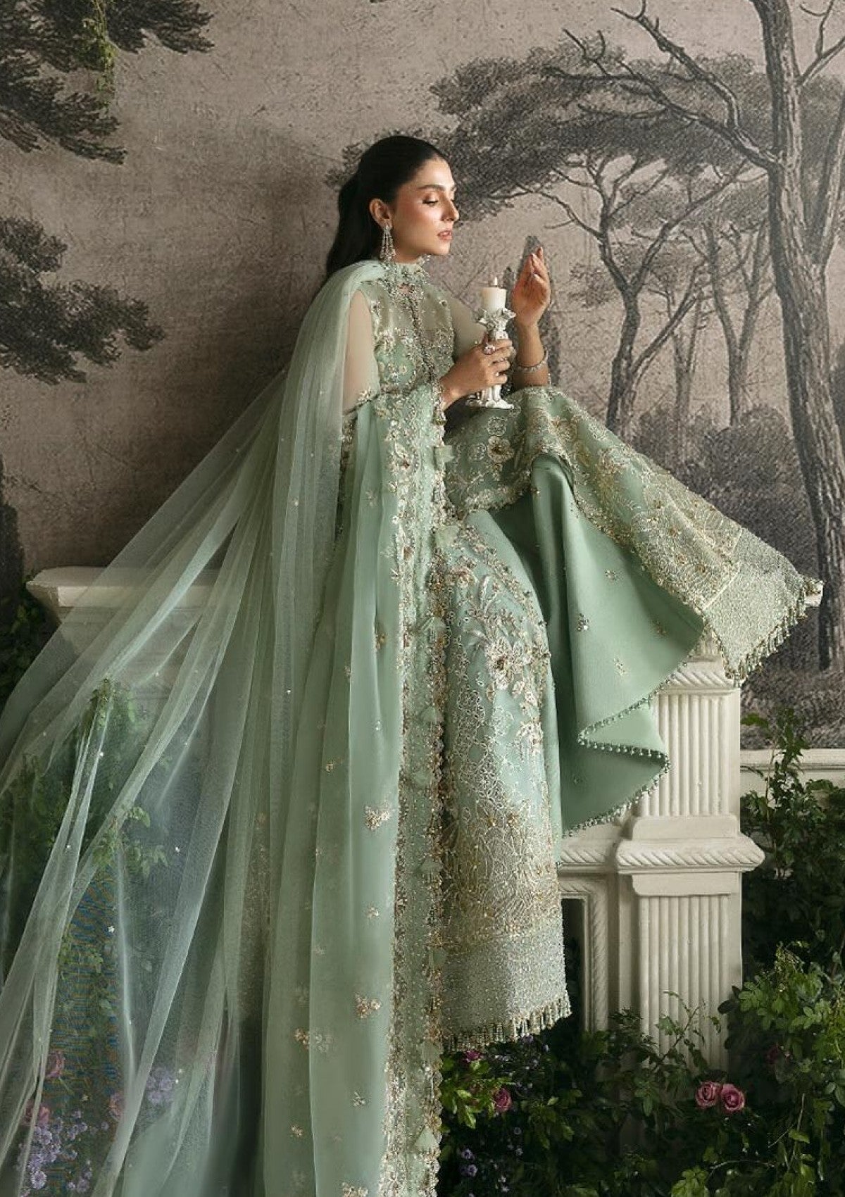 A cascading silhouette flows effortlessly, accompanied by a delicate floral filigree stole. Romance meets refinement in this couture masterpiece from ÃÂÃÂlan's wedding festive collection.