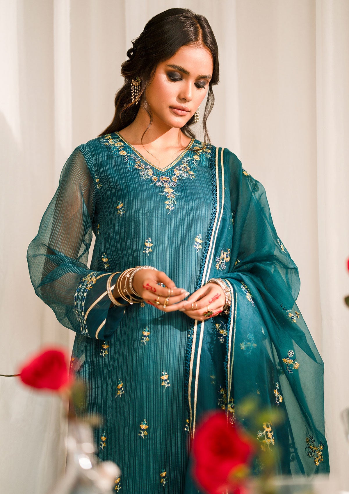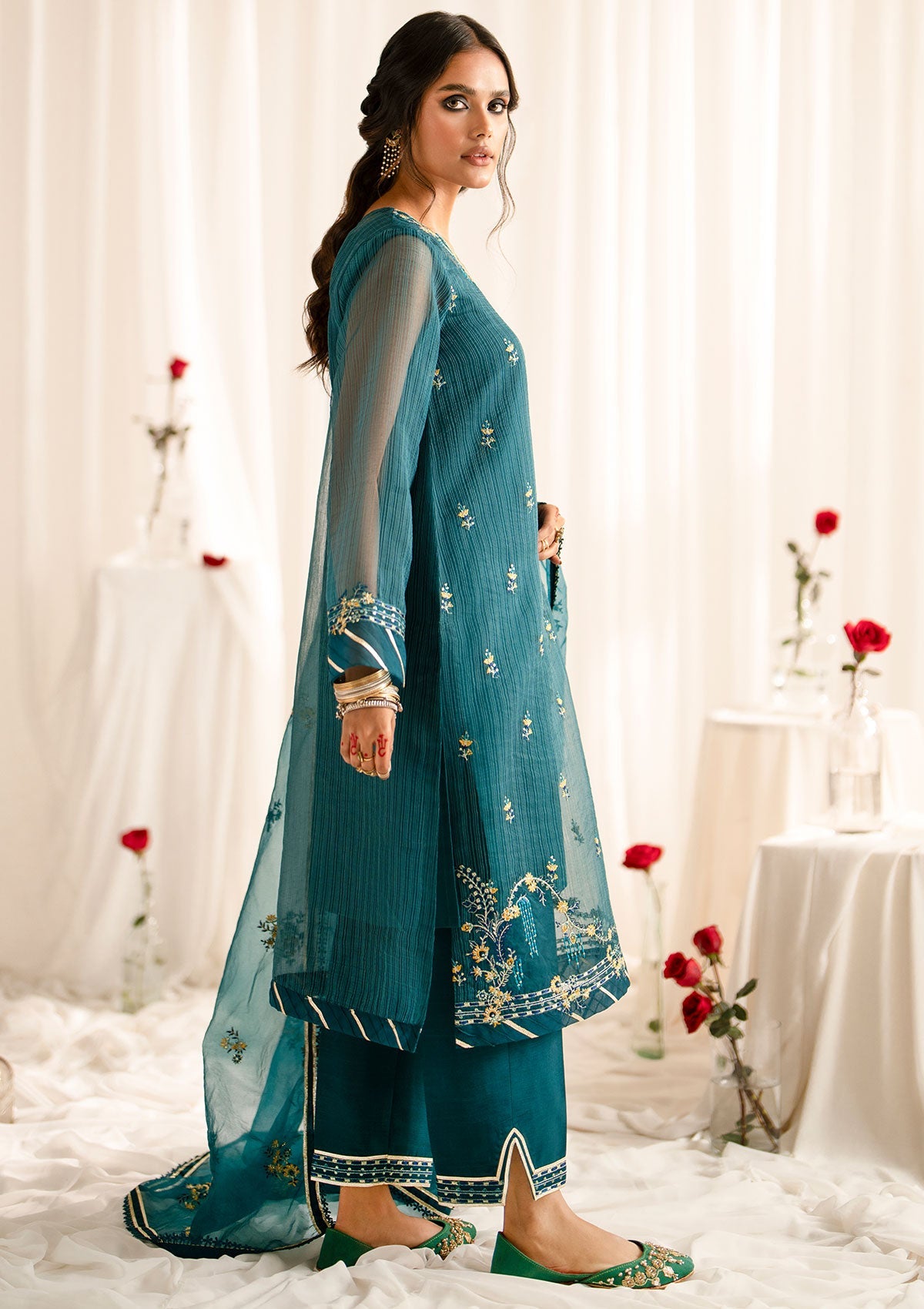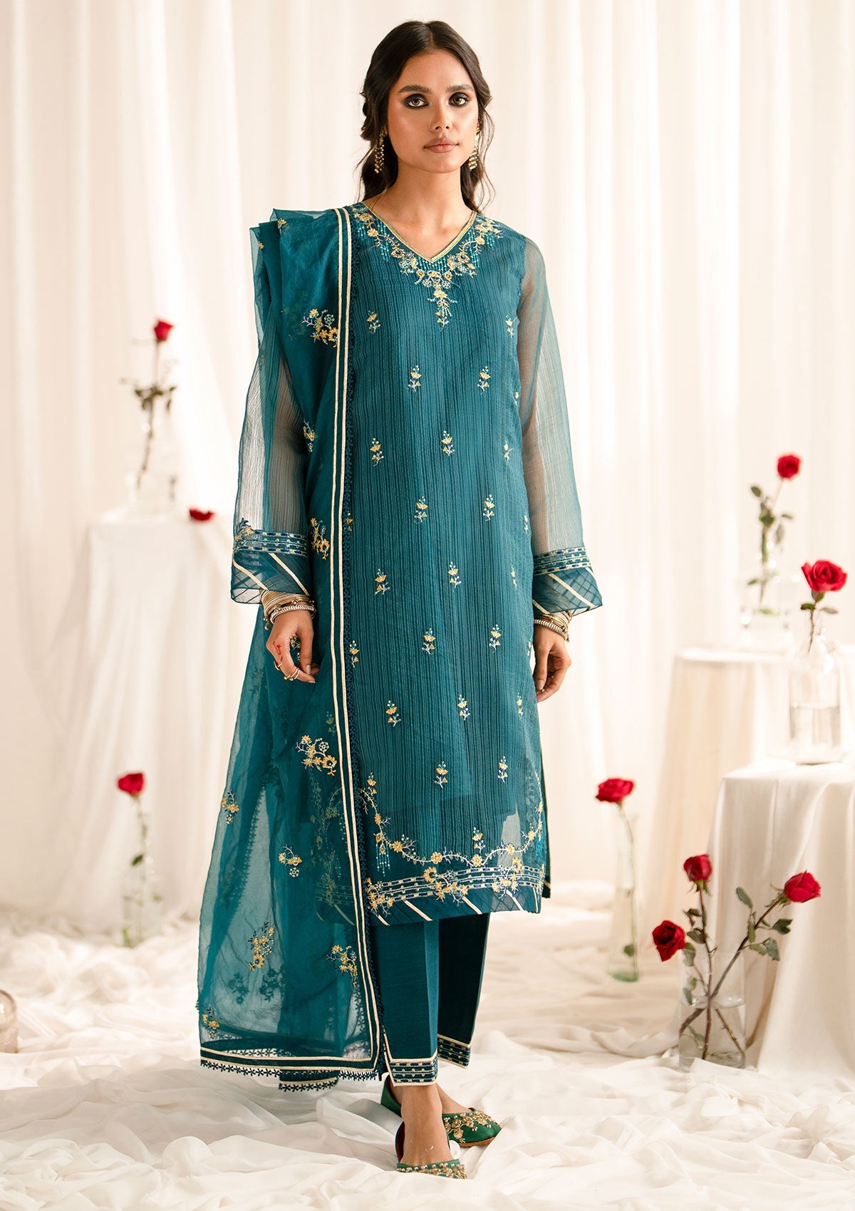 Introducing Ayla, a captivating ensemble in teal. Adorned with intricate floral embroidery in peacock colors, Ayla exudes elegance. Featuring an embroidered neckline and hem, embroidered trousers, and a dupatta with floral motifs, enhanced with gotta patti details throughout in the stitched ensemble. Ayla is a timeless statement of beauty and grace.