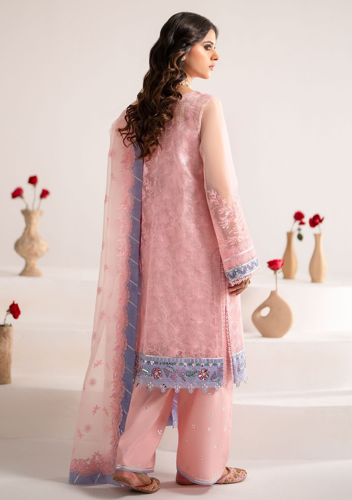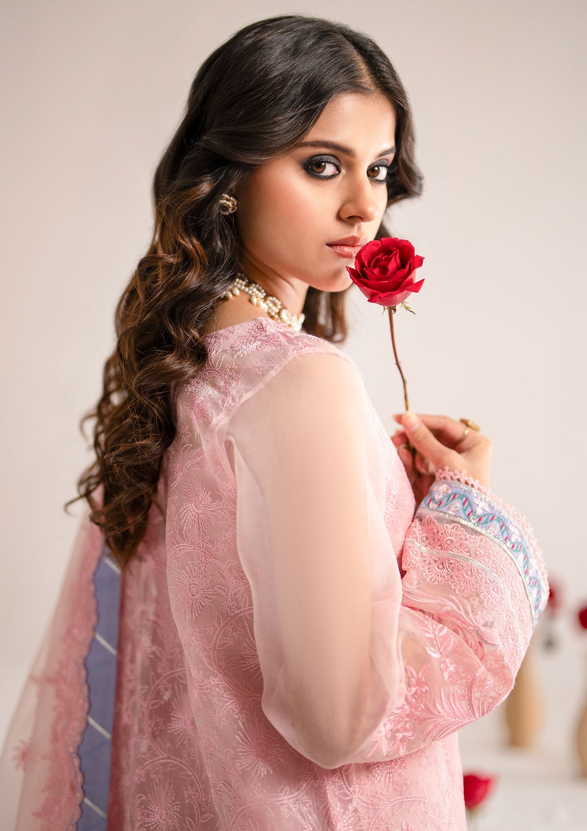 Gulfam, a delicate beauty in powder pink. Gulfam dazzles with self-embroidery all over, complemented by embroidered paper silk lavender borders on the hem and sleeves, featuring pink, green, and silver tones. Embroidered buttons and culottes add sophistication, while gotta patti finishes on the shirt and trousers complete the look. Gulfam radiates timeless charm, making it a perfect choice for every celebration.
