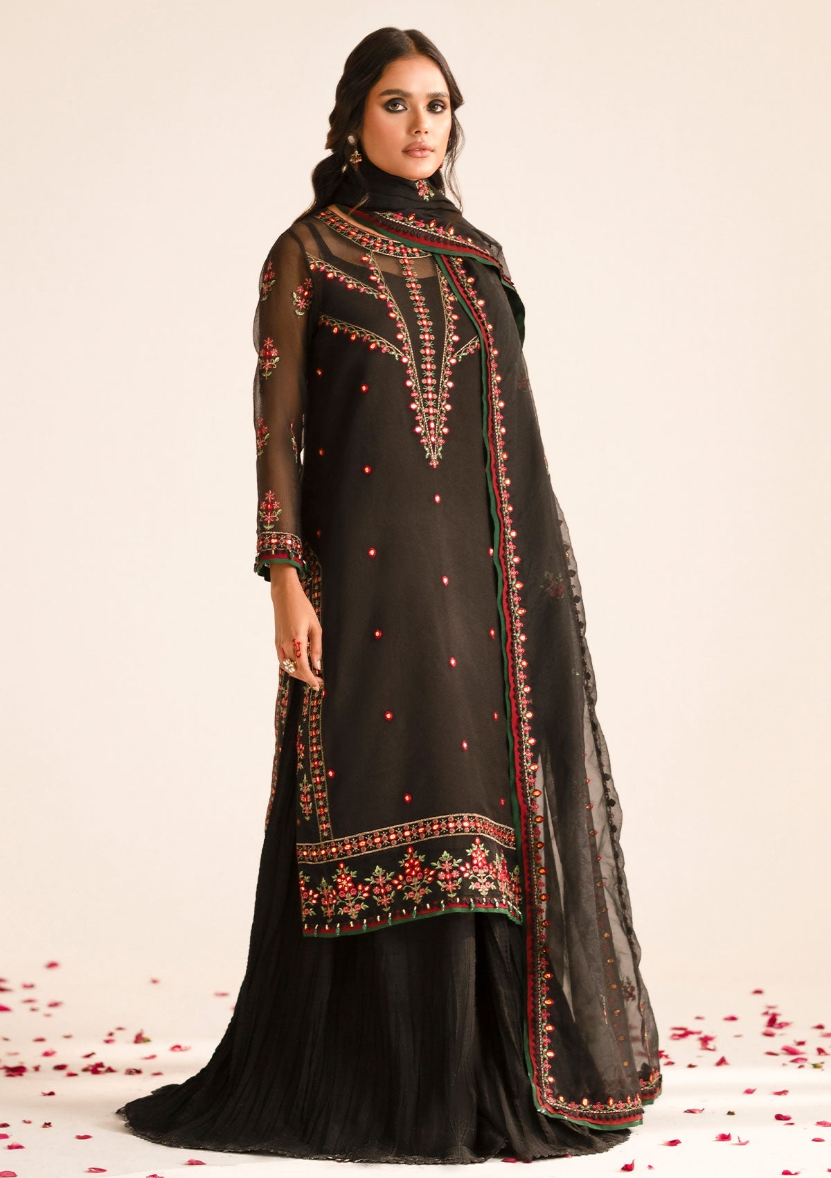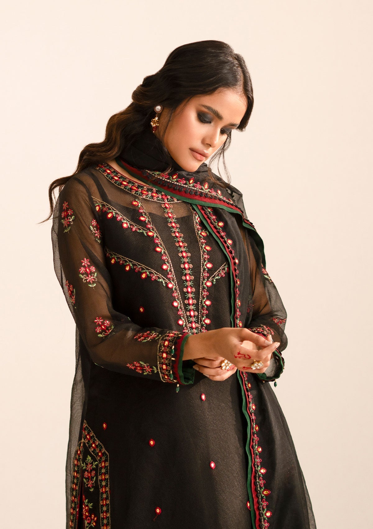 Zeba, a vision of elegance in timeless black. Adorned with vibrant shades of red and green embroidery, Zeba features intricate gold panni detailing for a touch of opulence. With an elaborately embroidered bodice and hem, Zeba captivates with its sophistication. Complete with a delicate organza dupatta, it is a masterpiece of beauty and grace, perfect for any occasion.