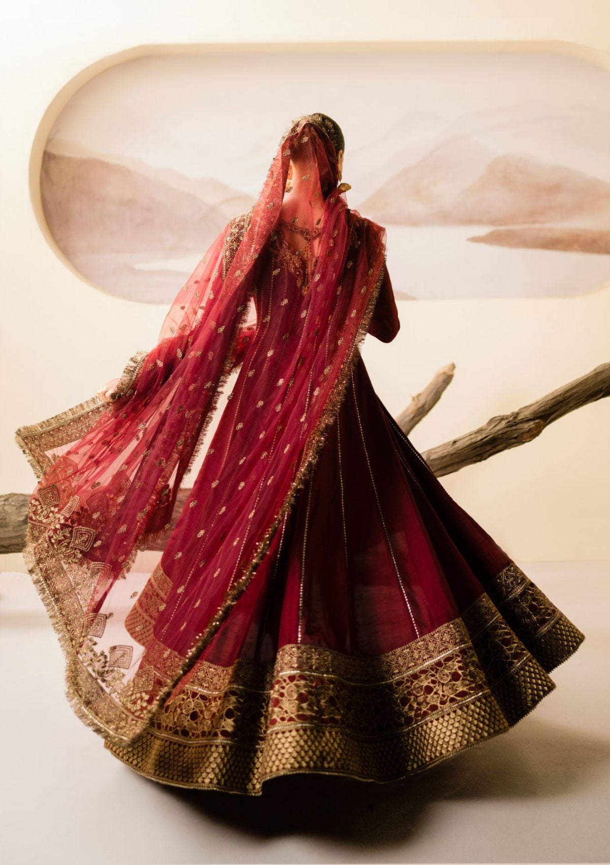 - maroon net dupatta, a final whisper of grace, adorned with gotta kinari and kiran