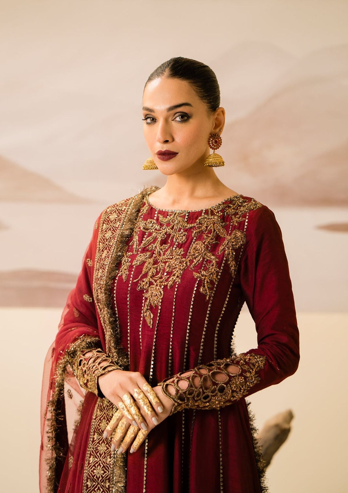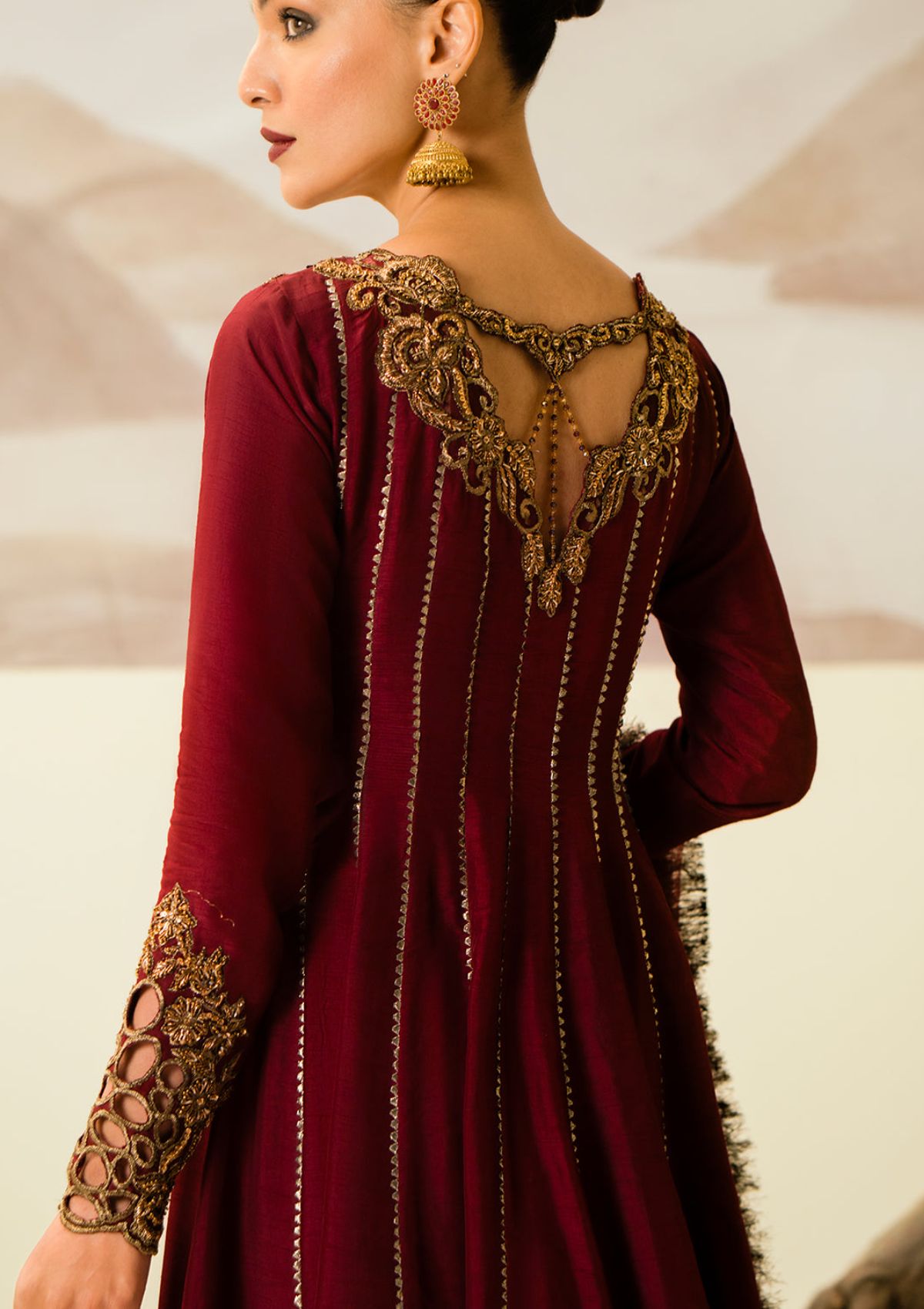 - A maroon kalidaar, adorned in tales of dabka, nakshi, sequin, and tilla work,