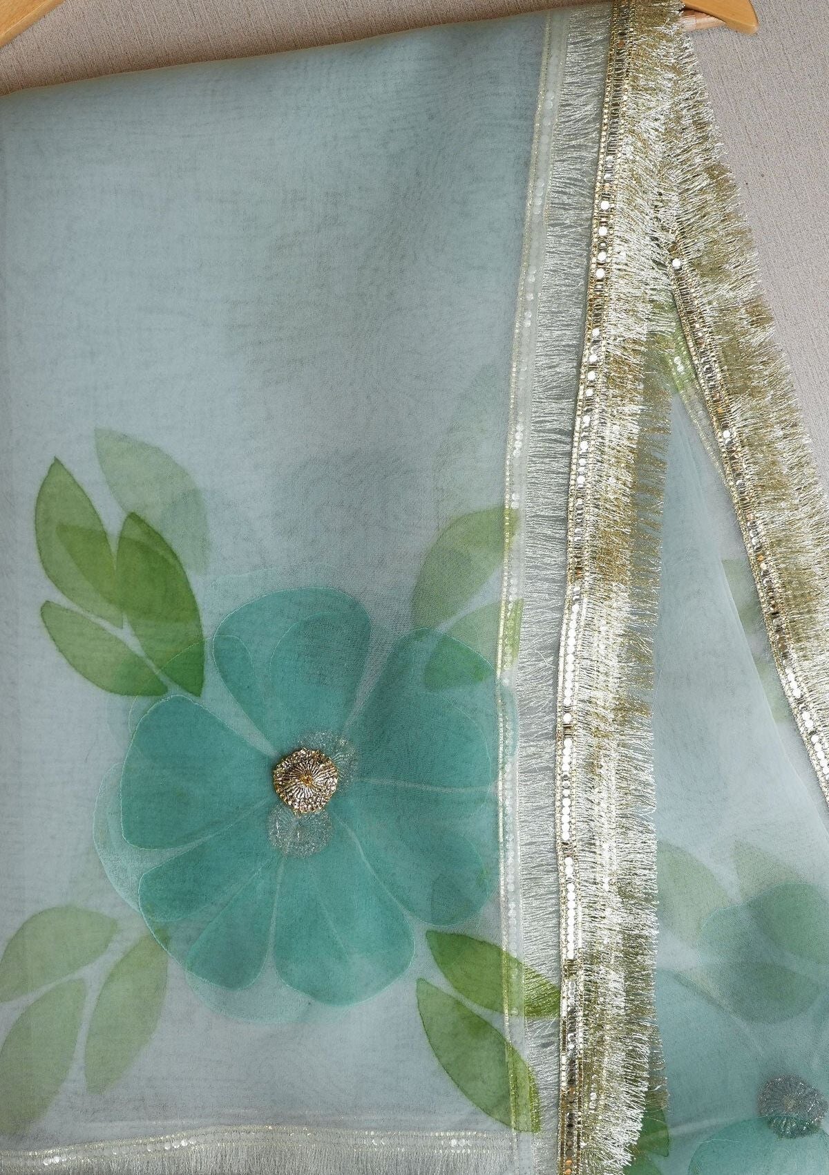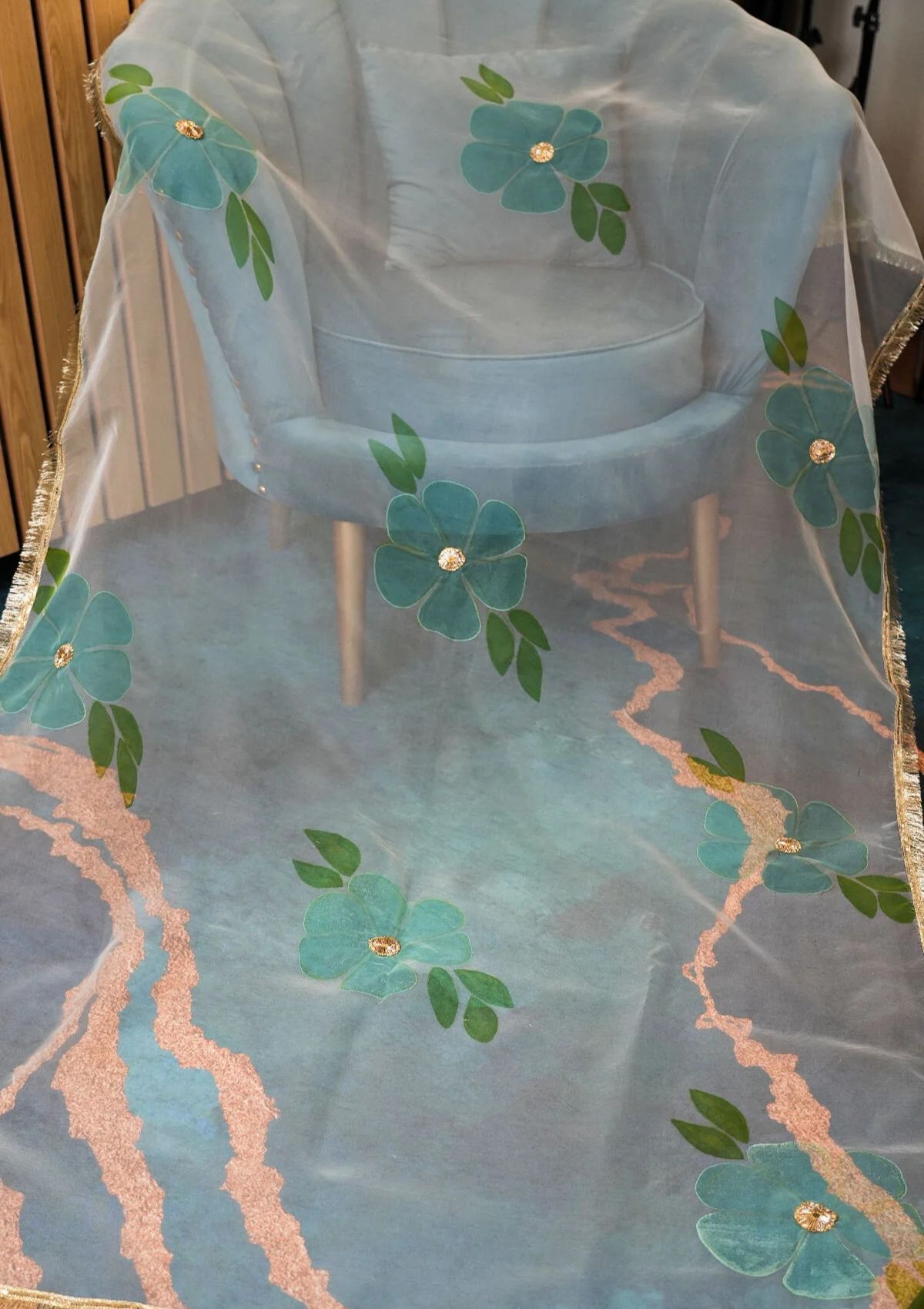 Embellishment on Dupatta: Hand Painted flowers and leaves, Kiran Lace, Gotta work, Pearls