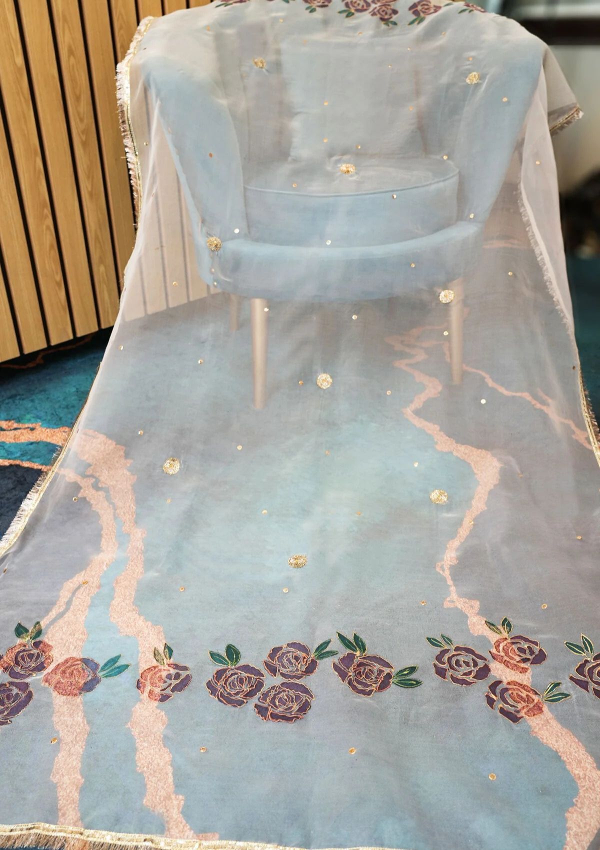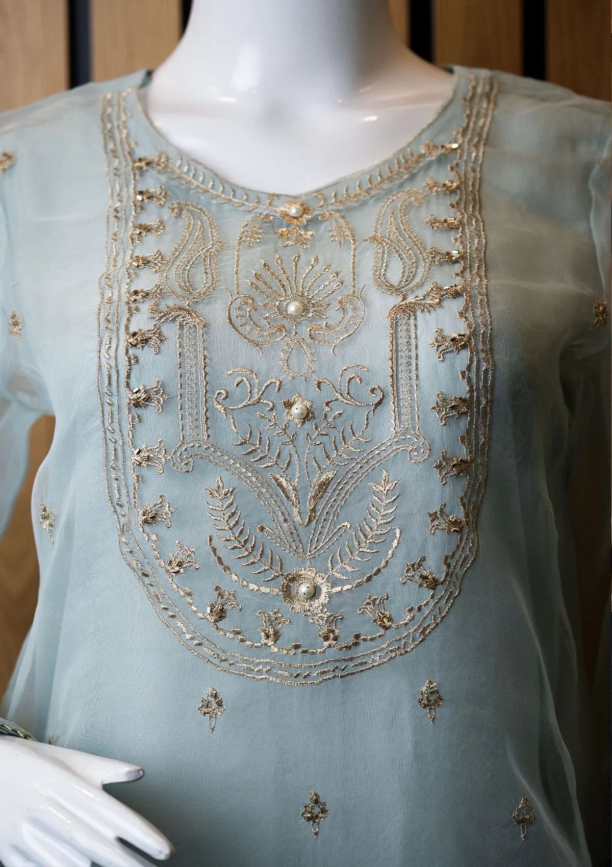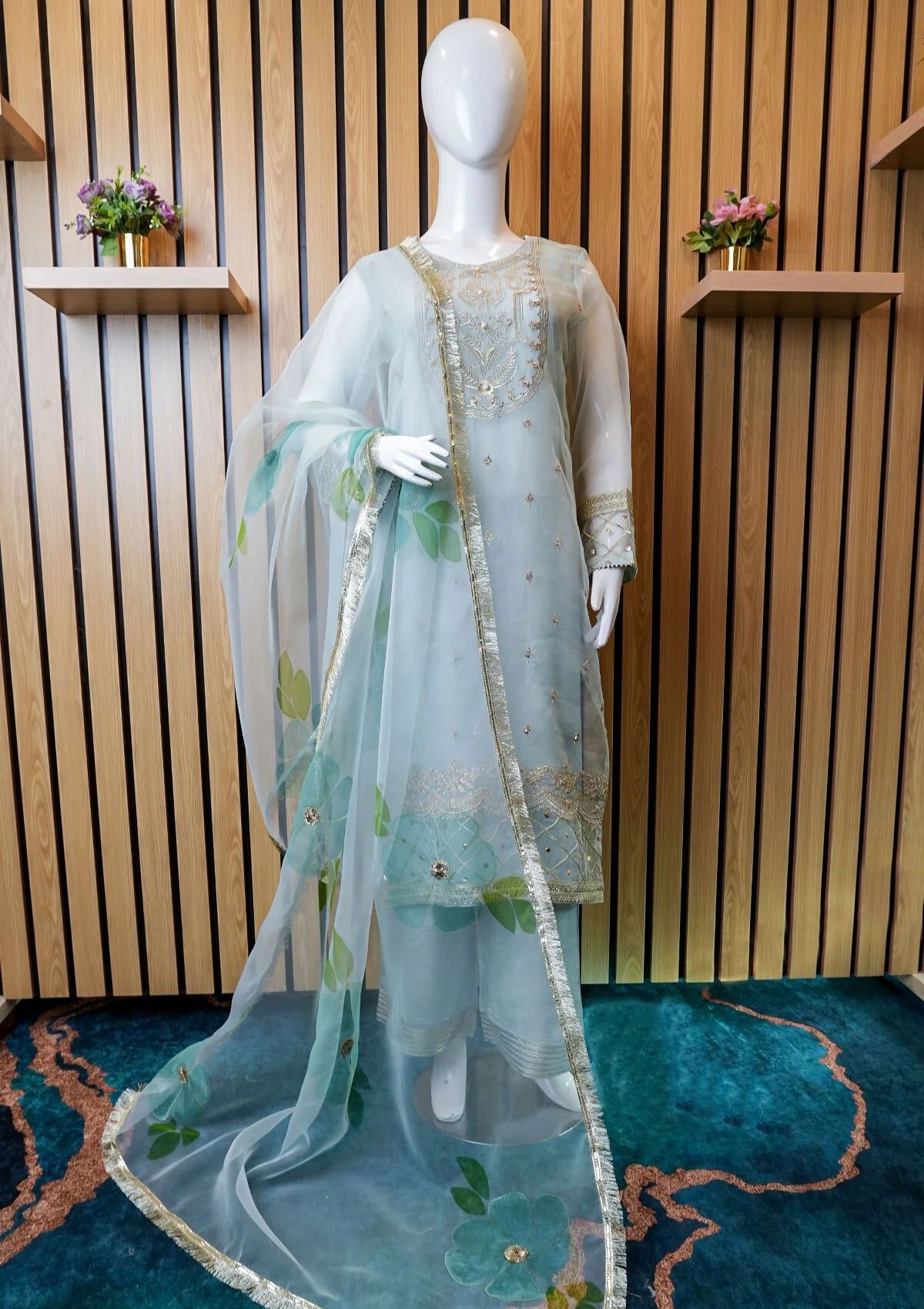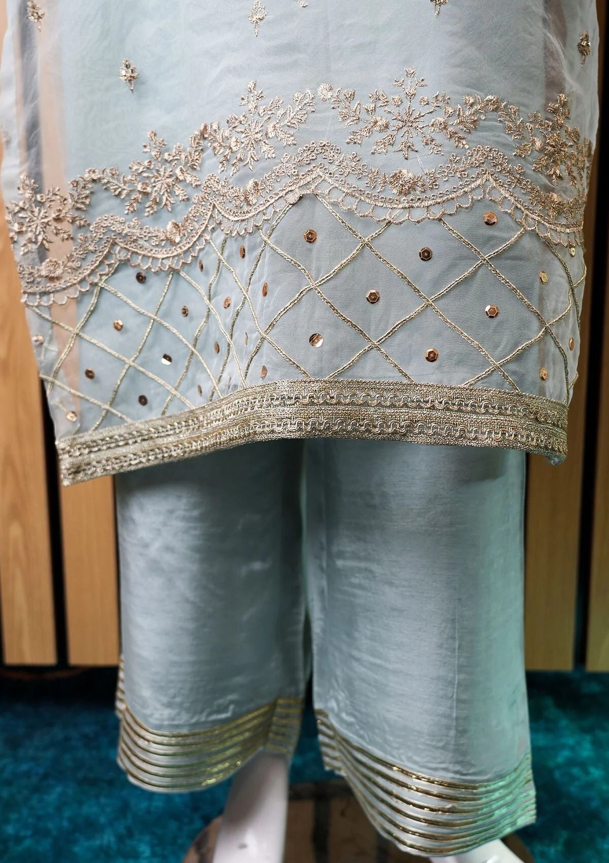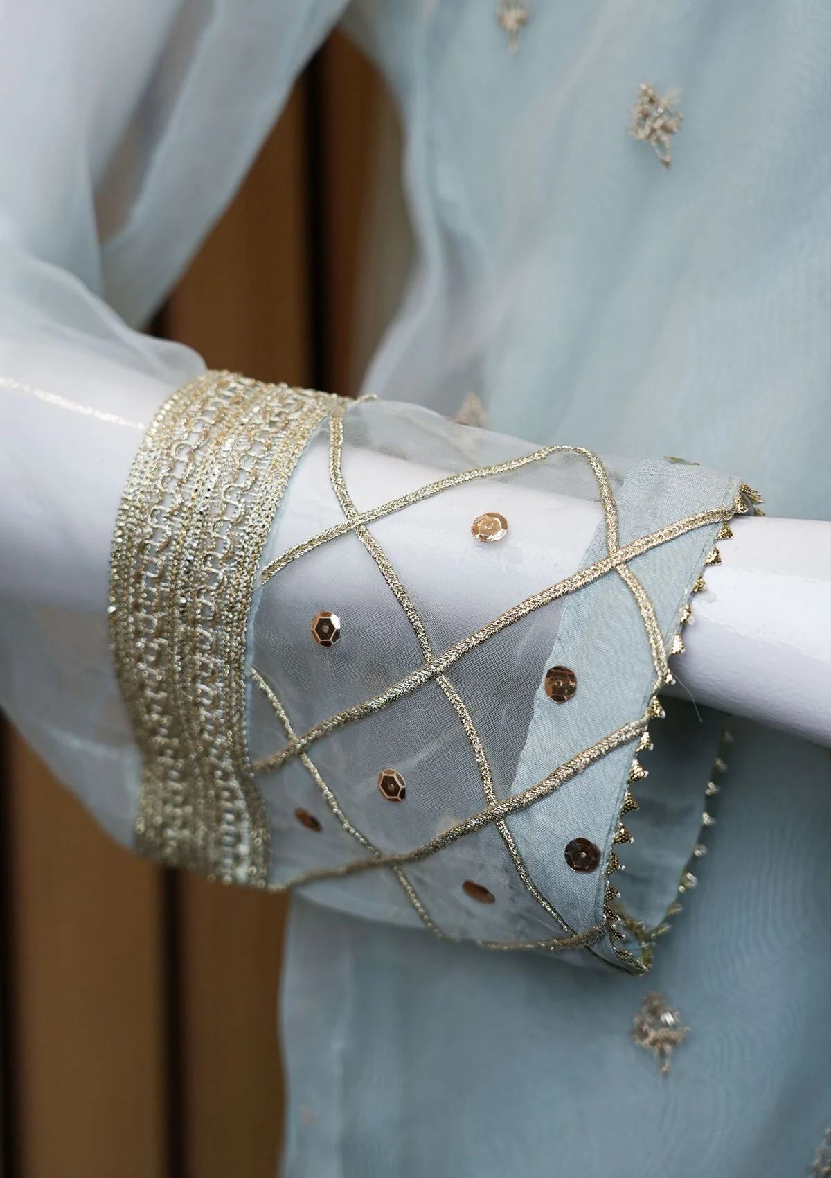 Step into the enchanting world of elegance with our Festive Edit semi-stitched 4-piece organza suit from MJ by Madiha Jahangir. Crafted from luxurious pastel sky blue organza with a soft cotton silk lining, the shirt features exquisite golden tilla embroidery and shimmering golden sequins, accented by delicate pearls on the front. Paired with raw silk bell-bottom trousers adorned with intricate gotta work detailing. Completing the ensemble is a hand-painted designer dupatta, adorned with charming flowers and leaves, embellished with sequins, pearls, and delicate kiran lace on the borders, exuding timeless sophistication and grace.