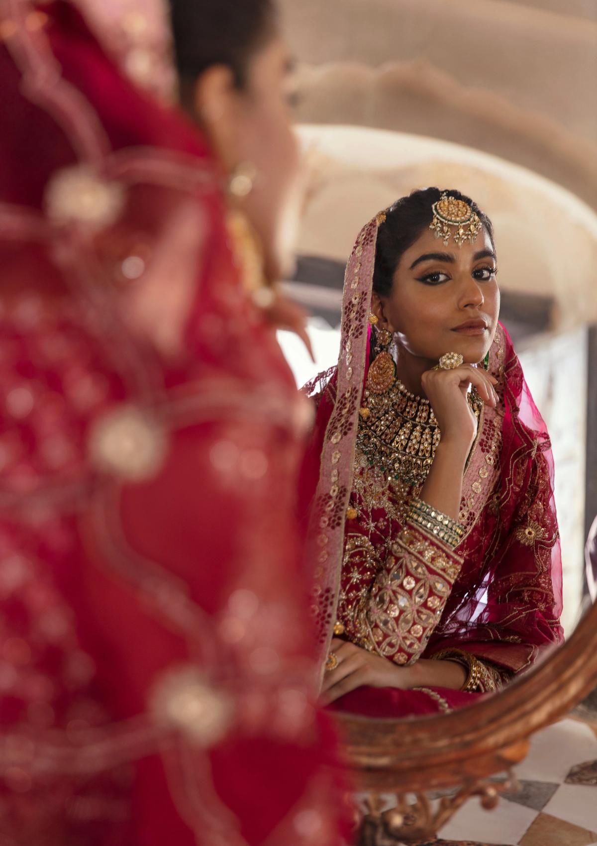 This dreamy red pure silk ensemble features intricate dabka and marori work, beautifully complemented by an organza dupatta adorned with gota, sheesha, naqshi, and pearl embellishments âÃÂàan ode to artisanal traditional opulence.