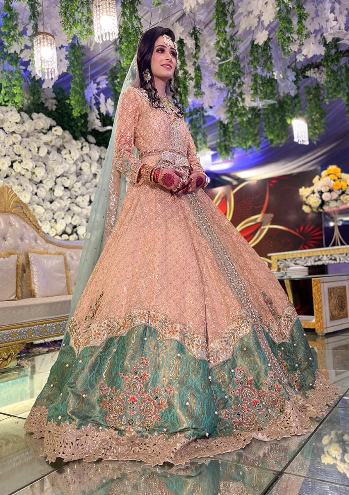 Encrusted with sheesha, gota, naqshi, and meticulous gold embroidery featuring a sooty fawn canvas with a hint of mint green makes the ensemble reminiscent of a starry sky on a dark moonless night. The Shirin gown is a stunning display of our mastery over the seamless use of colors.
