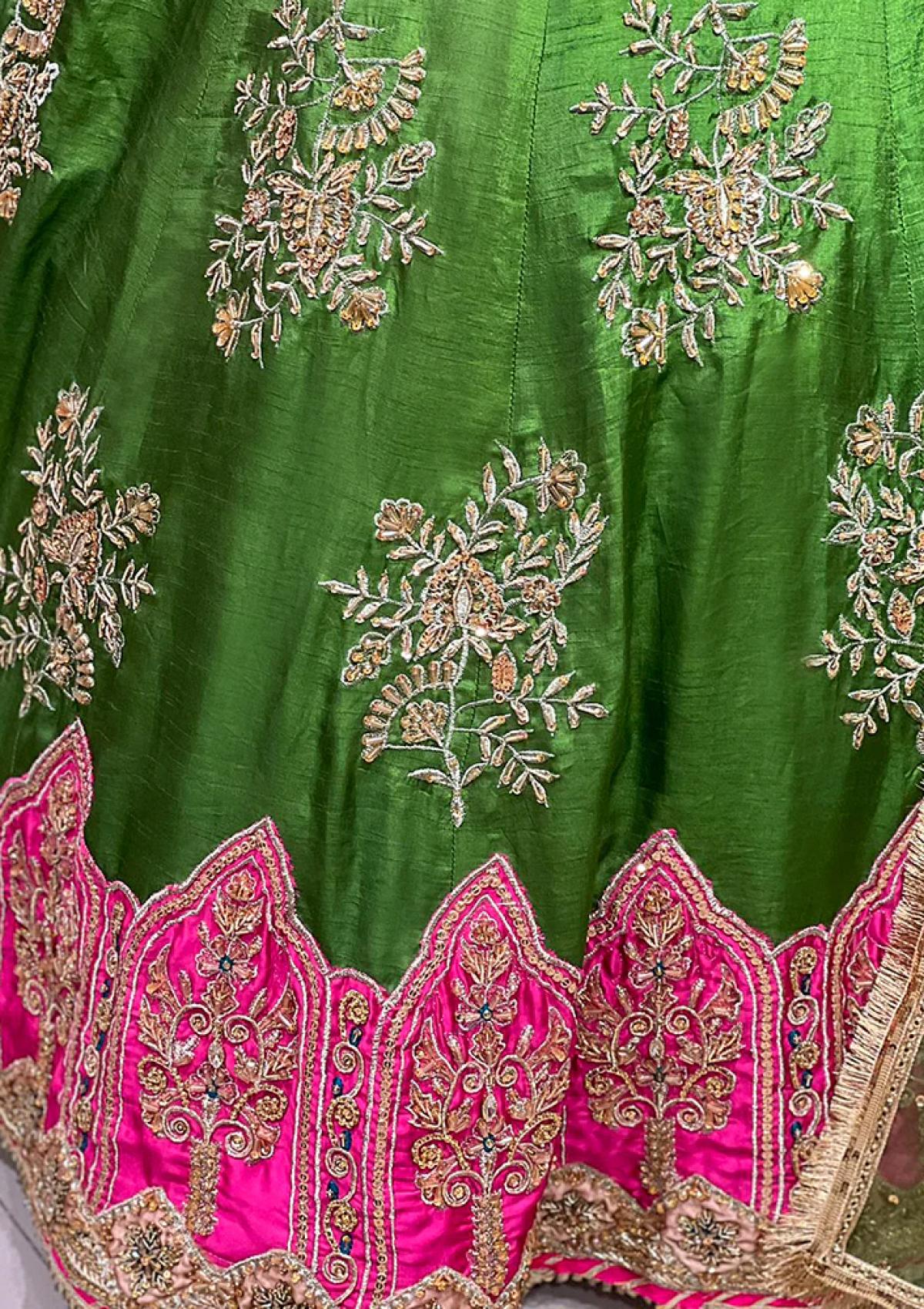 This dazzling ceremonial attire epitomizes beauty and majesty. Our canary yellow lehenga choli is heavily embellished with intricate detailing of gold embroidery and tilla detailing, exuding euphoria and joy.