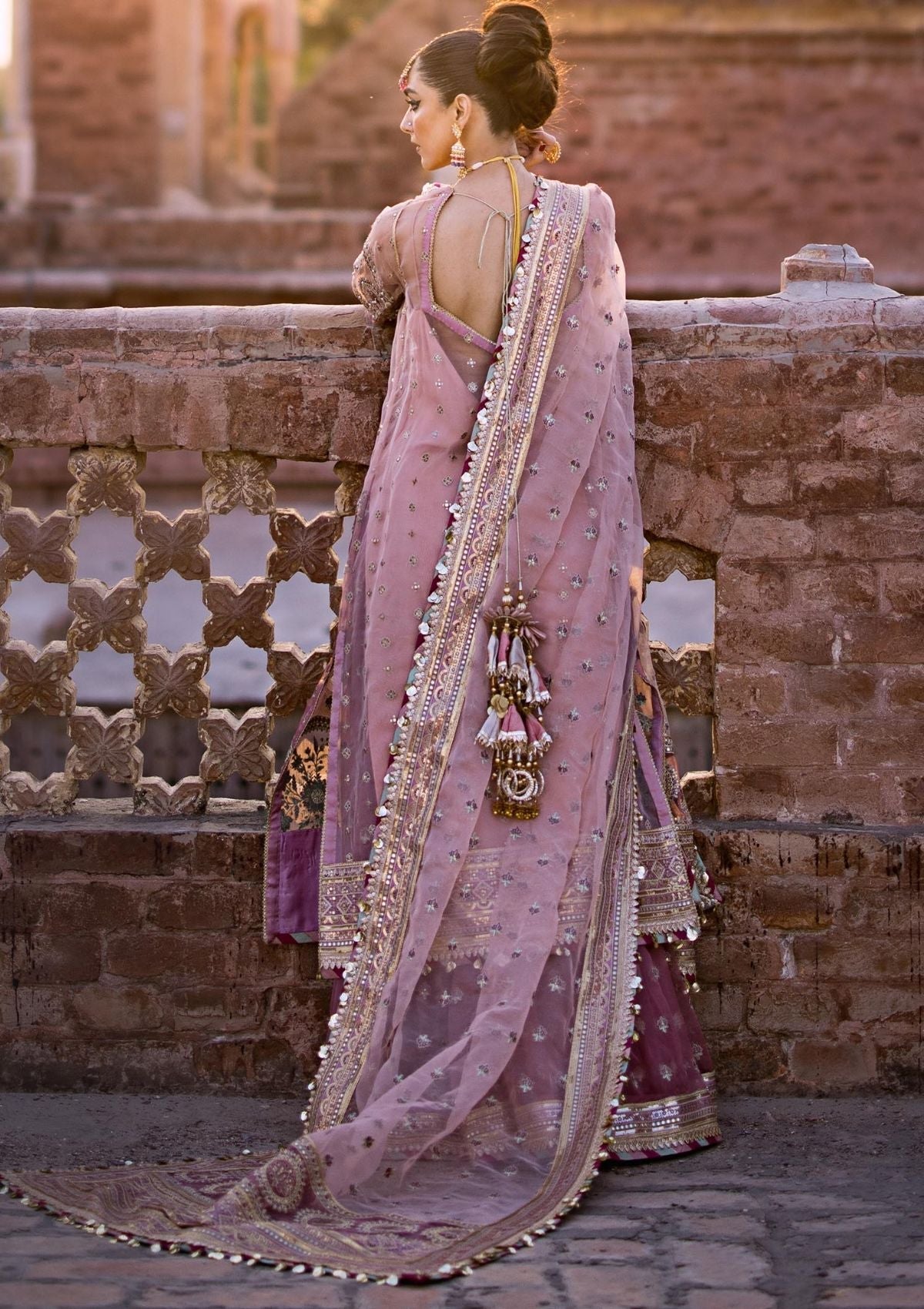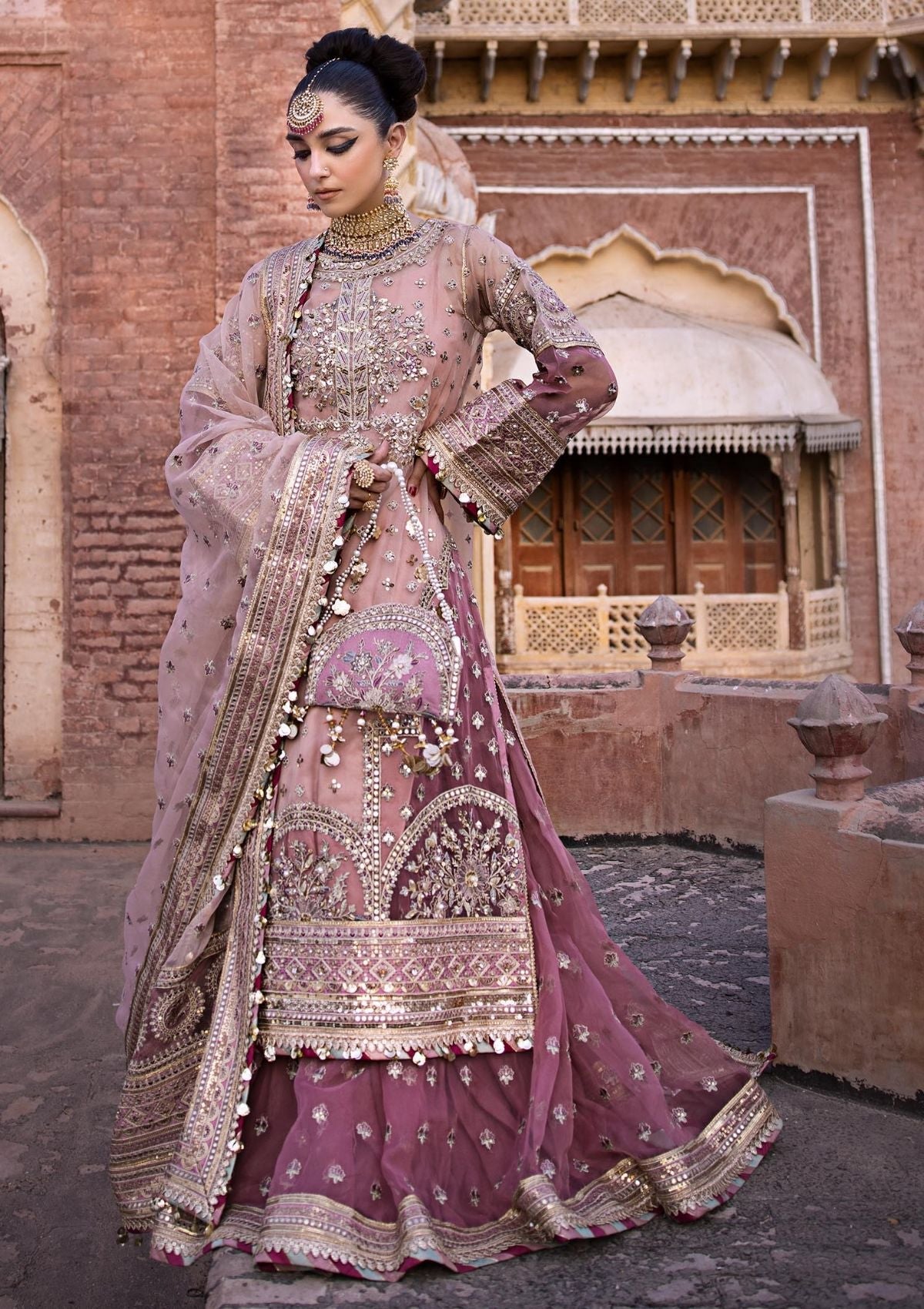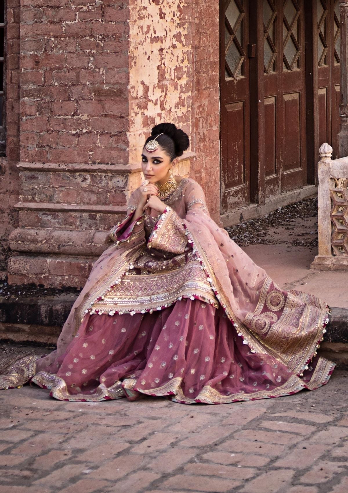 'Aarzoo' ensemble in the enchanting shade of Rose Milk Pink. This ethereal creation features an organza embroidered-embellished shirt with a dark pink hem patch, accentuated by an embroidered-embellished satin silk hem border adorned with twin sequins. The sleeves are a work of art in themselves, showcasing two different organza patches and satin silk border, beautifully embroidered and embellished. The ensemble is elegantly completed with an organza dupatta, featuring two distinct pallus âÃÂàone in darker pink organza and the other adorned with intricate embroidery on satin silk, along with an alluring four-sided border. The matching gharara, designed in organza with a satin silk finishing border, adds a touch of sophistication and grace to this breathtaking 'Arezoo' ensemble. A perfect choice for brides seeking timeless beauty and sheer elegance.