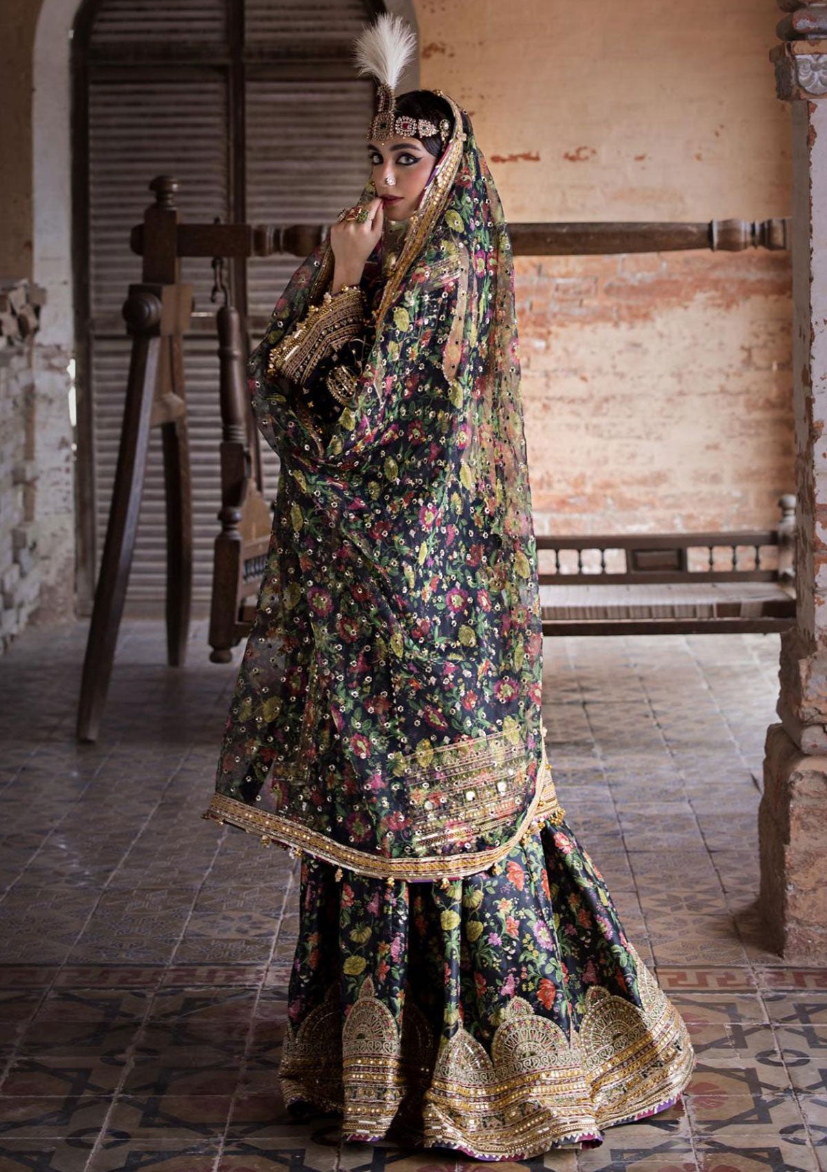 Step into the world of 'Koyal,' an ensemble as captivating as a melodious bird's song, in a stunning kohl-hued color. The silk embroidered shirt is a masterpiece of craftsmanship, featuring hand-embellished ada-work, delicate sequin work, and enchanting card mirror work, elegantly contrasted by satin silk borders.The ensemble is beautifully completed with a silk gharara boasting a floral print and a satin silk embroidered border, adding a touch of whimsical elegance. The printed and embroidered dupatta, with its four-sided satin embroidered border, is the final note in this symphony of style. 'Koyal' is a celebration of grace and artistry, the perfect choice for brides who seek timeless beauty with a touch of the extraordinary.