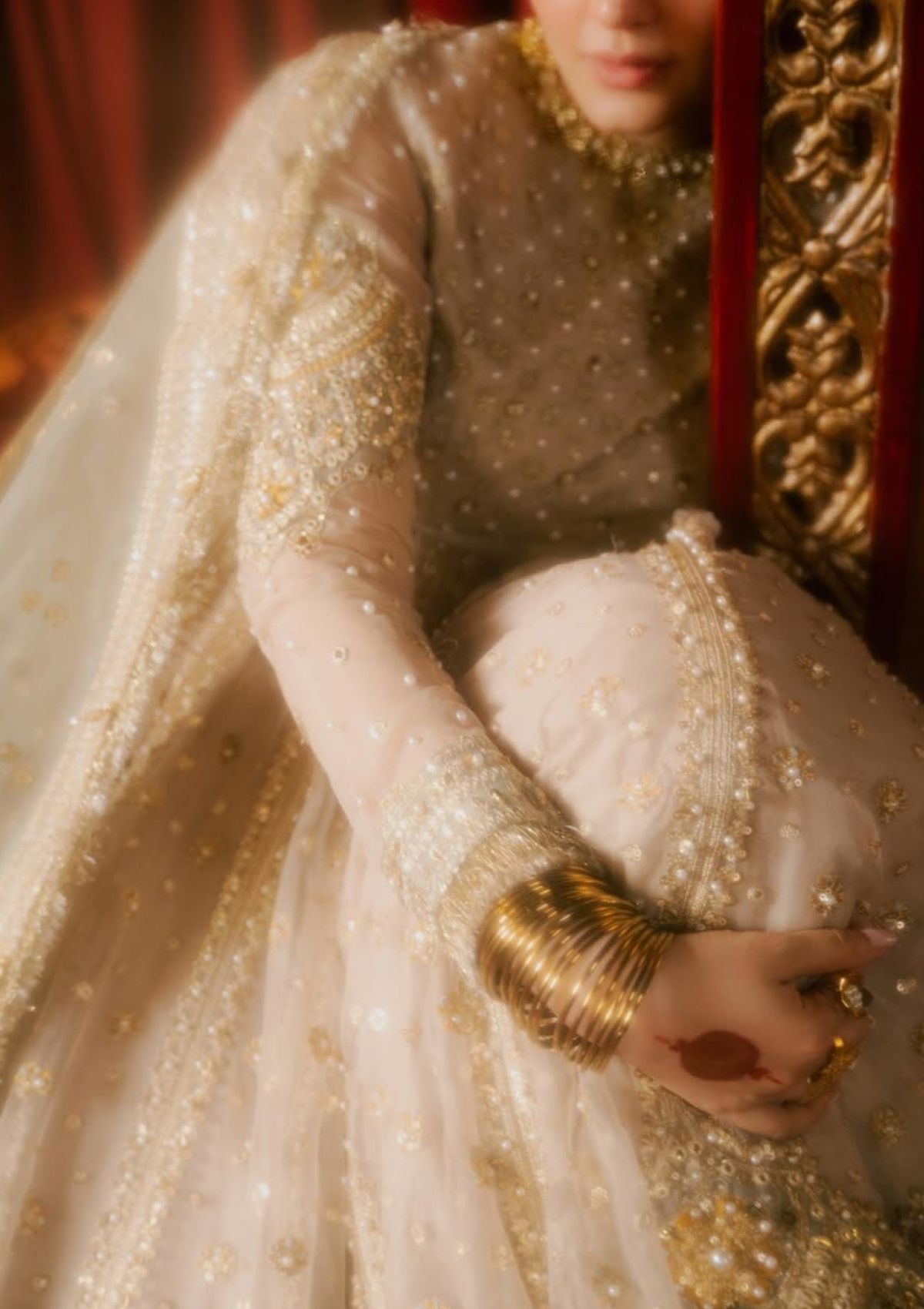 Embrace the ethereal beauty of "Shabnami" from MNR's Dur-e-Nayab 2024 unstitched collection. This soft, light beige pishwas in organza features intricate thread and tilla embroidery, sequin accents, and delicate hand-applied pearls. The striking hem border, adorned with large floral-geometric motifs, adds a graceful flourish to the silhouette. Paired with an Indian silk lehenga with an embroidered border, and a serene blue organza dupatta with a four-sided border and subtle motif spray, "Shabnami" captures the essence of delicate beauty, combining understated elegance with captivating craftsmanship.