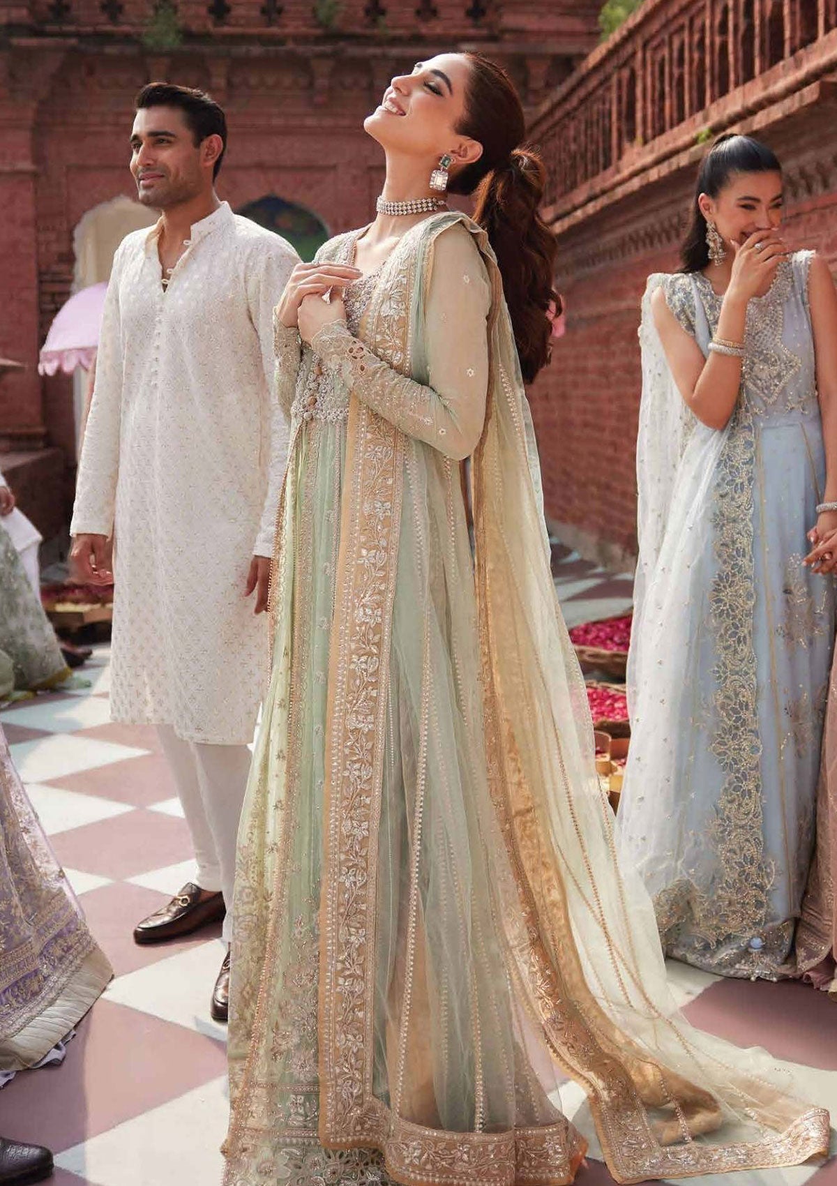 - Our outfit Shahana emerges as a symbol of elegance and grandeur. It is a harmonious fusion of hand embellished and embroidered work details on mint green chiffon pishwas, adorned with delicate embroidered and sequinned borders on the ensemble as well as on the dupatta. Each detail including the golden tilla buttons and laces tells a story of meticulous craftsmanship, redefining luxury with its opulent charm.