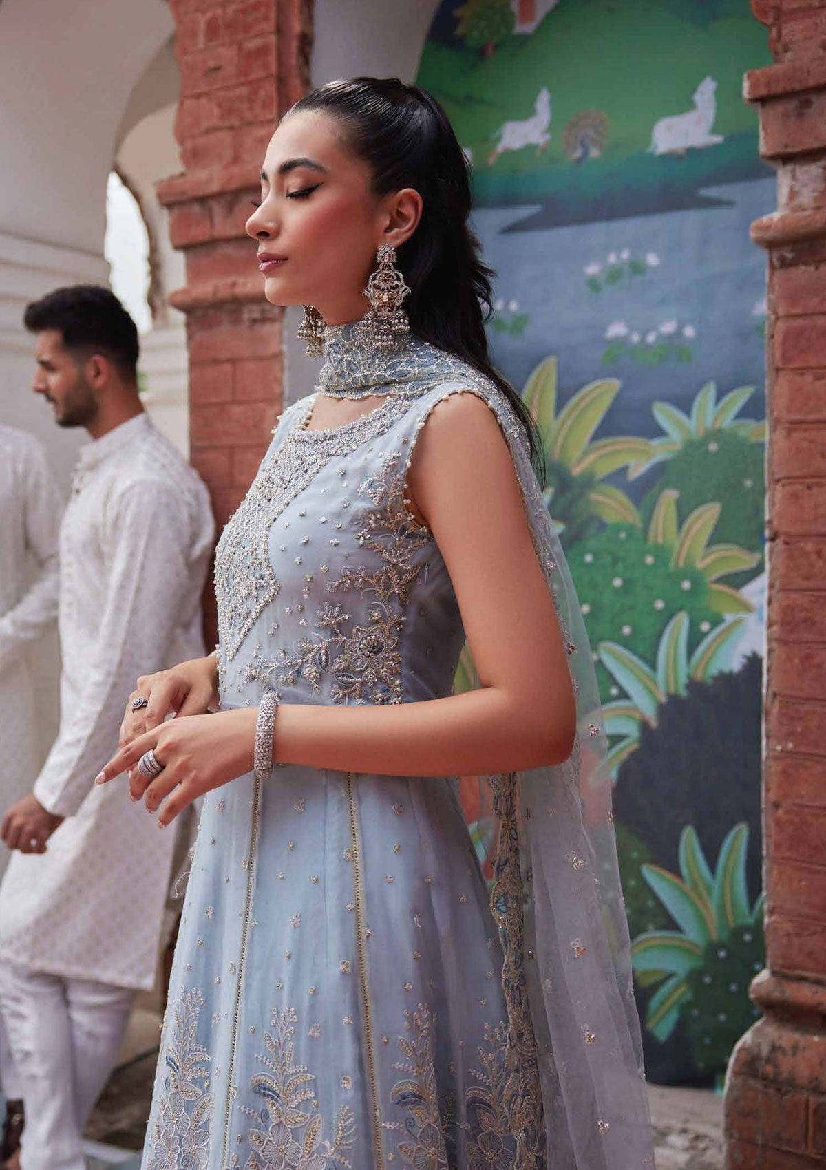 - Tania radiates an atmosphere of enduring enchantment and polished allure. The opulent chiffon fabric rendered in a beautiful shade of ice blue coupled with scalloped embroidered border of the dupatta cascades in graceful folds. The subtle embellishments on the silhouette with a mix of embroidered details including silver tilla buttons and mirror lace for the belt creates a mesmerizing interplay that emanates an entrancing luminosity.