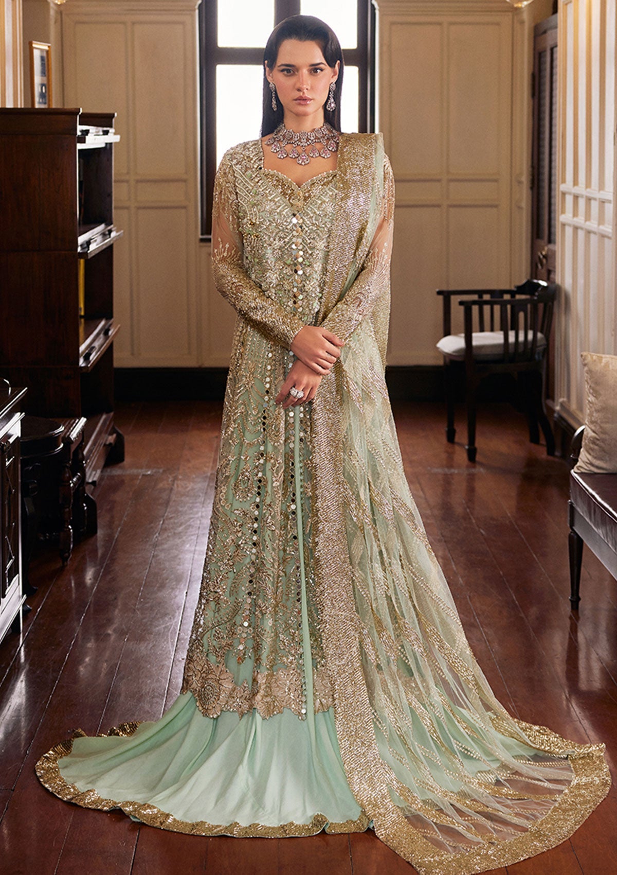 - Embroidered Sequined and hand embellished front yoke (net)