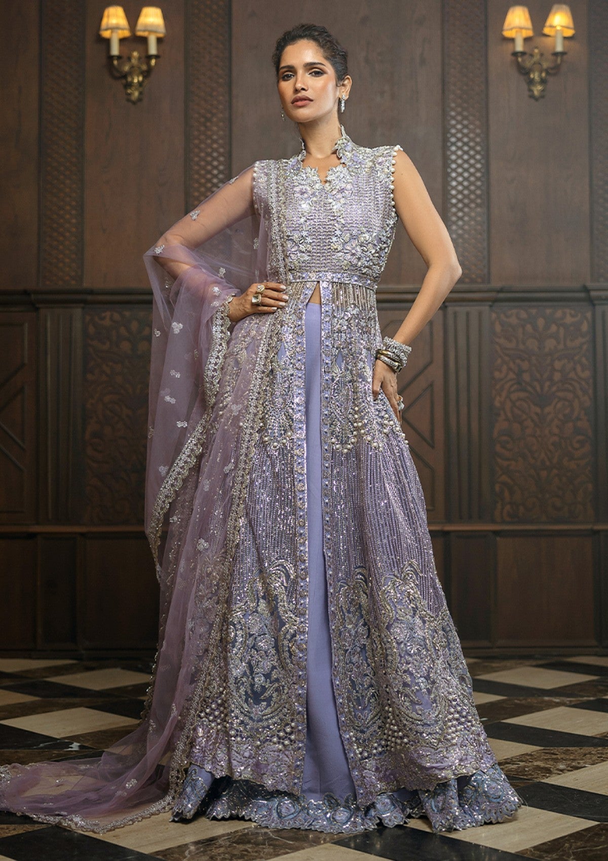 Embrace the allure of classic sophistication with "Celestial Glam". This ensemble features meticulously embroidered panels, shimmering sequins, and a stunning lehenga adorned with intricate borders. The sequined net dupatta adds a touch of c, making it the perfect choice to grace your most cherished wedding festivities.