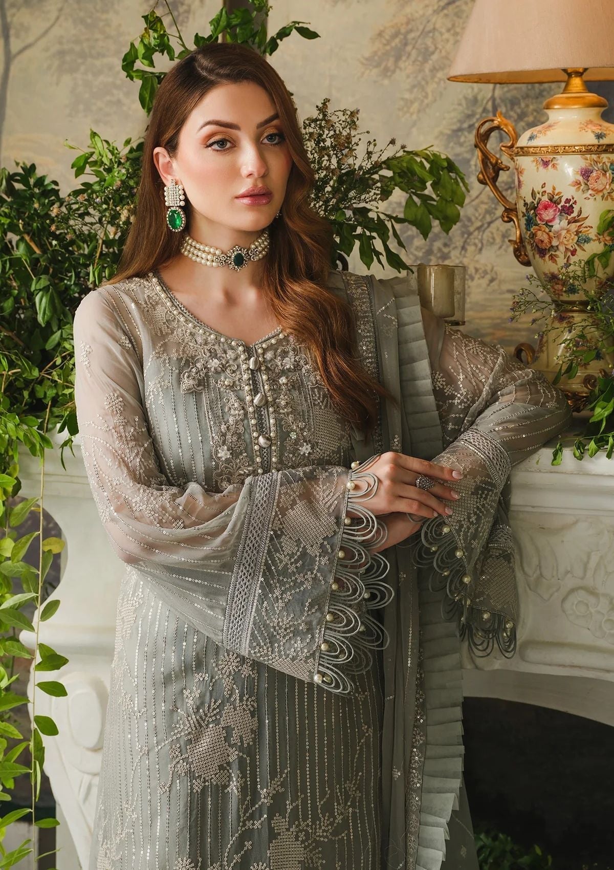 - Embroidered and hand embellished neckline on organza