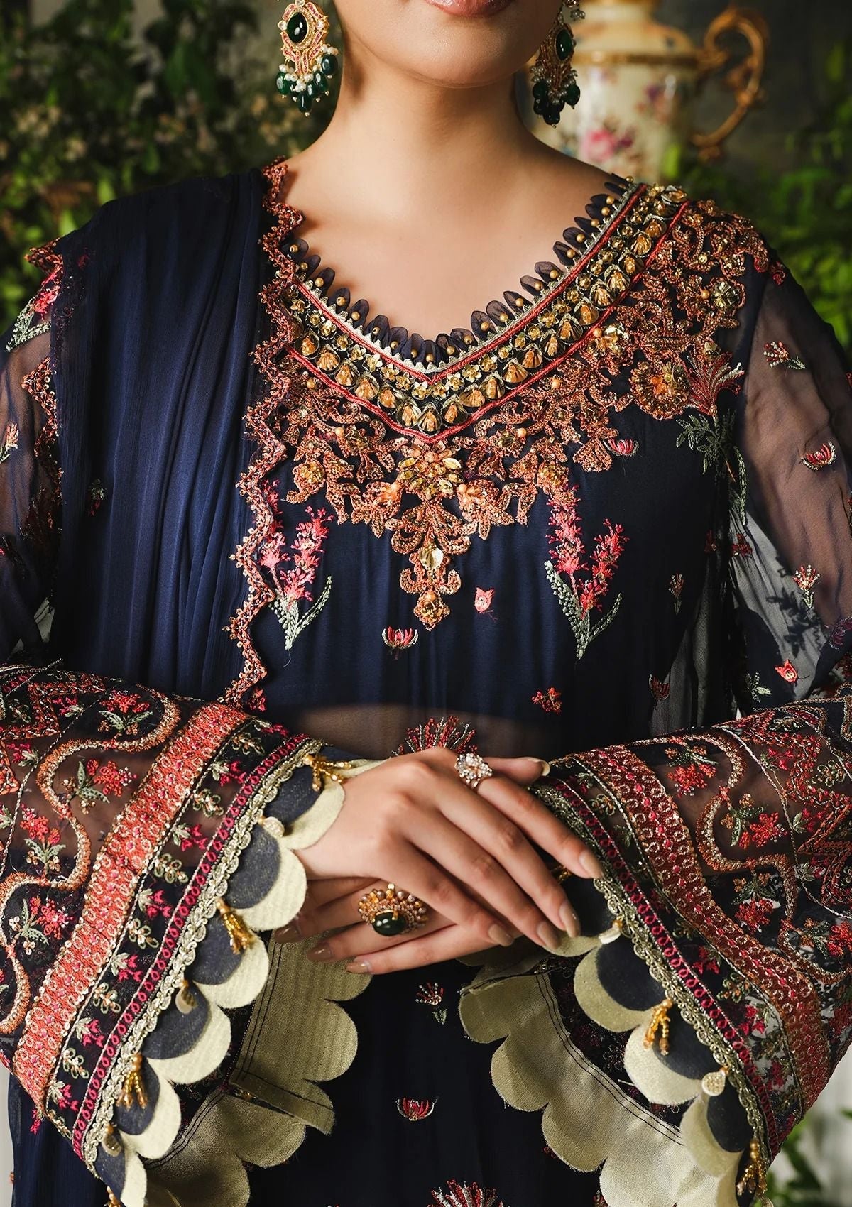 - Embroidered and hand embellished neckline on organza