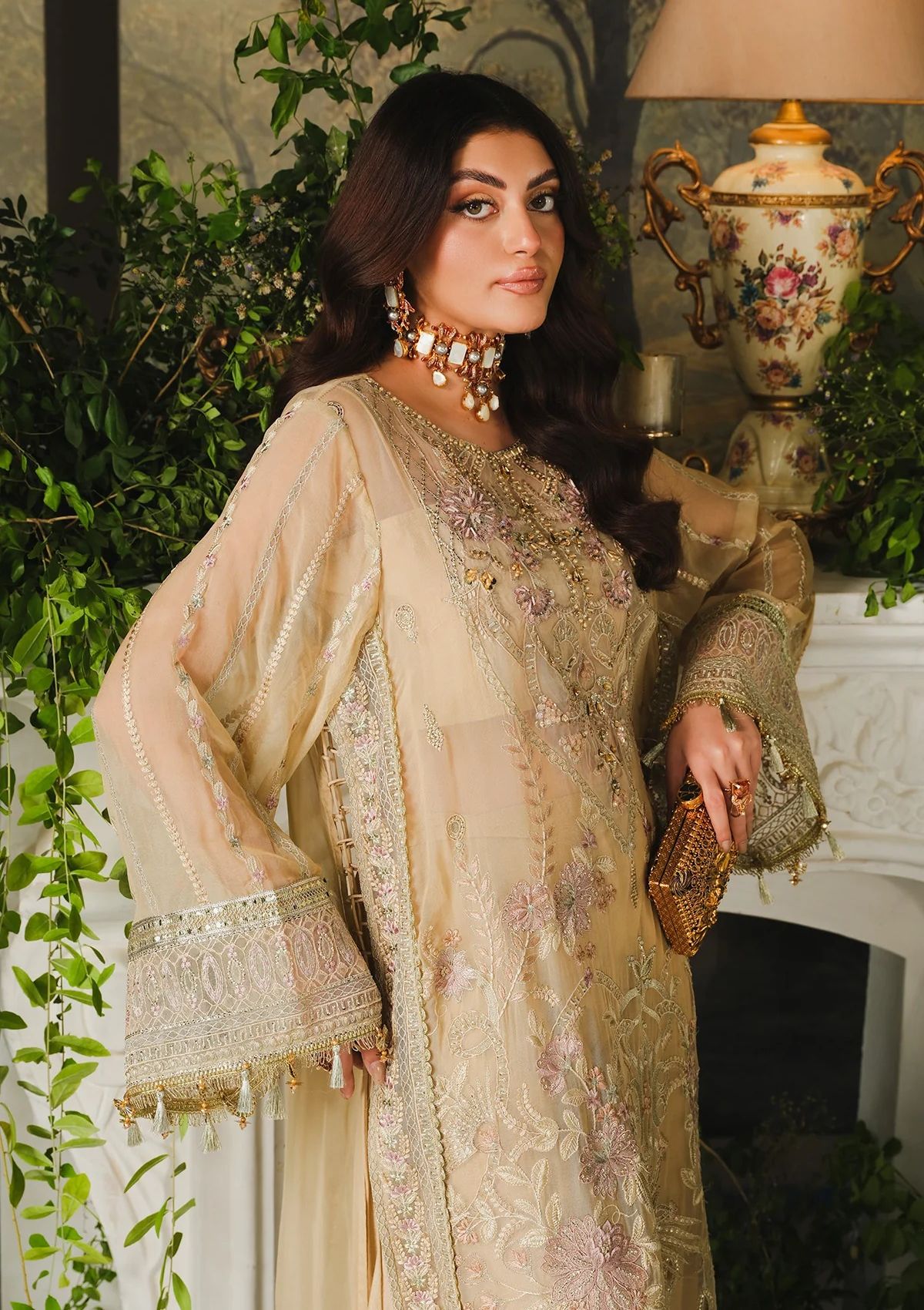 - Embroidered and hand embellished neckline on organza