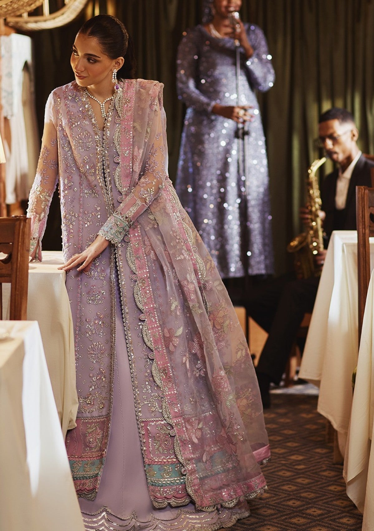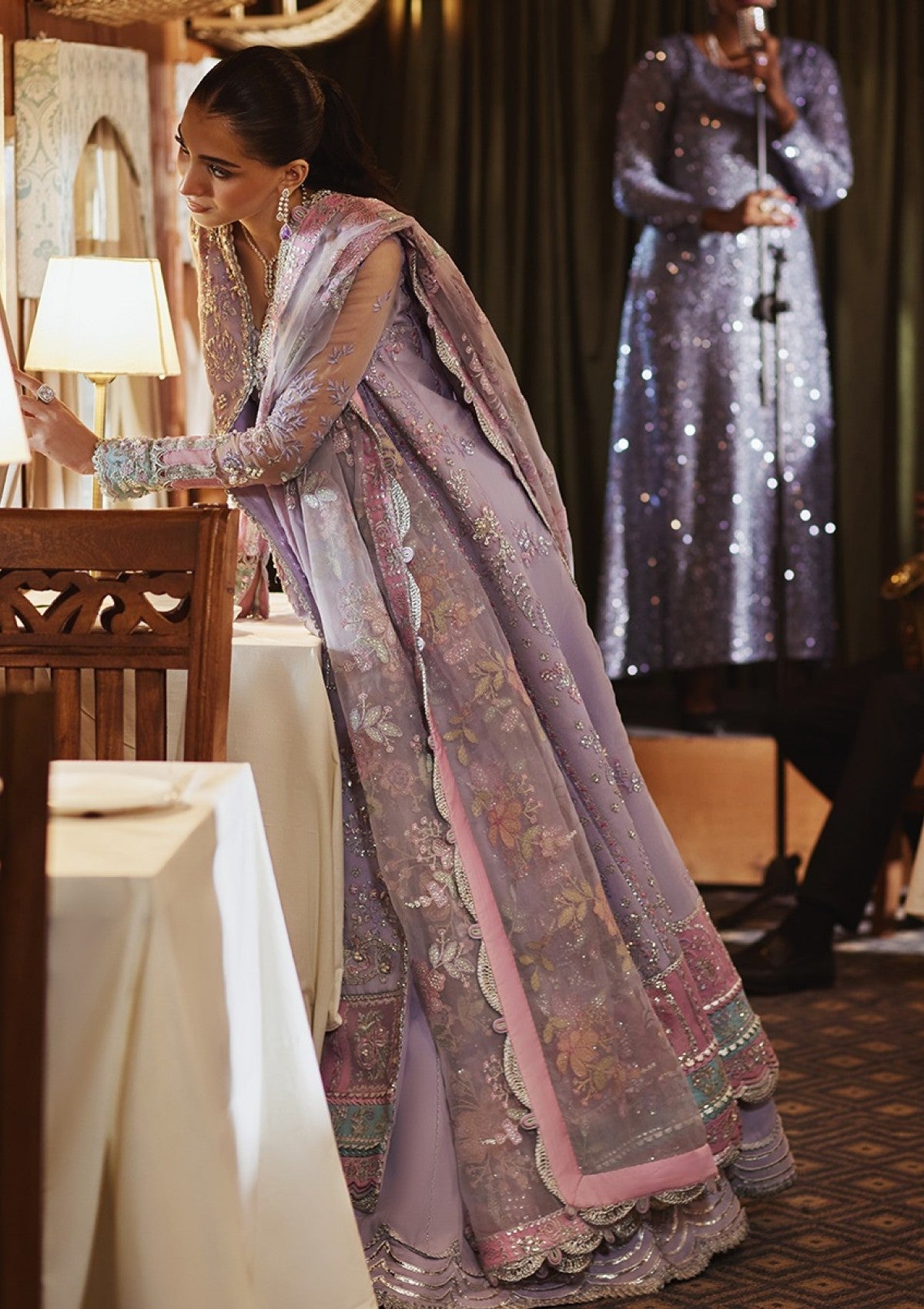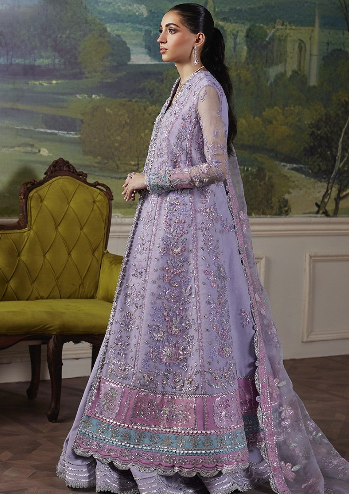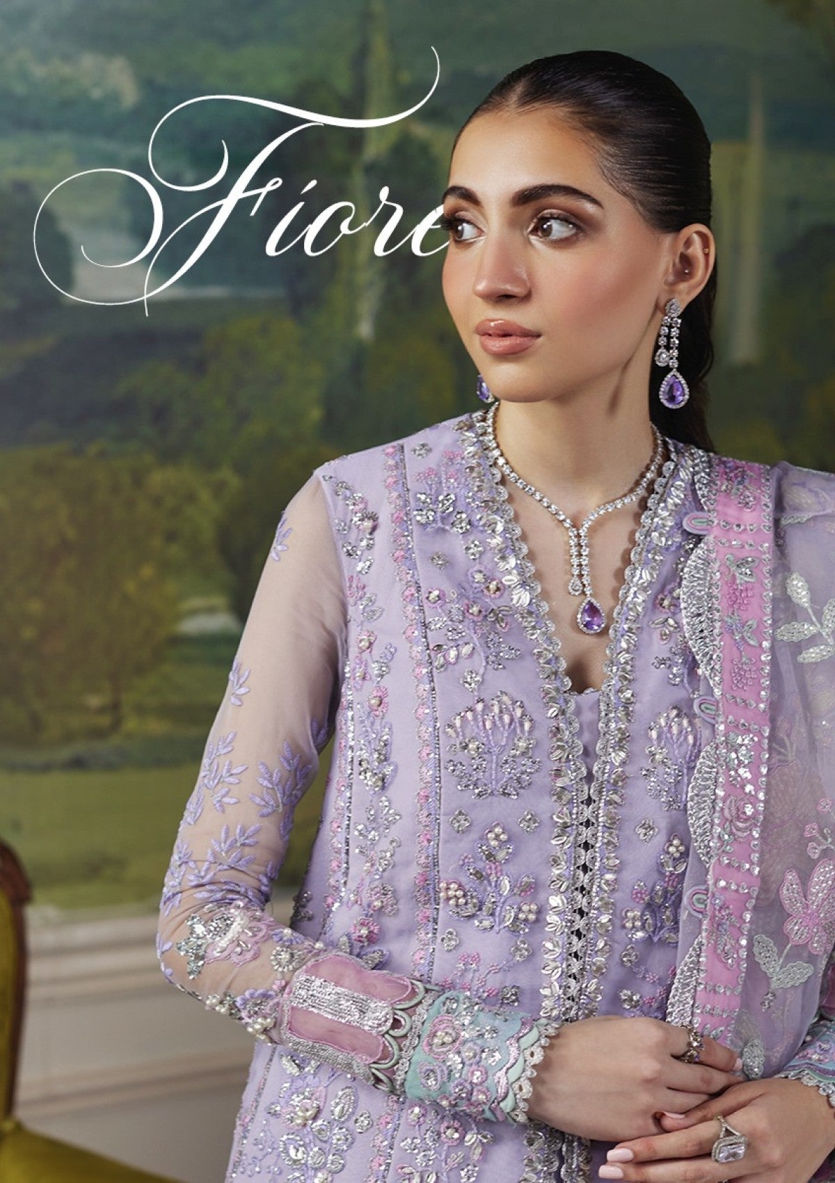 - Fiore' Timeless charm meets modern flair in this lilac paneled flare shirt. Delicate pink and lilac hues dance across the soft lilac base, adorned with intricate silver embroidery and hand-embellished details. A pop of aqua at the hem adds a fresh twist, while the organza dupatta's hot pink borders and floral motifs complete the look. With its captivating blend of elegance and modern panache, this ensemble is a harmonious balance of classic charm and contemporary chic.