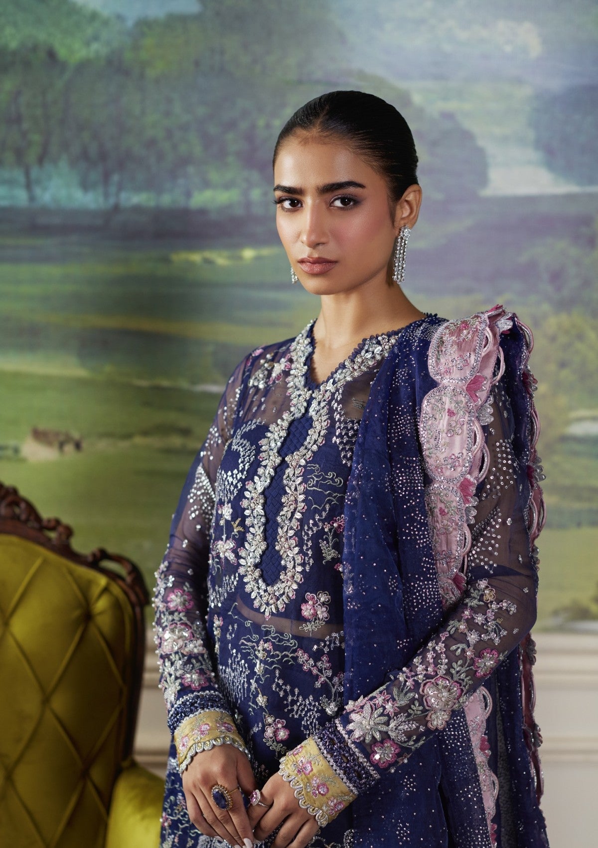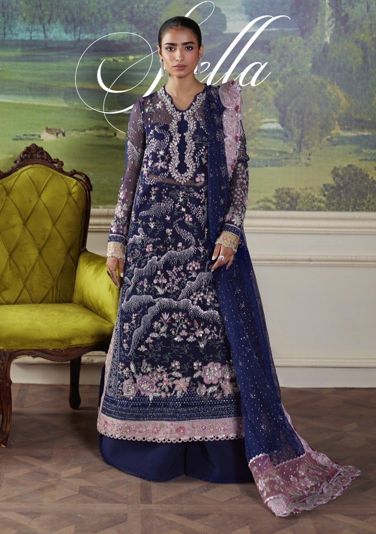 - Stella dazzles in a majestic navy blue hue, adorned with intricate sequins waves that sparkle with every movement. A soft pink satin hem border adds a touch of vibrancy. The dupatta features embroidery in soft pink, coral, and lime shades, elegantly complemented by sparkling diamantes spray for added opulence, addition to it is a satin four sides border that make it culminating in a look that exudes timeless elegance and make it.