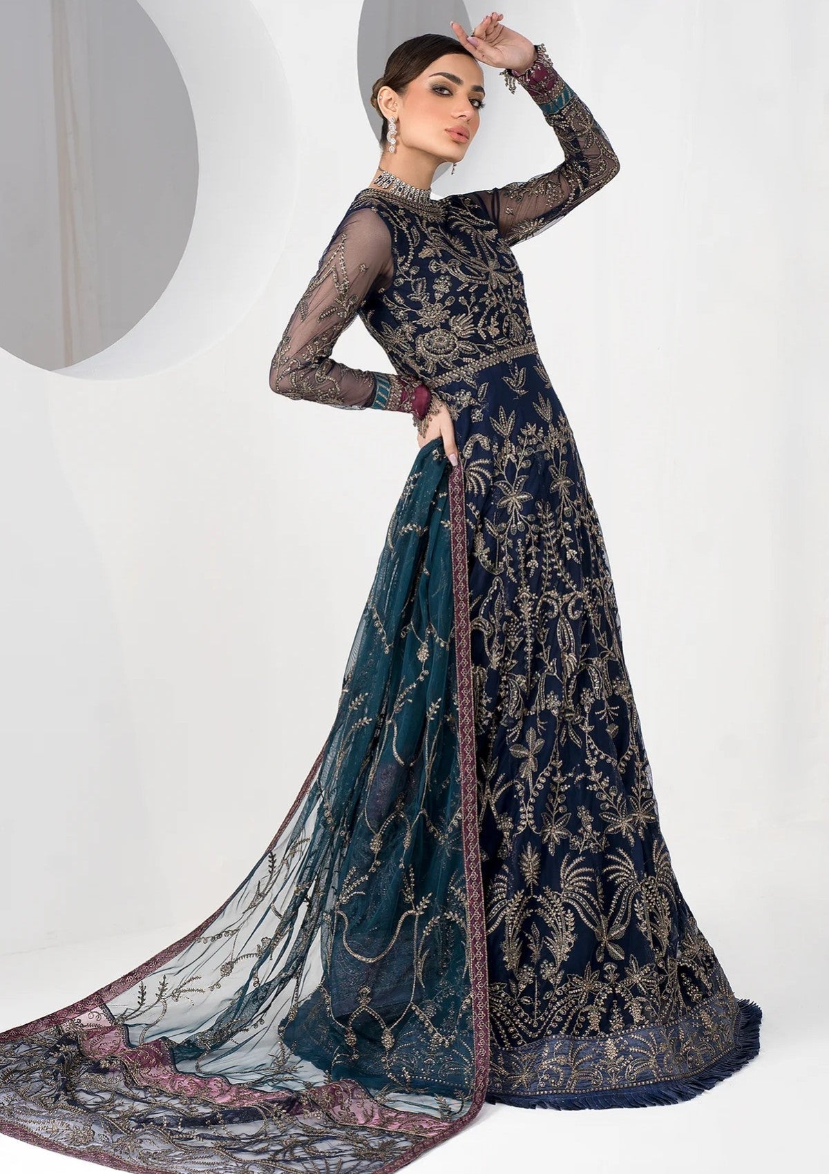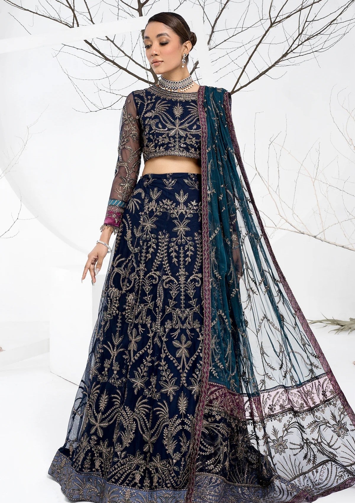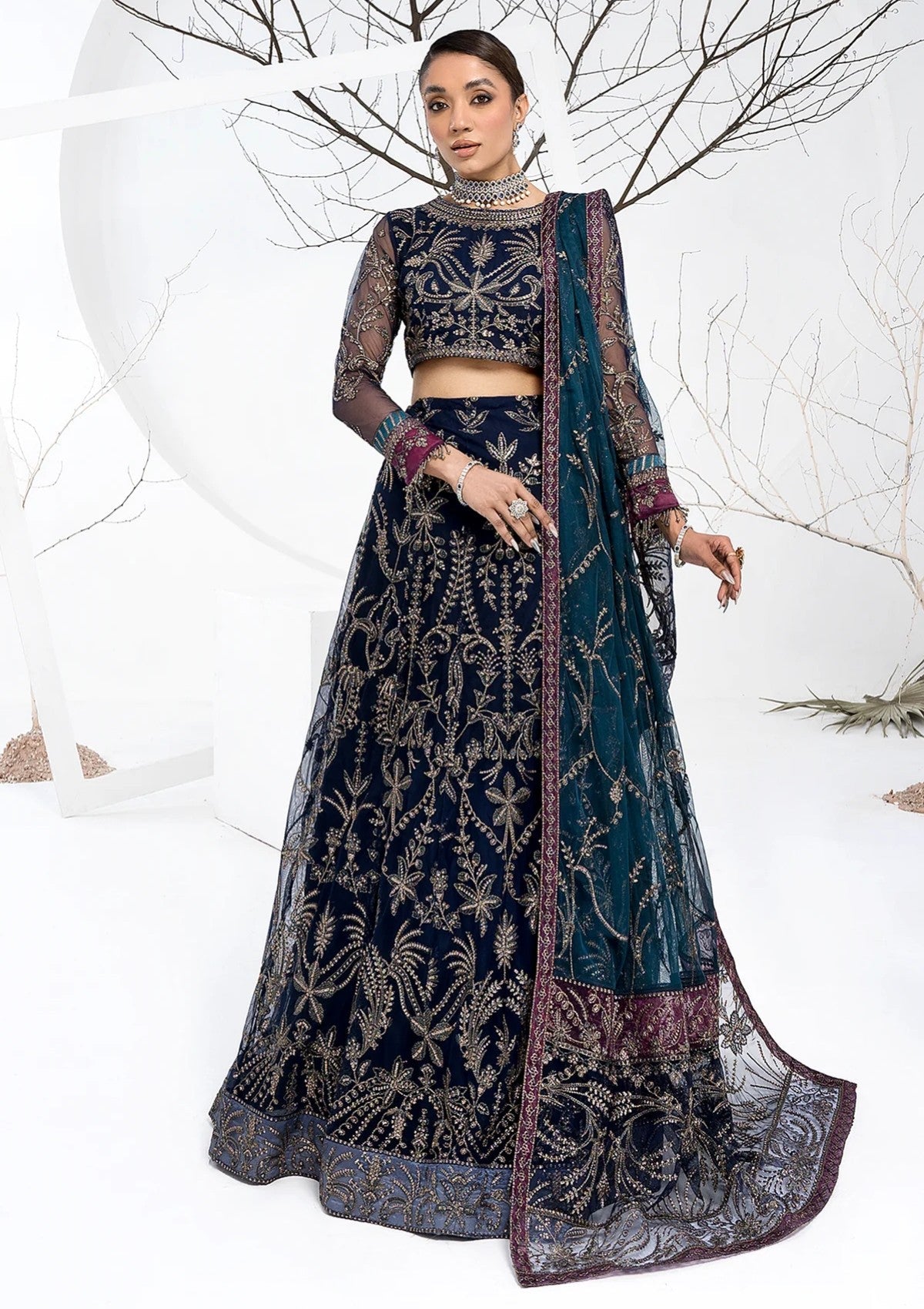 Exuding lushness at embroidery and crafted on a bold navy blue base, this artistic design is a beauty to adore. Paired with a dupatta with contrasting patches it is given an aura of royalty.