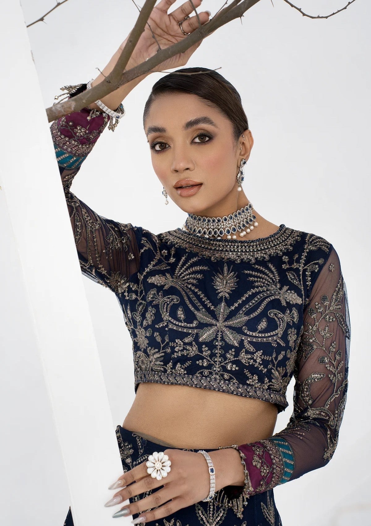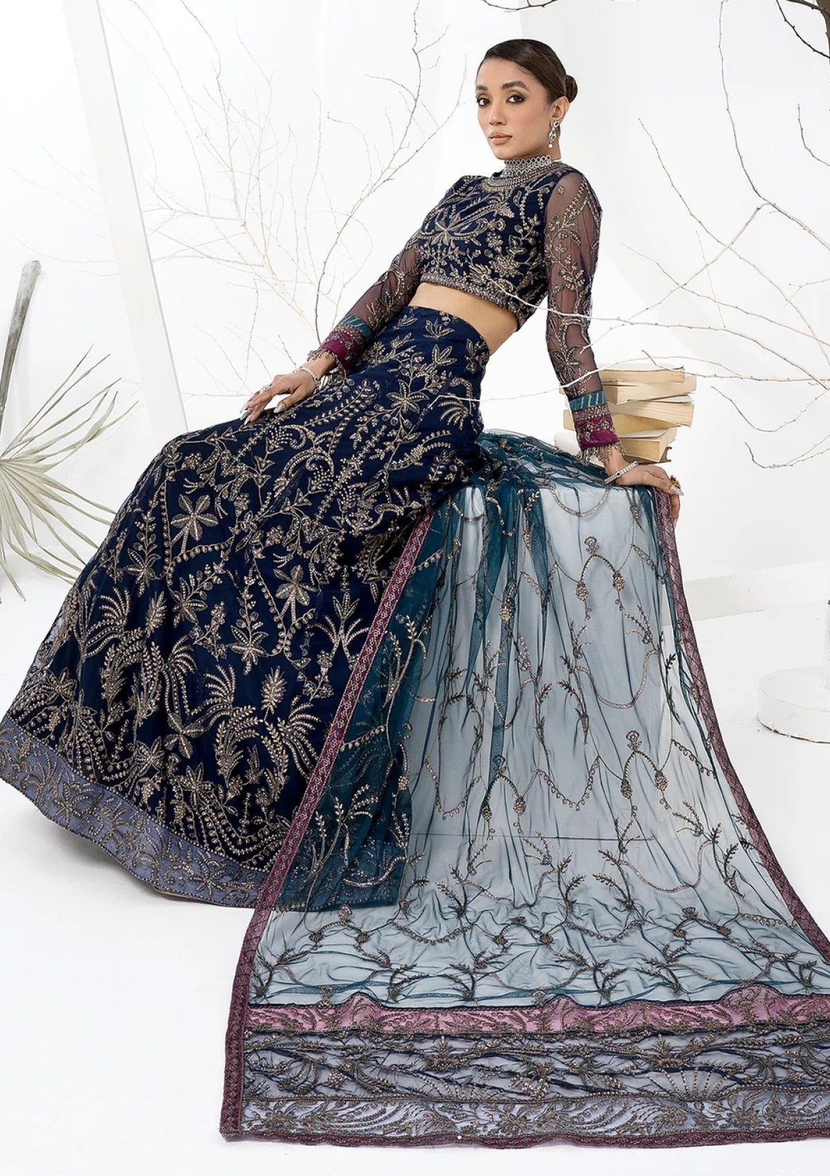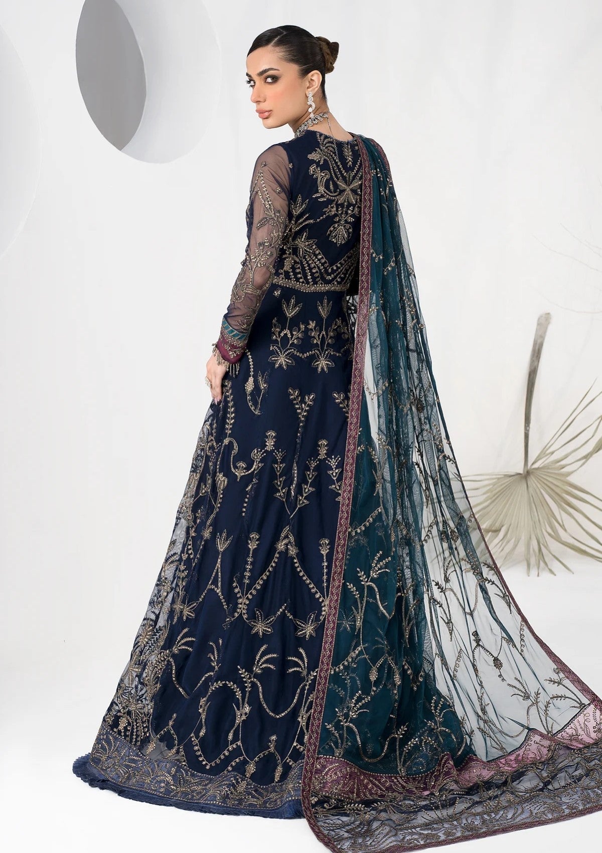 Exuding lushness at embroidery and crafted on a bold navy blue base, this artistic design is a beauty to adore. Paired with a dupatta with contrasting patches it is given an aura of royalty.