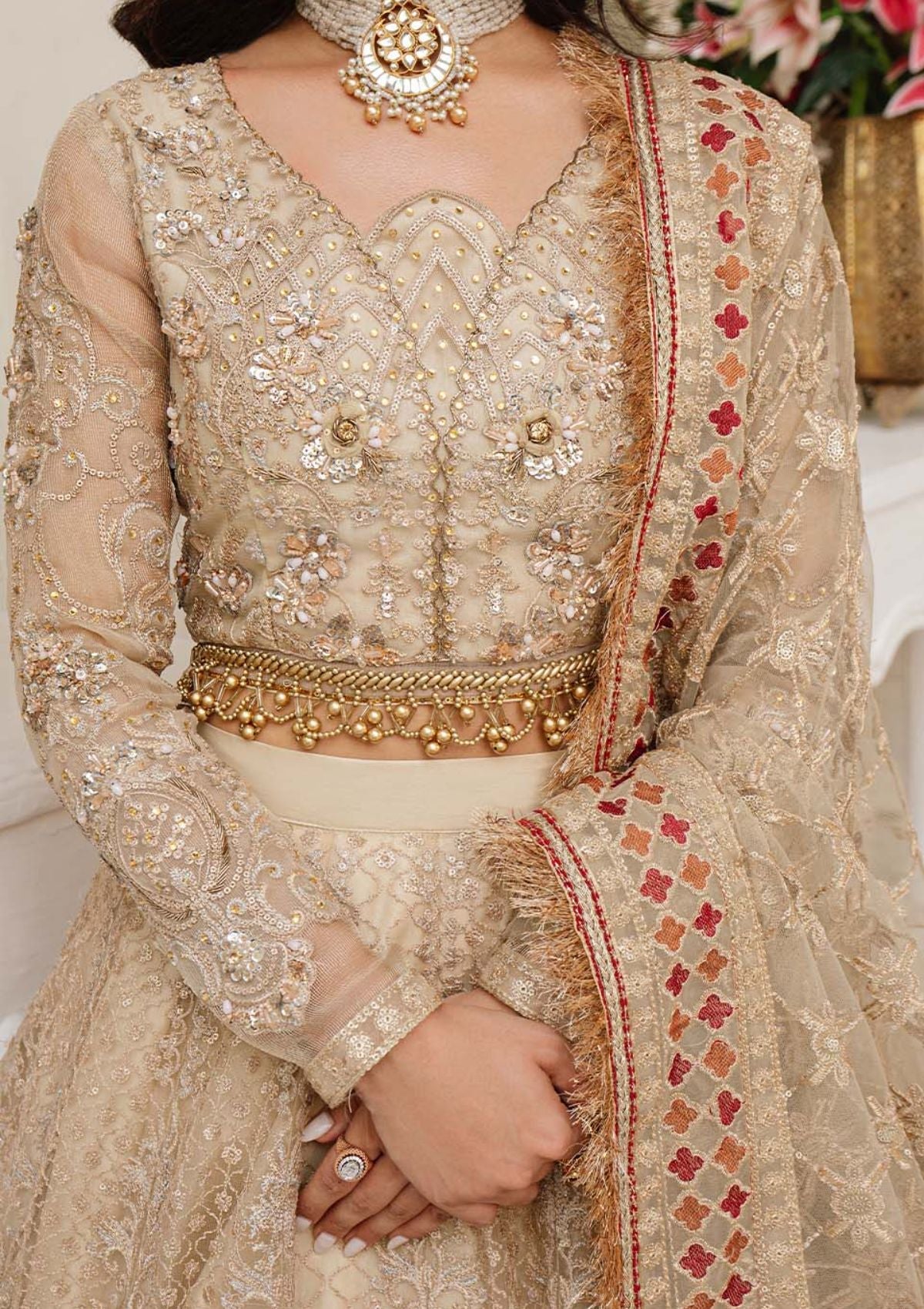 A magical ethereal gold âÃÂÃÂDEYA' is intricately embroidered and delicately embellished with mÃÂélange of shimmering gold sequins, pearls dabka and sparkling stones.14 exquisitely embroidered panels comes together to create a spectacular heritage lehnga with a fully composed bodice, bustier and worked sleeves. A diaphanous elaborately embroidered dupatta is framed with intricately embroidered borders inspired by the grandeur of Eastern royal regalia, this dress is an instant classic with its timeless appeal.Disclaimer: The color of the outfit may vary due to the lighting effect used in the photography.