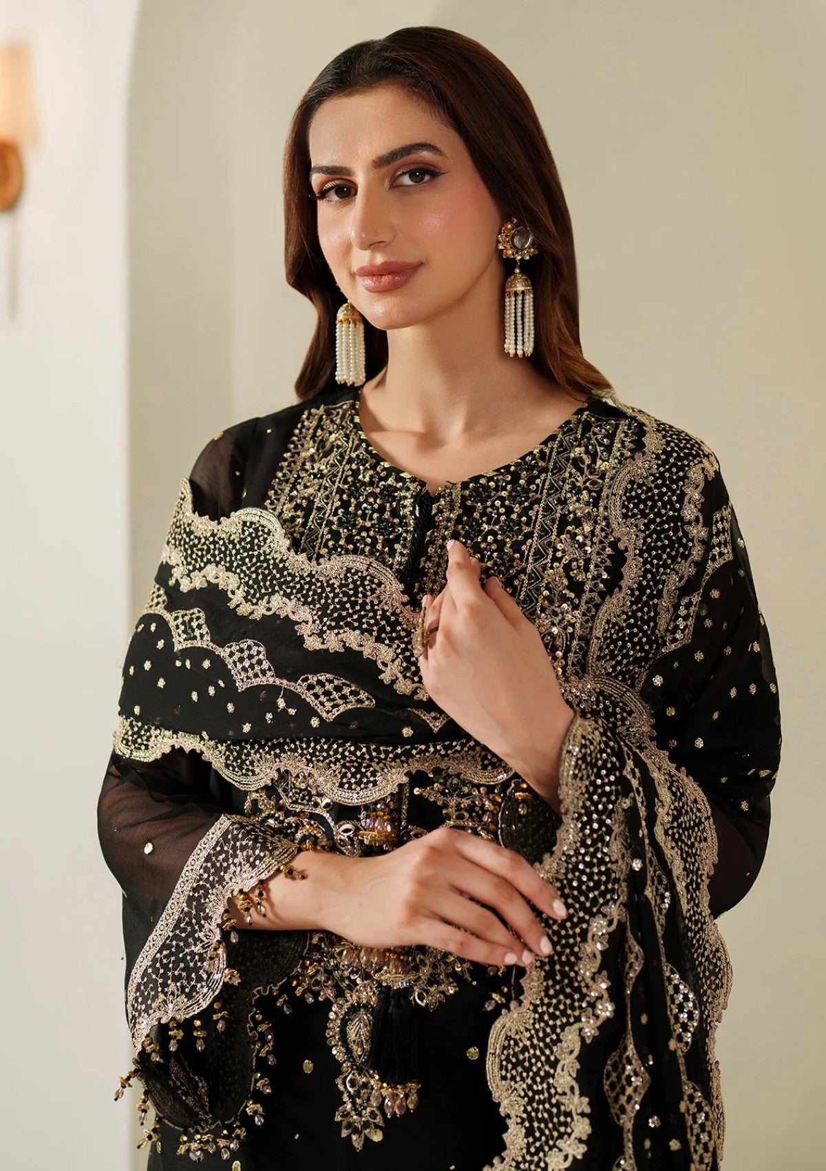 Classic black ensemble celebrates handmade craftsmanship with a front adorned in Mukesh work and gold thread embroidery. The neckline features a richly embroidered organza patch, showcasing geometric patterns with gold zari, sequins, and beadwork. The sleeves are embellished with scattered Mukesh detailing and finished with scalloped cuffs, tassels, and beadwork. Paired with trousers finished with an elegant embroidered border, this ensemble offers a refined silhouette, blending regal tradition with modern elegance