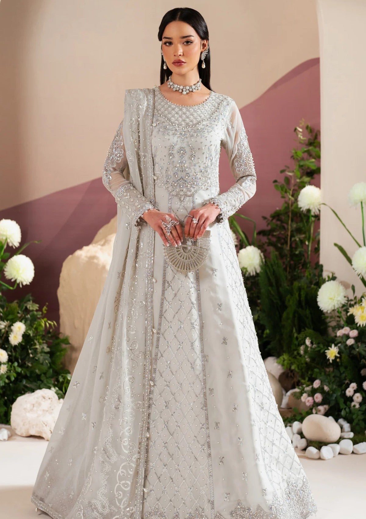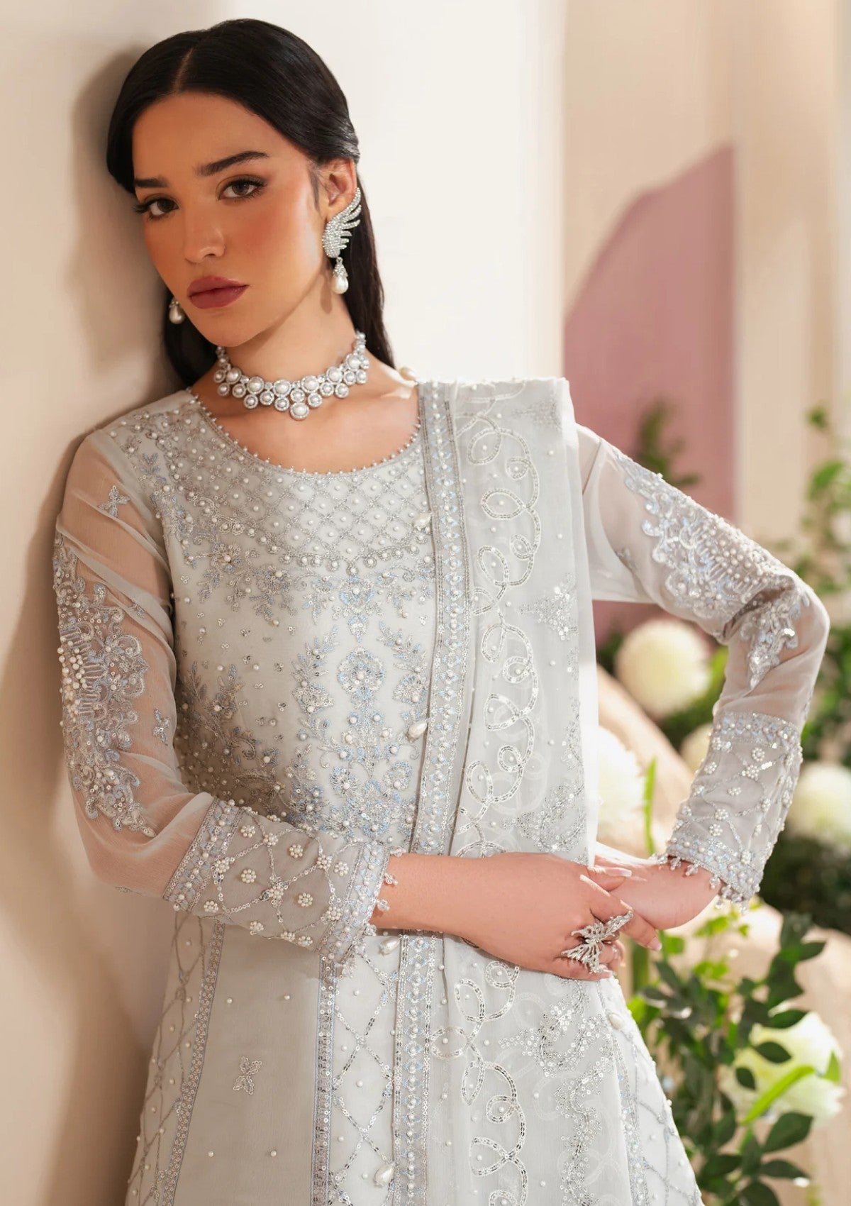 The"Musk"ensemble in white is a true masterpiece, crafted from luxurious chiffon and adorned with intricate embroidery and pearl embellishments on the front, complemented by delicate embroidered motifs. Silver thread detailing and shimmering sequins add a refined touch of elegance. Paired with an embroidered chiffon dupatta and tonal raw silk trousers, this ensemble is the perfect choice for Eid celebrations.