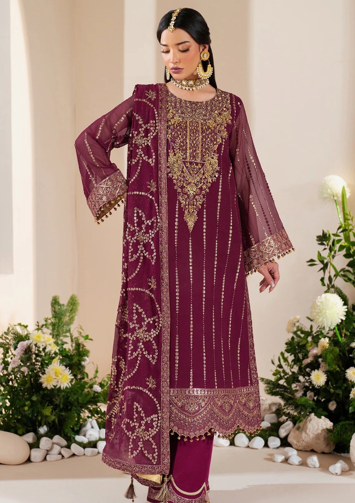 "Dusk"is a stunning fuchsia chiffon ensemble, featuring an intricately hand-embellished neckline with gold embroidery and shimmering details, adding a modern flair. The look is perfectly complemented by an embroidered chiffon dupatta and Russian grip trousers, adorned with delicate floral motifs for a refined finish.