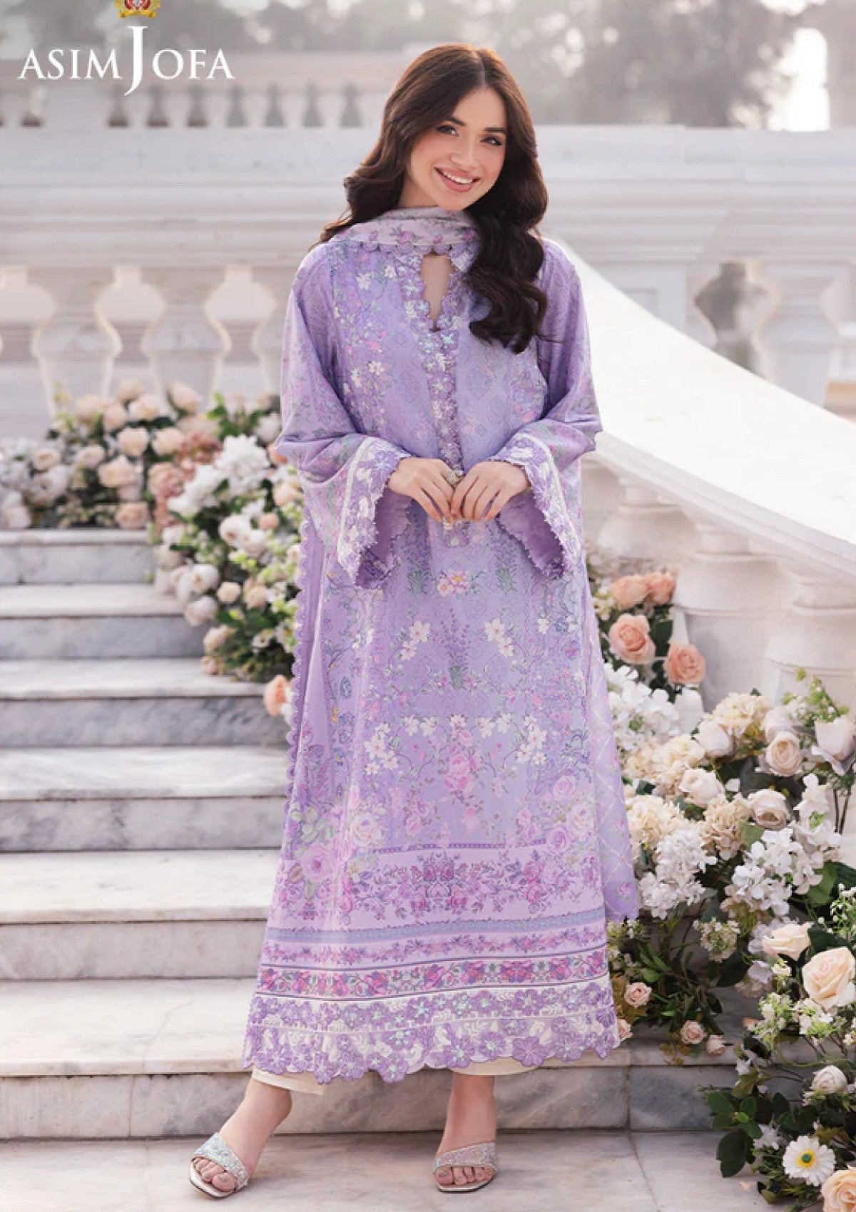 The splendor of the season comes alive in this enchanting light purple ensemble, a canvas of floral artistry reminiscent of a pastel dreamscape. The digitally printed light purple shirt features an embroidered neckline, breathing new life into the floral story, like a garden in full bloom, while the intricately embroidered sleeves and borders weave a tapestry of elegance. Paired with a digitally printed silk dupatta that flows like a whisper of sophistication, this outfit stands as a flawless choice for both formal and casual occasions, exuding timeless charm.