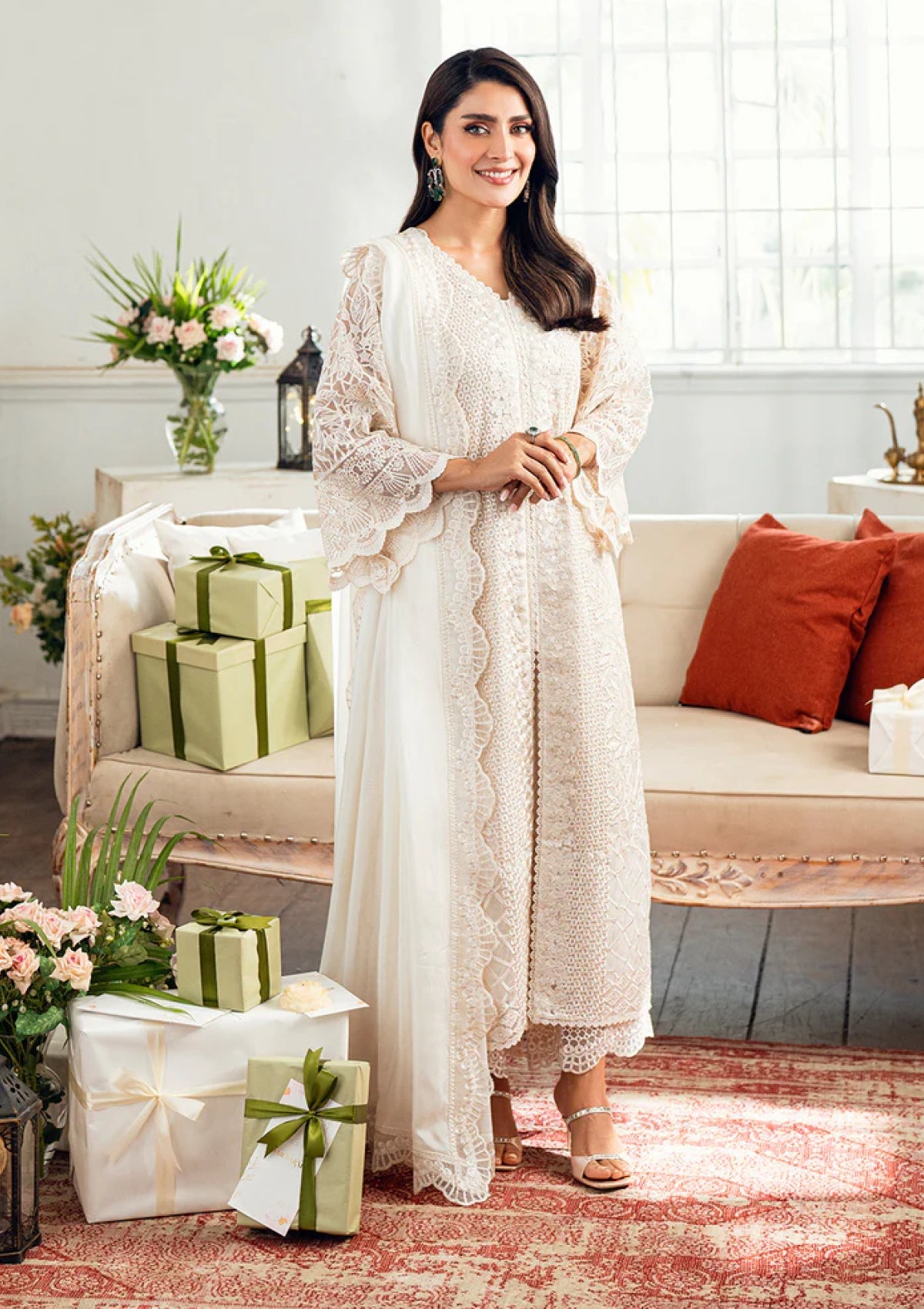 Delicate yet bold, Ethereal Pearl in a soft cream hue is the epitome of understated luxury. Crafted from elegant net fabric, this ensemble is beautifully paired with a dyed viscose silk dupatta, exuding grace with every drape. A true statement of refined festivity.
