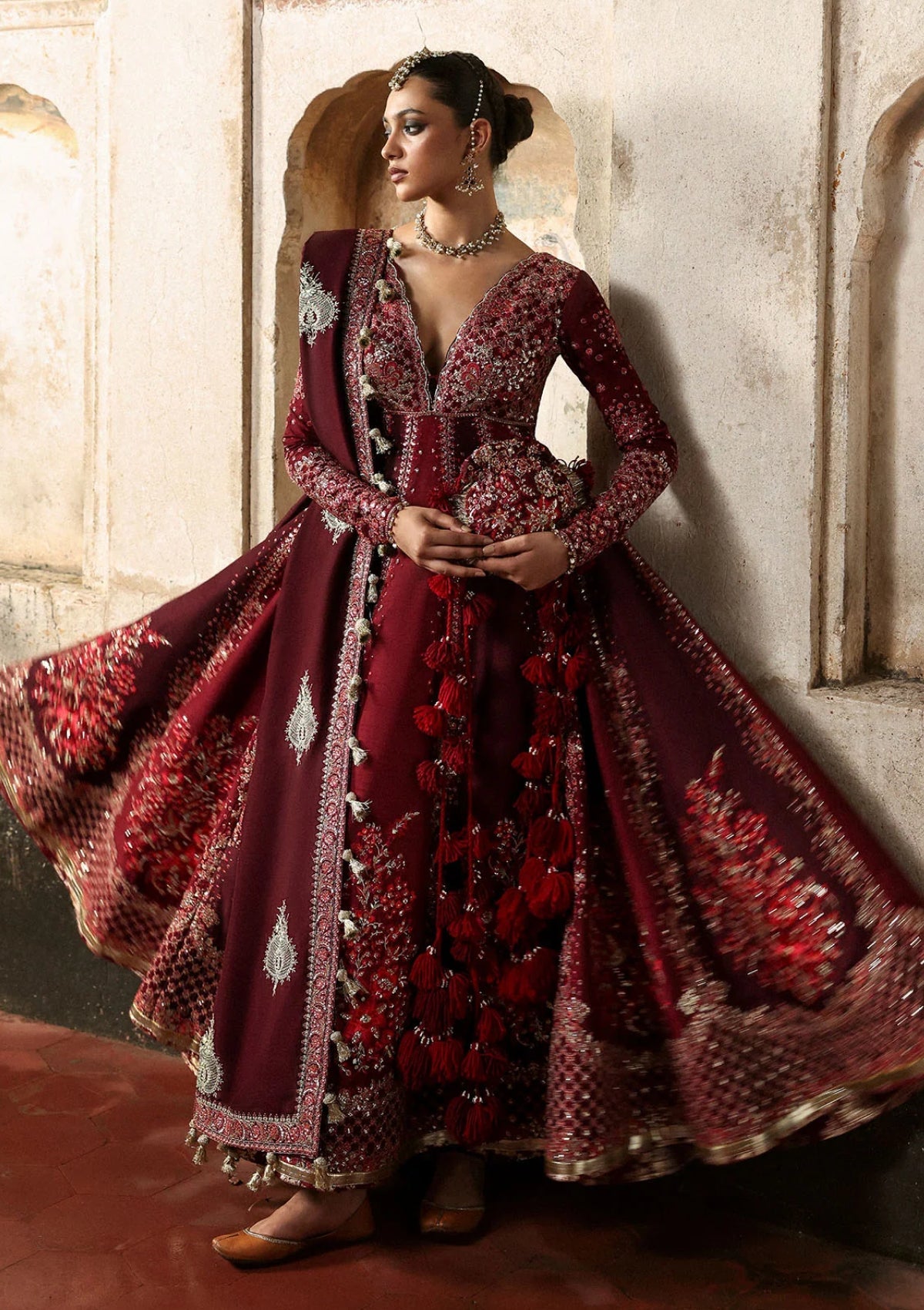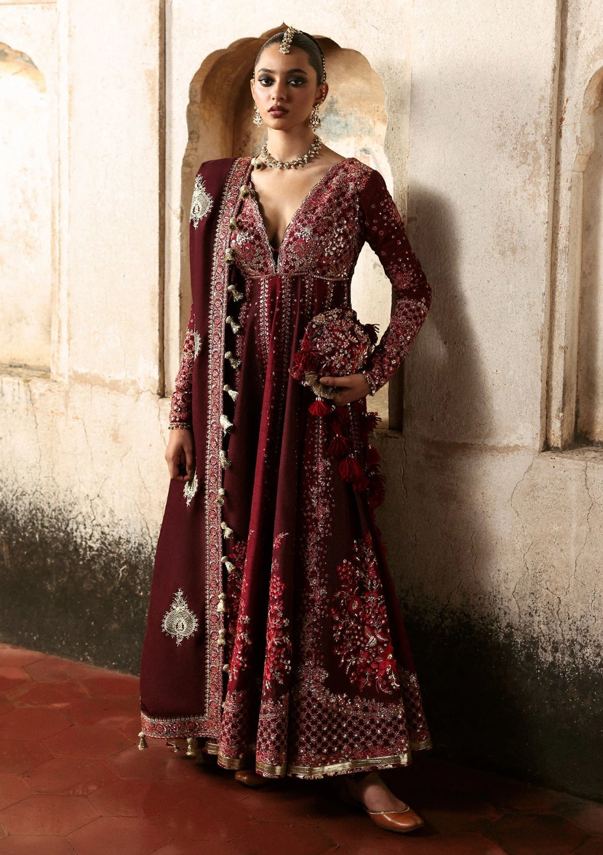 The embroidered burgundy and maroon Korean raw silk pishwas is beautifully crafted with intricate details on the front and back panels, adding richness to the overall look. It is paired with screen printed maroon Korean raw silk churidar that enhances the traditional appeal. The Korean raw silk shawl with tilla embroidered bunches and delicately embroidered borders on all four sides completes the outfit. Together, this ensemble radiates elegance and gives royalty